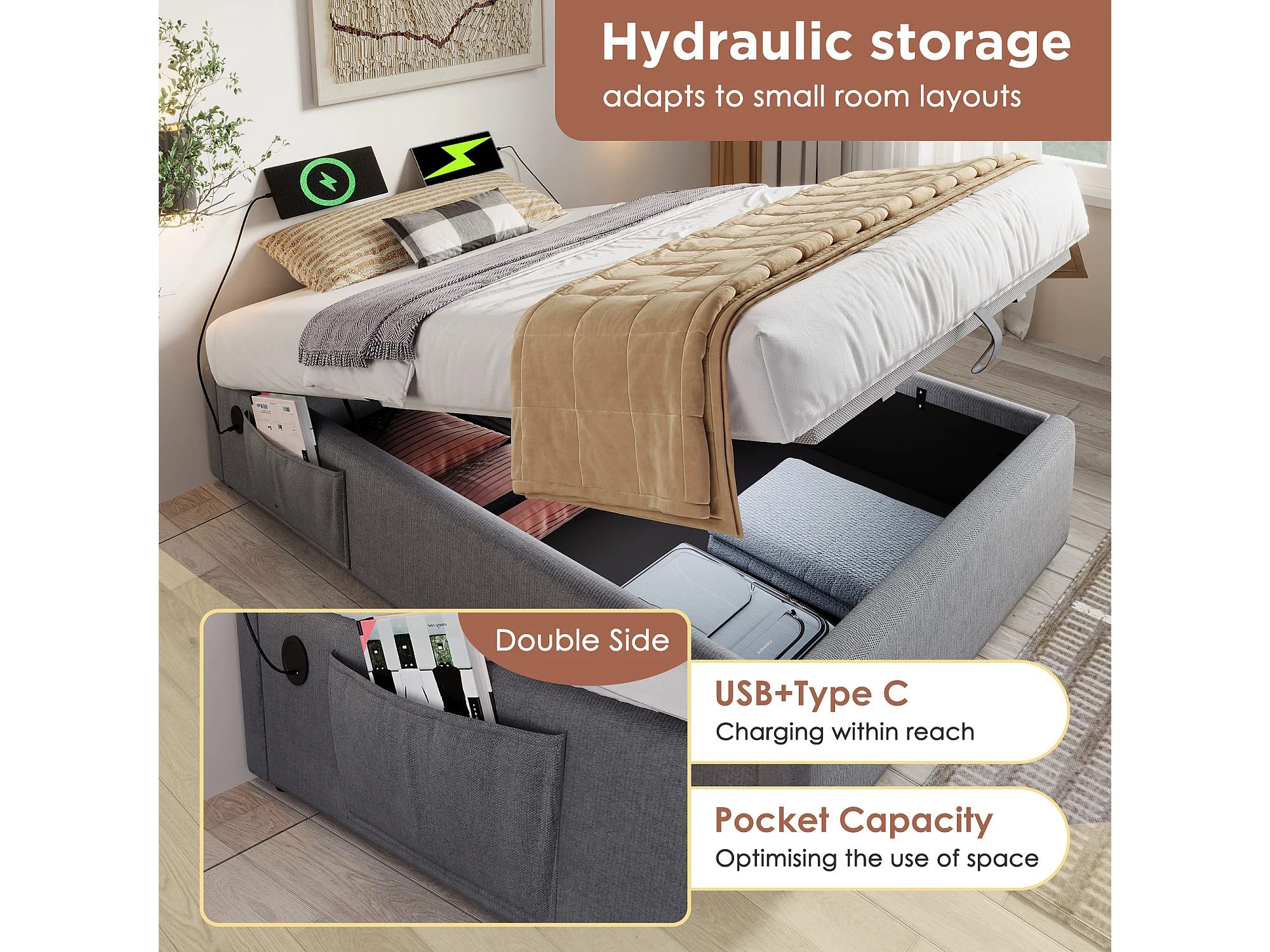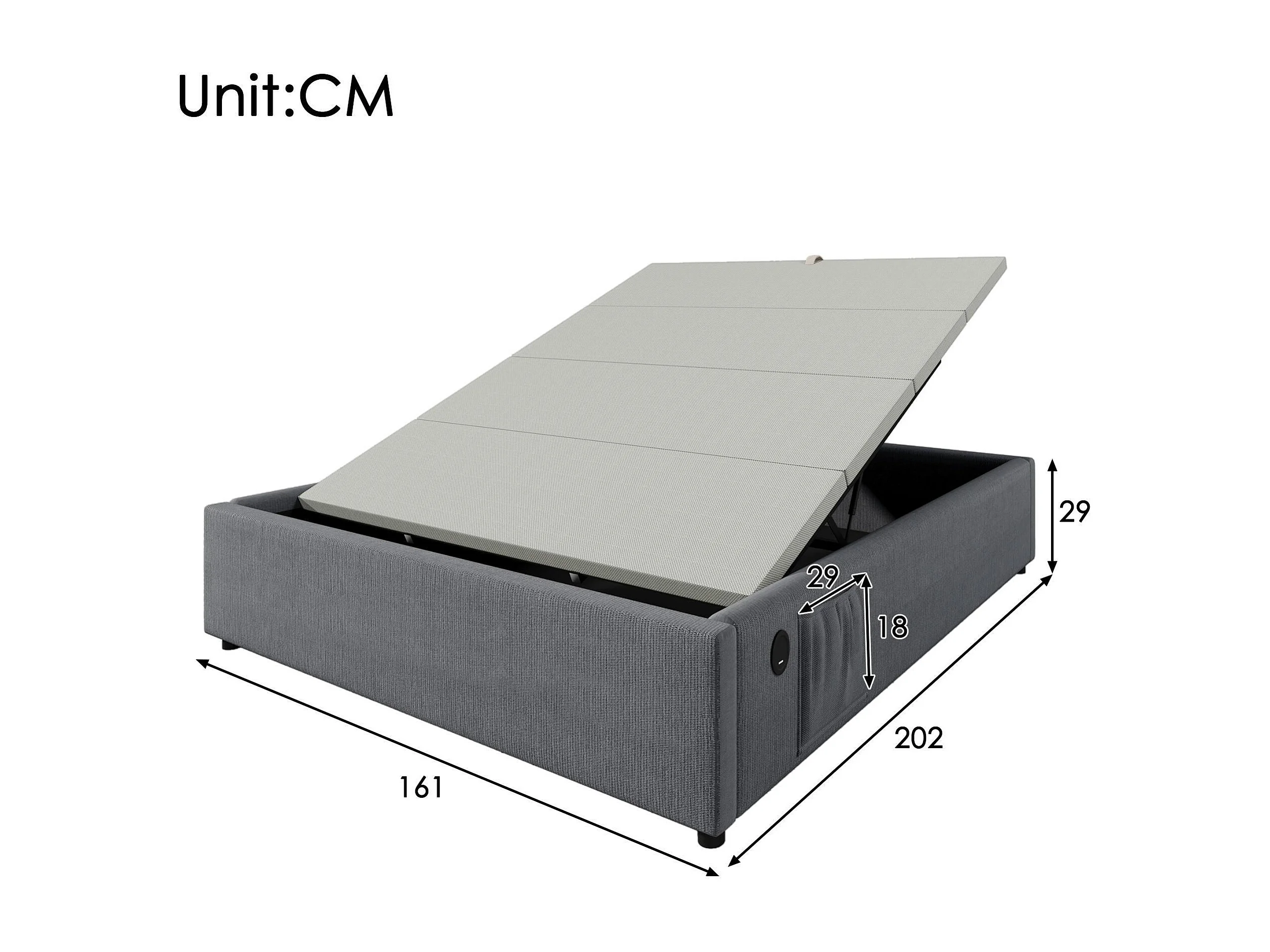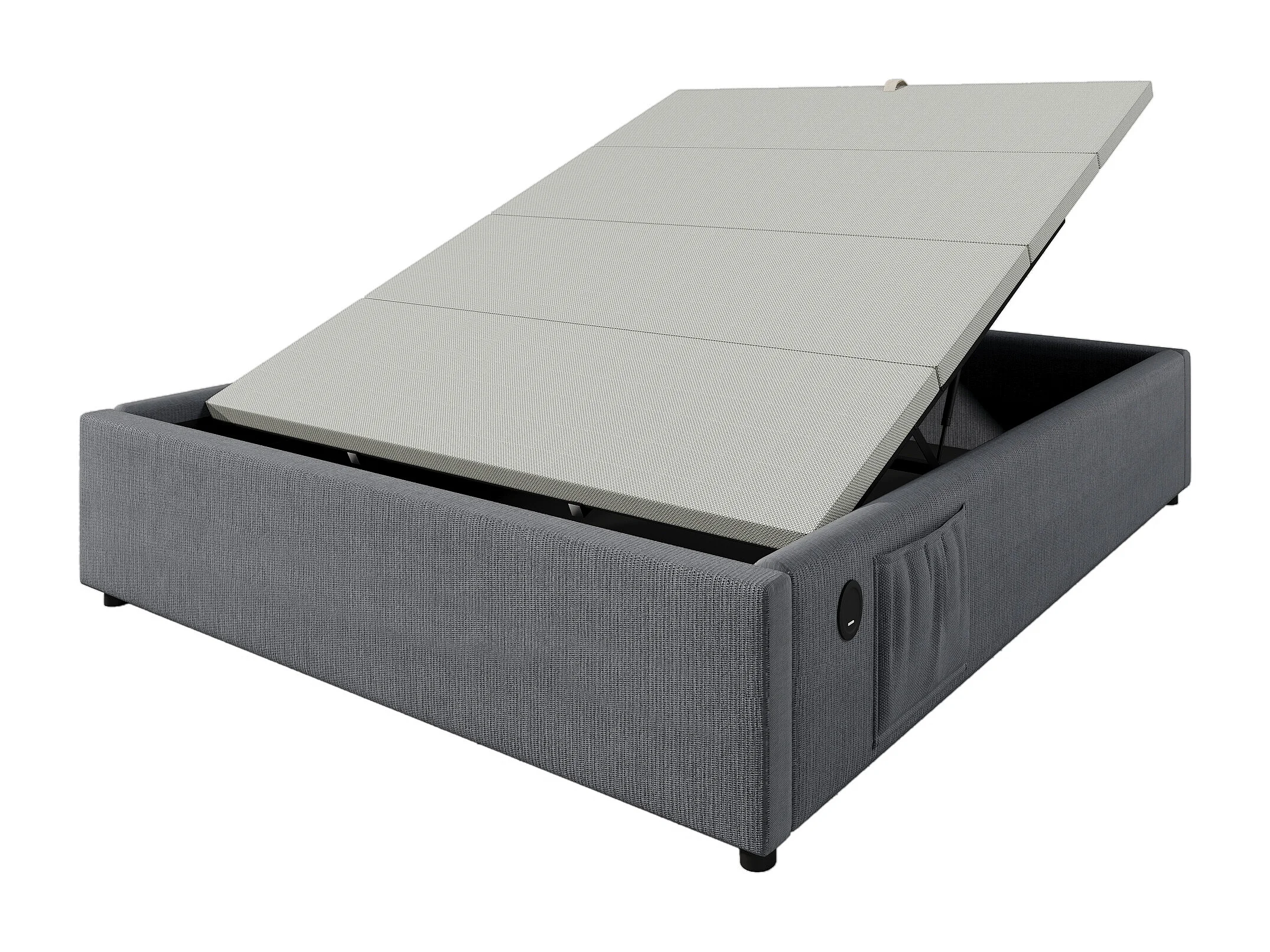 Lit coffre rembourré 160×200cm - tissu en lin - avec prises de recharge et sommier à lattes - Gris