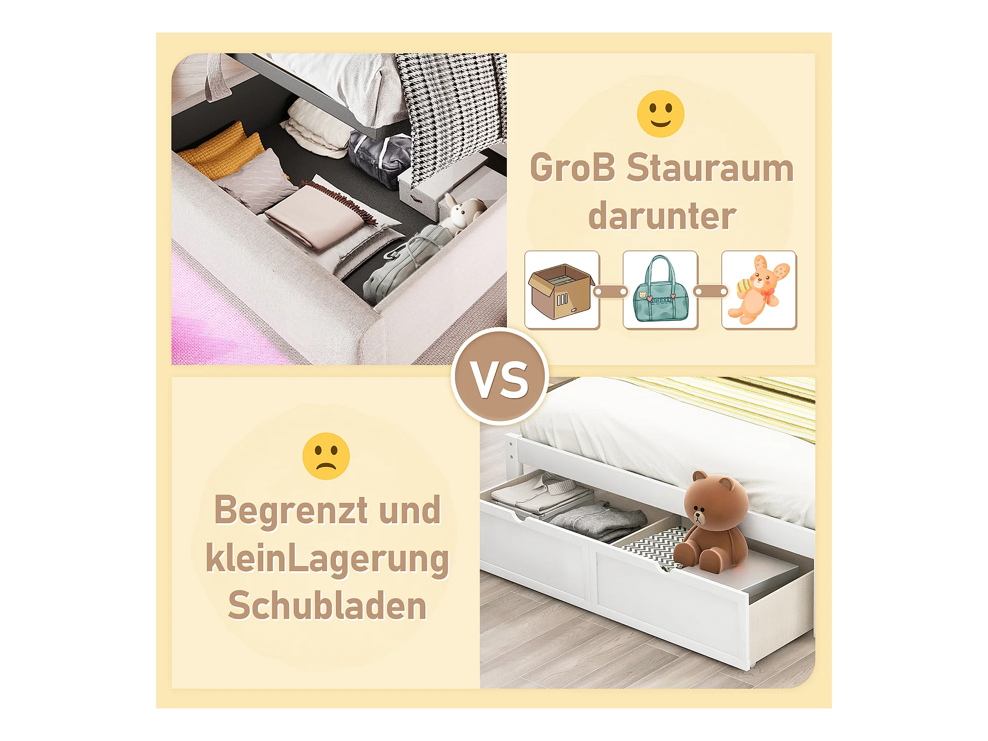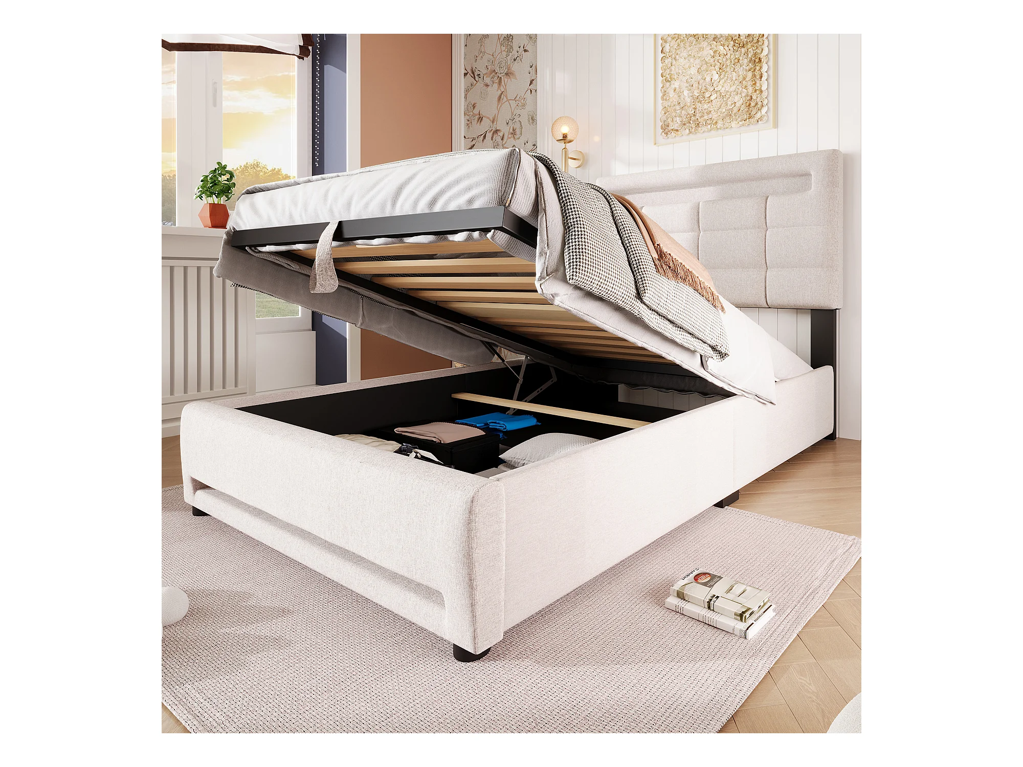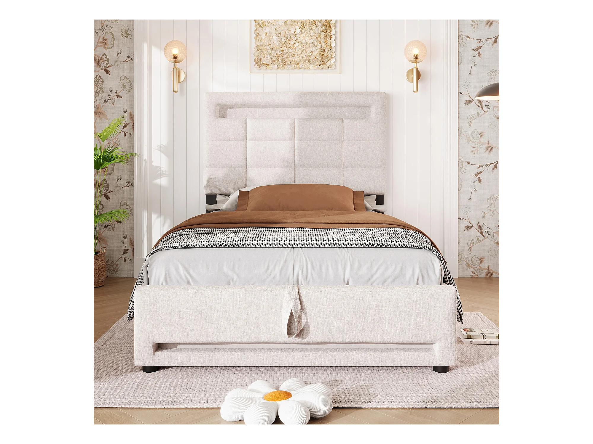 Lit coffre rembourré - 90 x 200 cm - télécommande APP + Leds + port USB - tissu lin - beige
