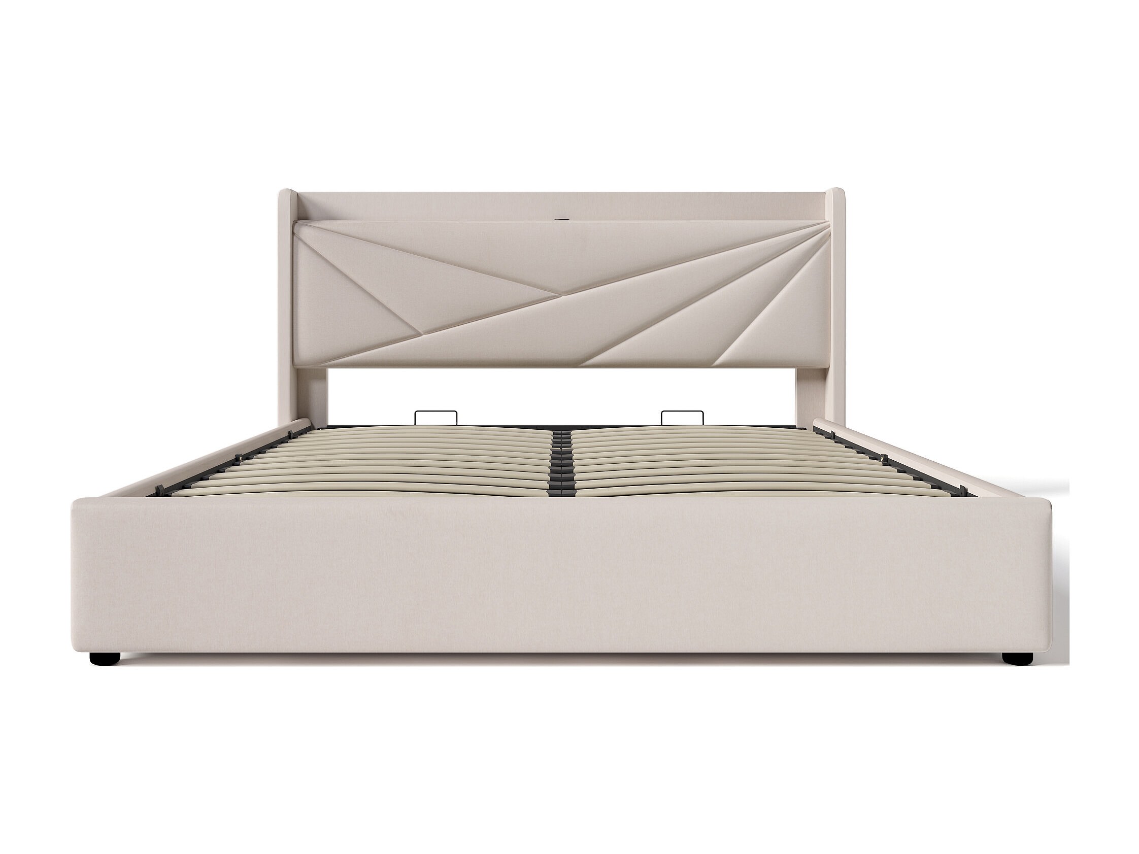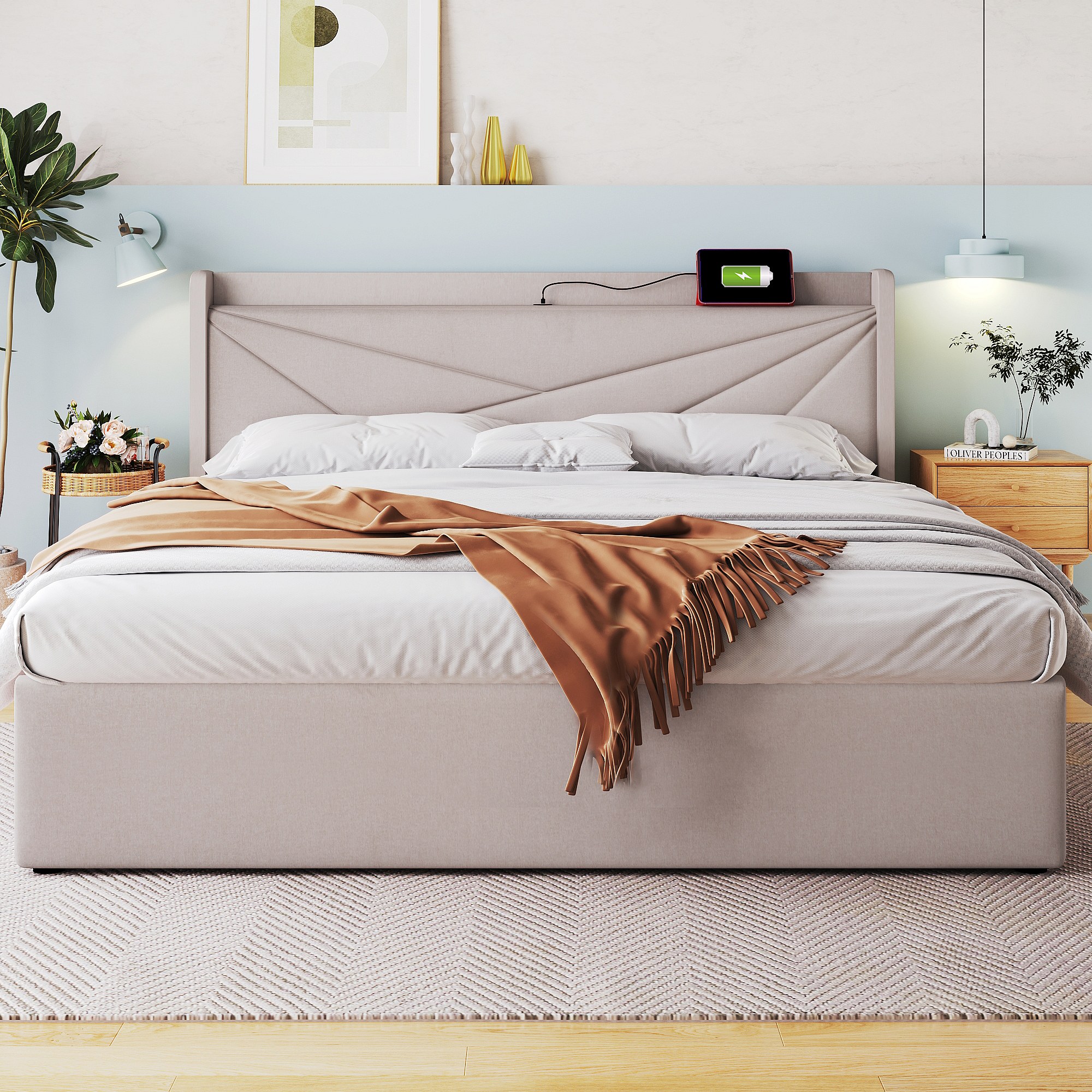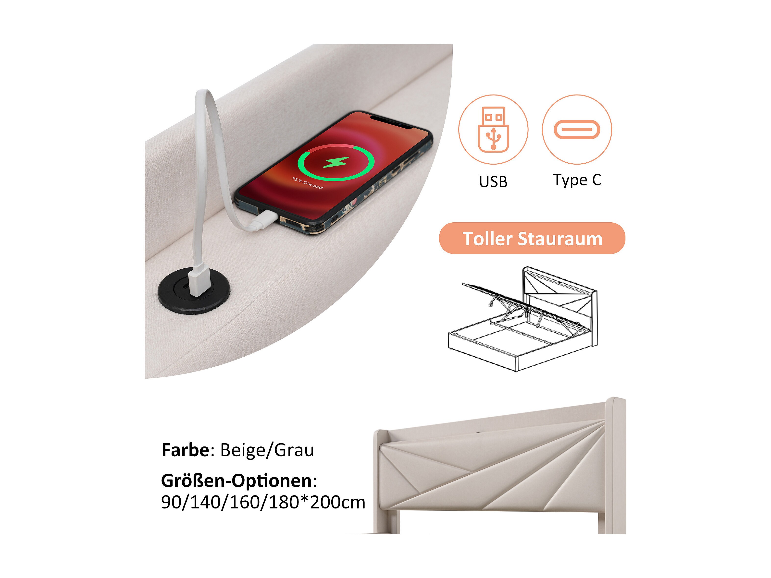 Lit coffre 160x200 cm - Lit adulte avec fonction de charge USB - tissu lin beige - matelas inclus