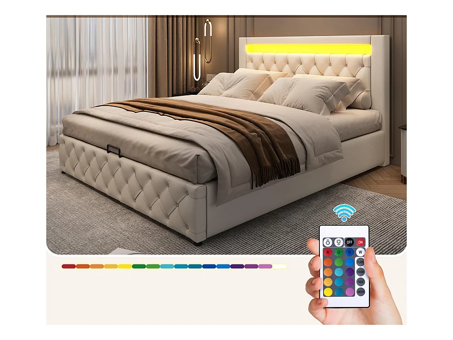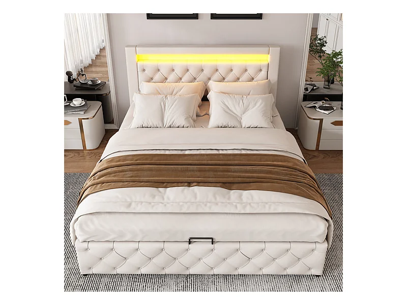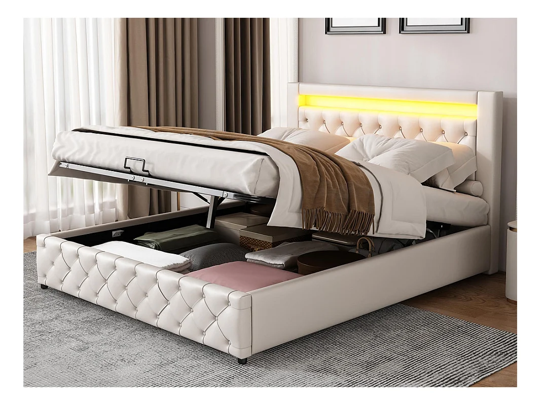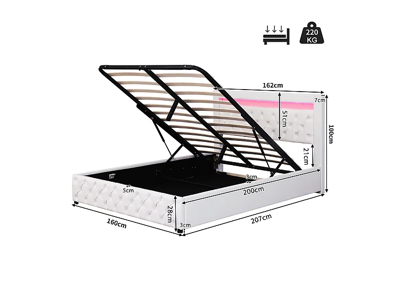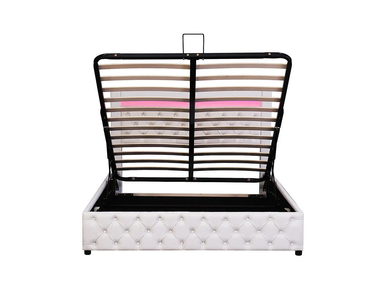 Lit coffre rembourré en similicuir avec LED - 160x200cm - avecsommier à lattes - Blanc