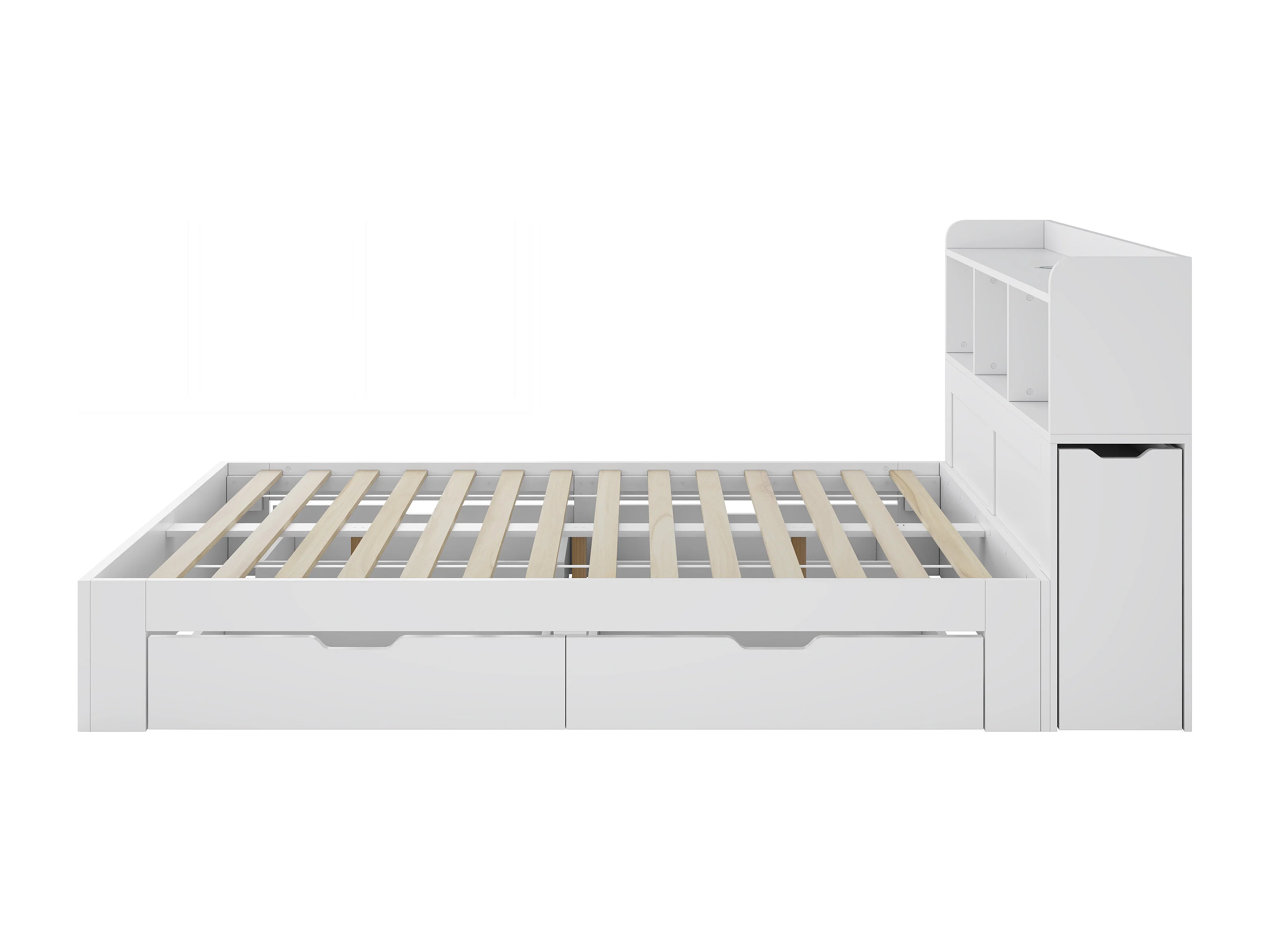Lit combiné double 140 x 200 cm, chevets, coffre, interface TYPE-C,charge sans fil, en MDF blanc, sans matelas