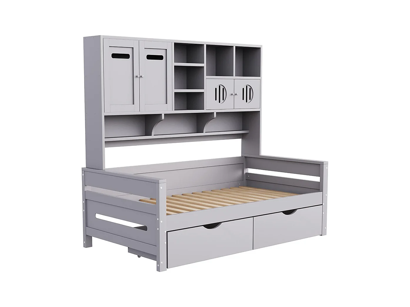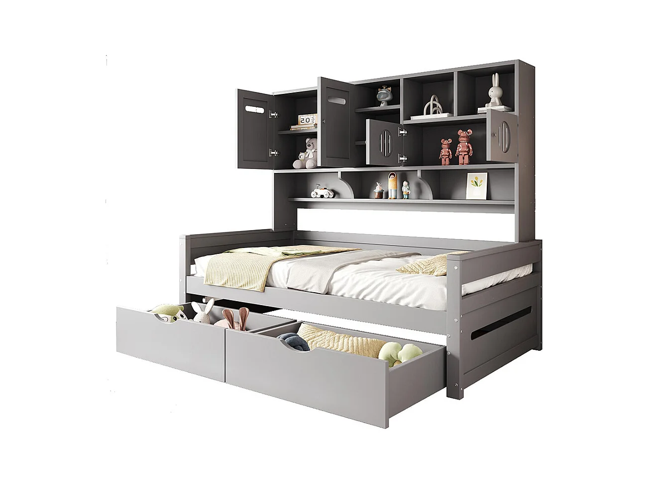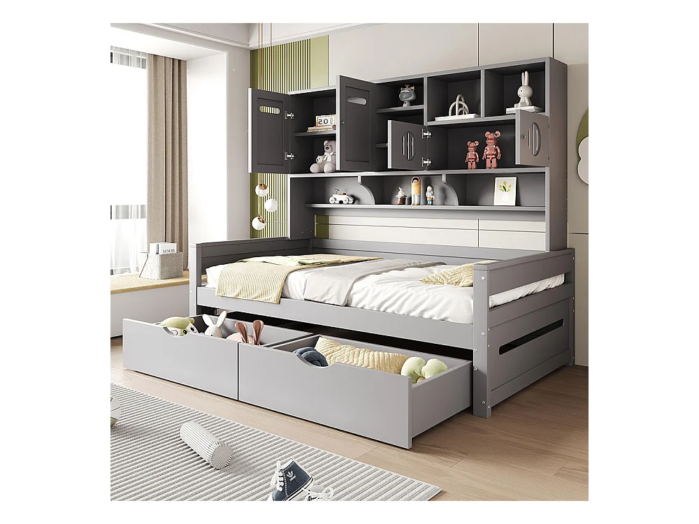 Lit combiné en bois 90x200 cm rangement multifonctionnel grand tiroir lit simple adolescent sommier à lattes gris sans matelas