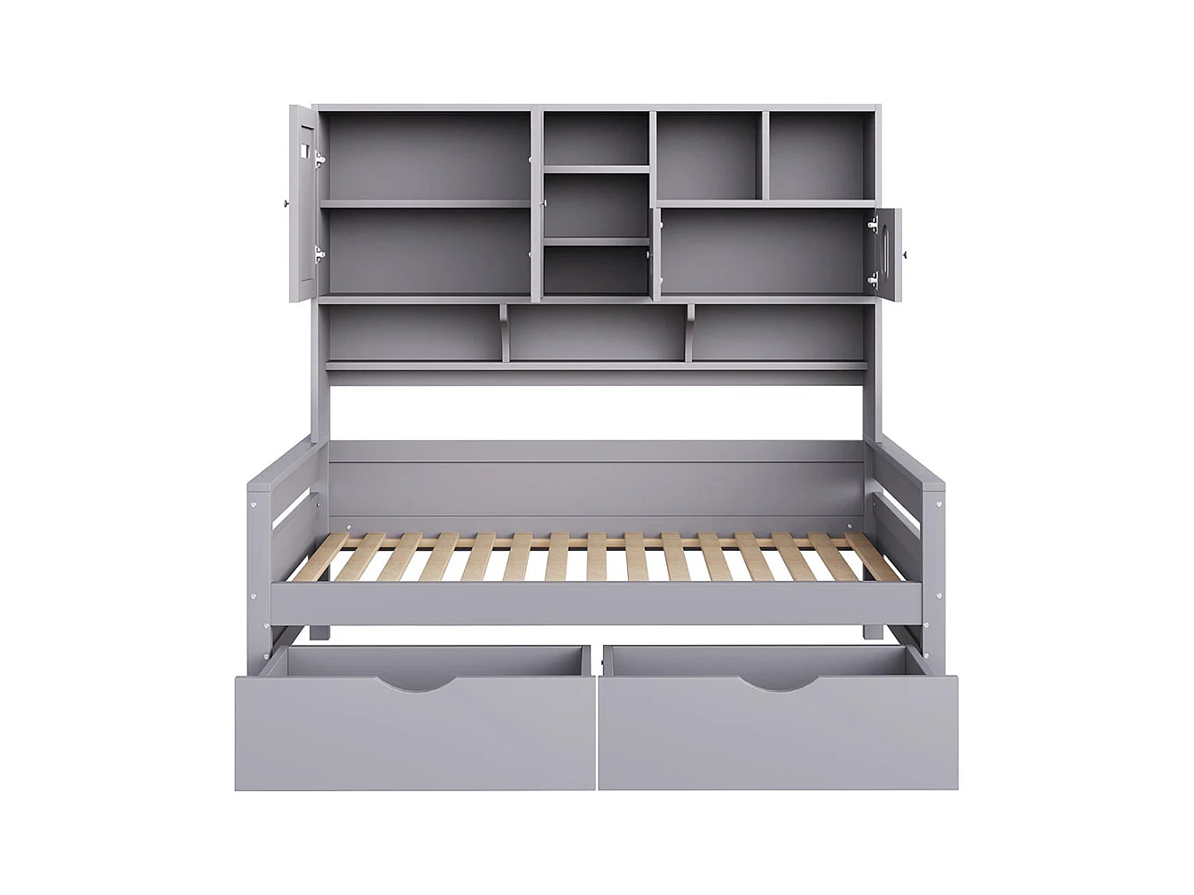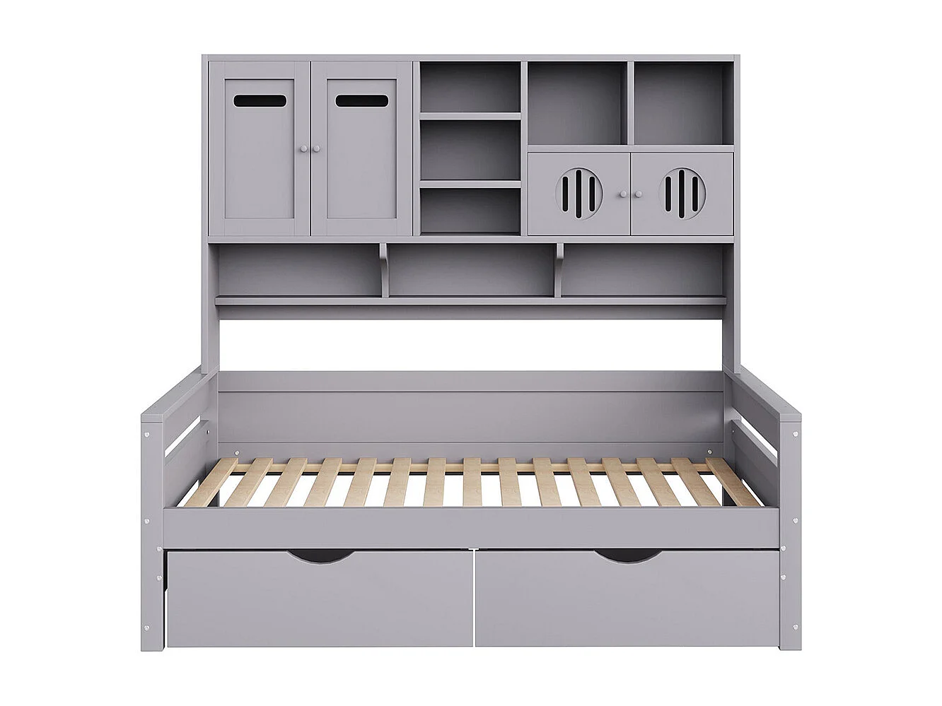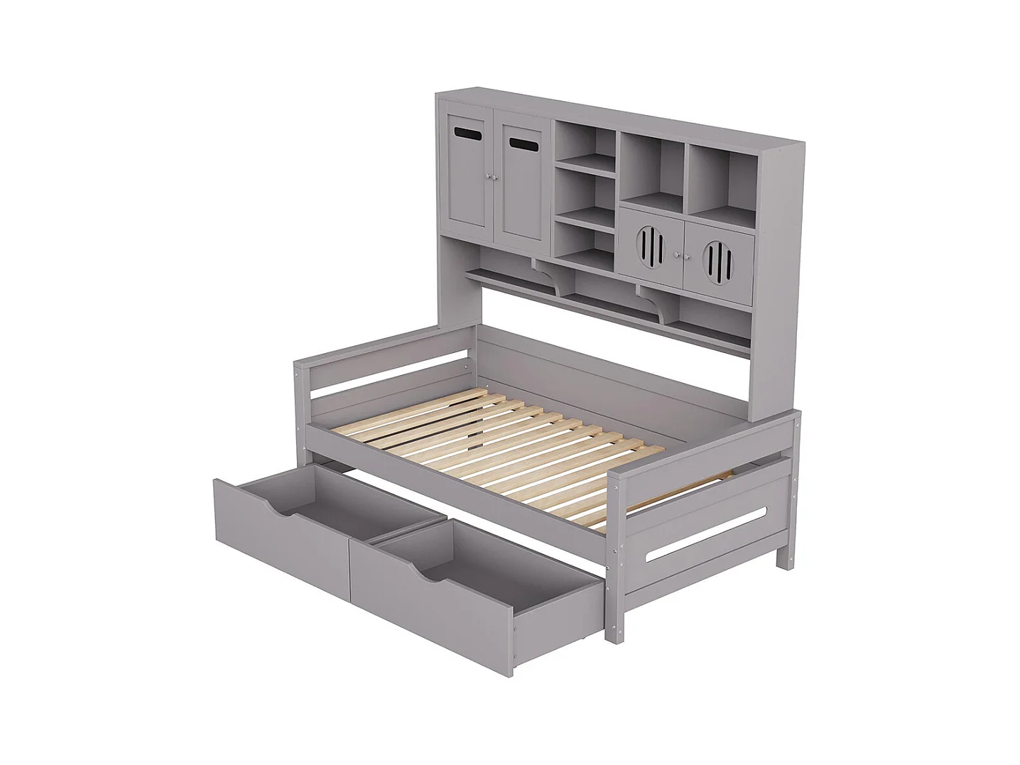Lit combiné en bois 90x200 cm rangement multifonctionnel grand tiroir lit simple adolescent sommier à lattes gris sans matelas