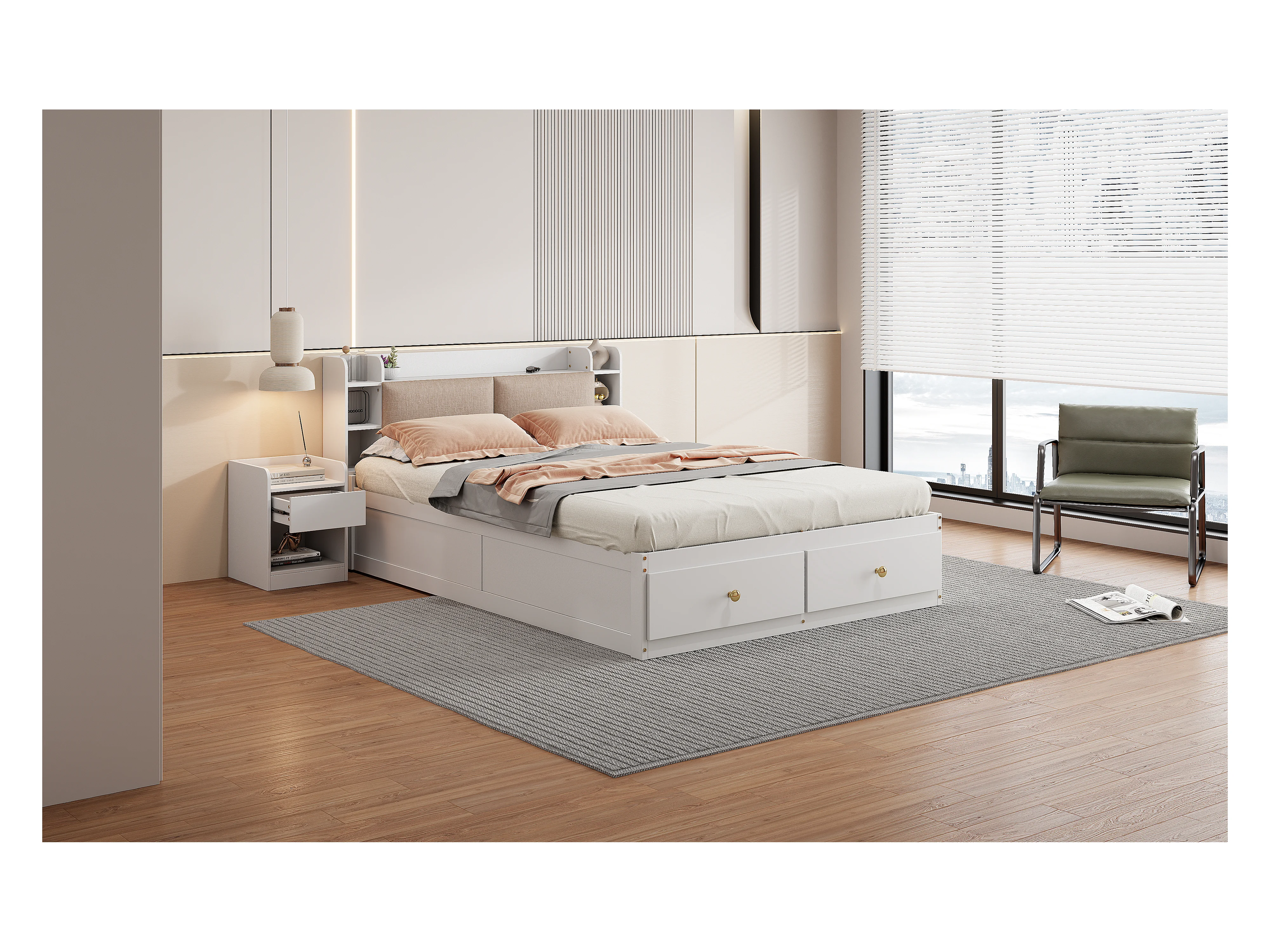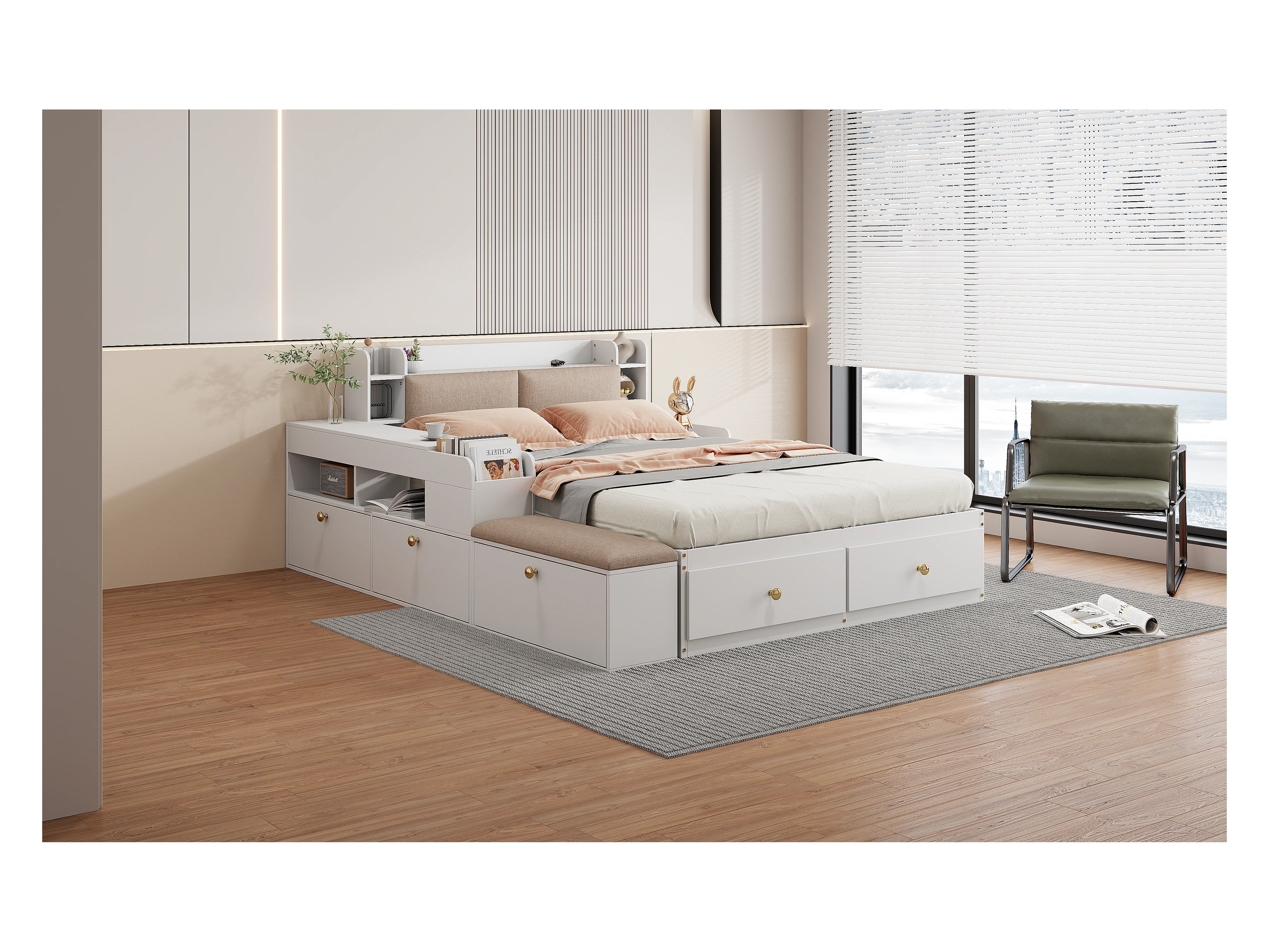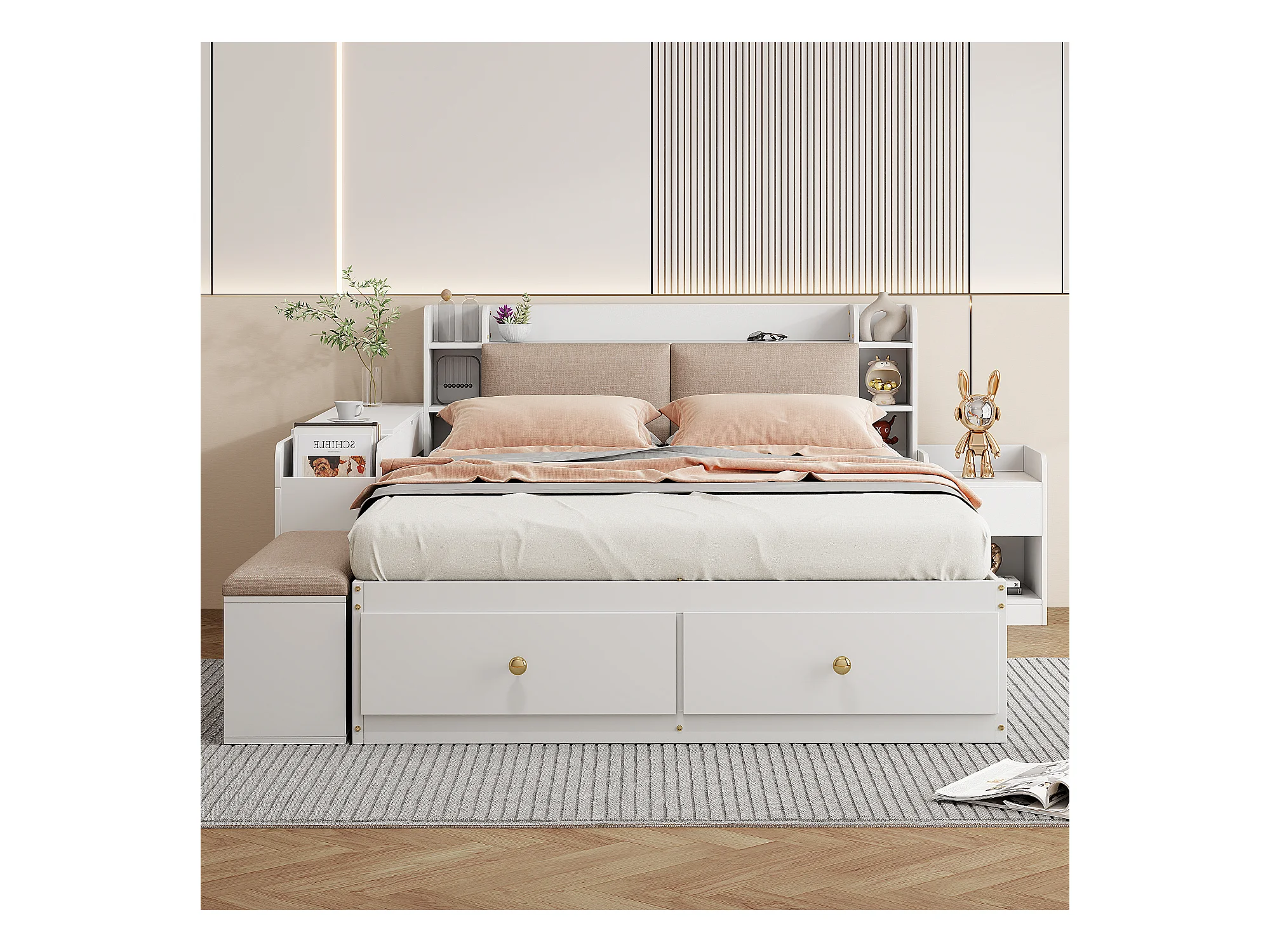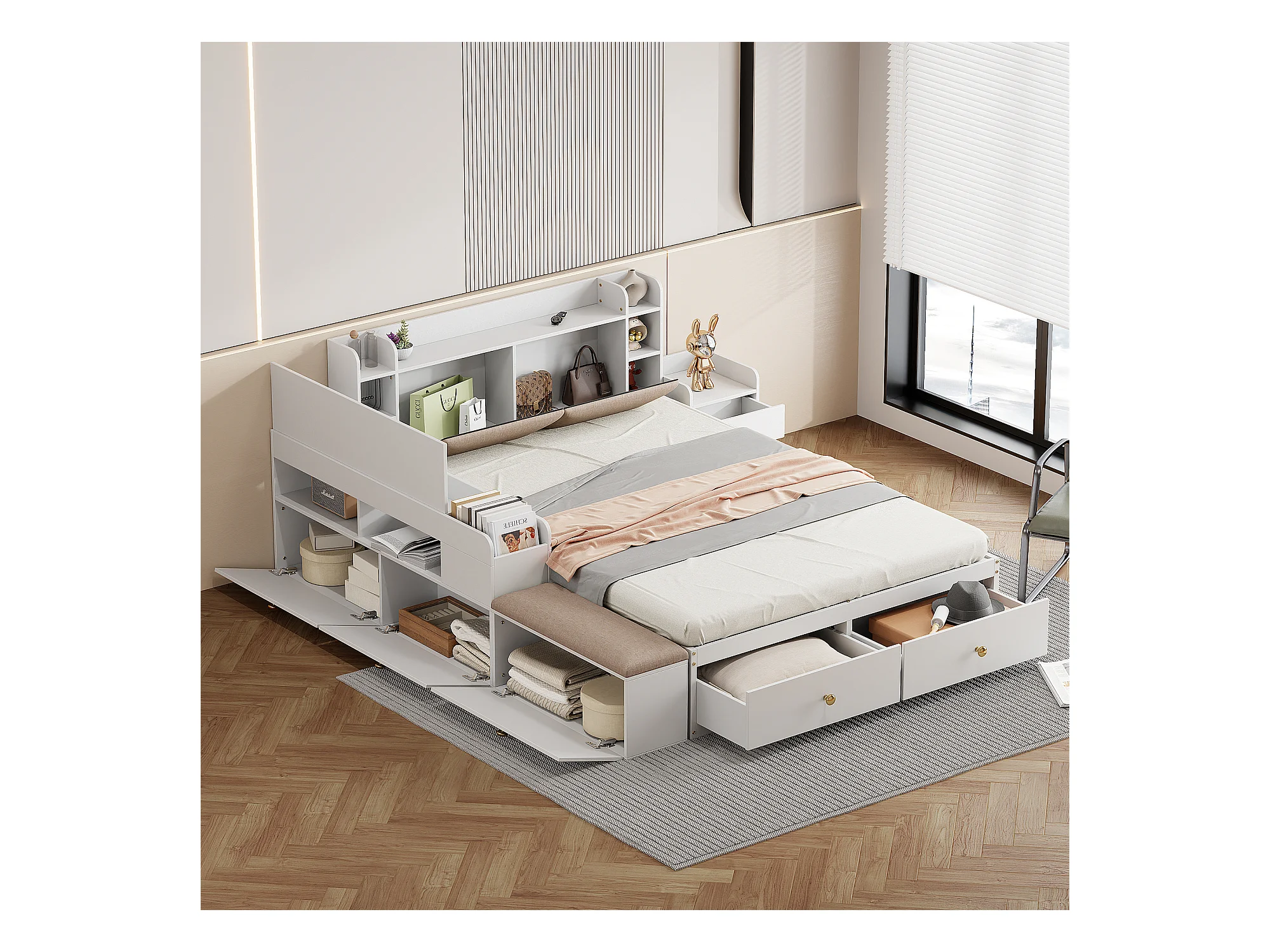 Lit combiné en bois massif avec rangement, tête de lit avec compartiment, tiroirs, table de chevet, banc et armoire, blanc (227x145x91cm)