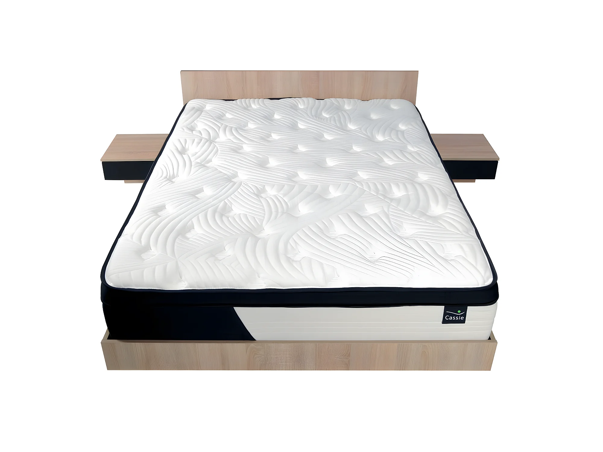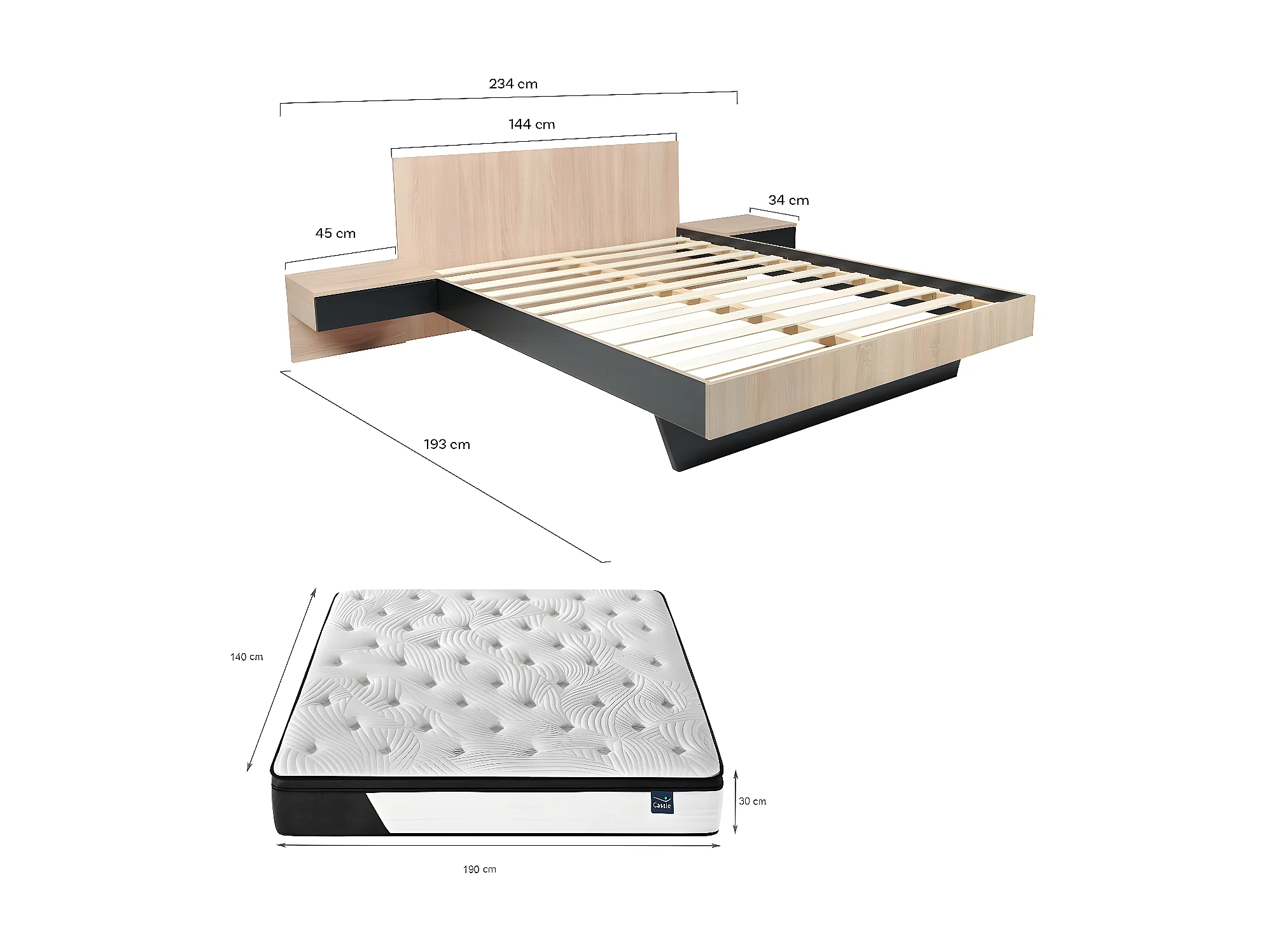Lit COOL 140x190 cm + 2 chevets + sommier + matelas CASSIE / Décor Chêne blanchi & noir