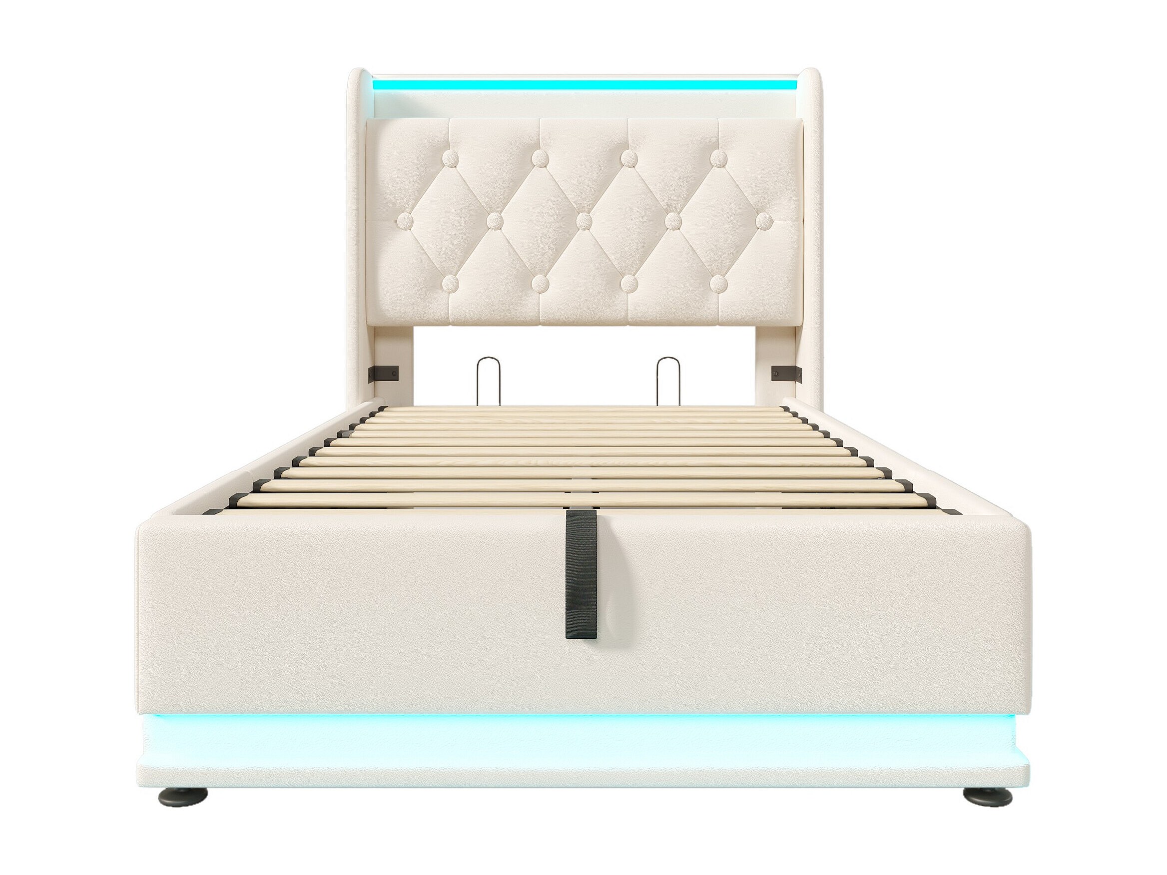 Lit d'adulte, lit simple rembourré 90*200 cm, fonction LED 360 surround, blanc, matériau PU, avec fonction de recharge USB Type-C.