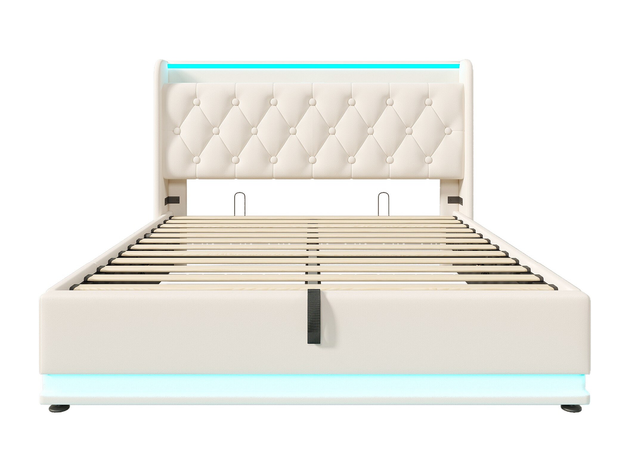 Lit d'adulte, rembourré double 160*200 cm, 360 fonctions LED autour, blanc, matériau PU, avec fonction de charge USB Type-C.