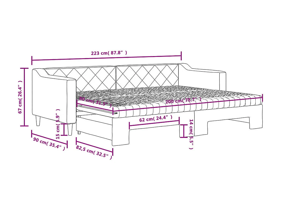 Lit de jour avec gigogne et matelas gris clair 80x200 cm tissu
