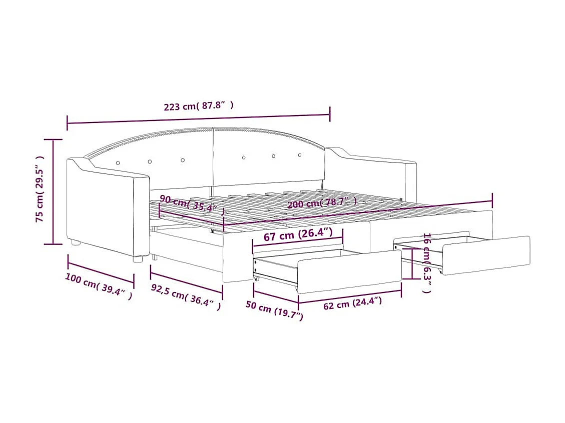 Lit de jour avec gigogne et tiroirs sans matelas 90x200 cm
