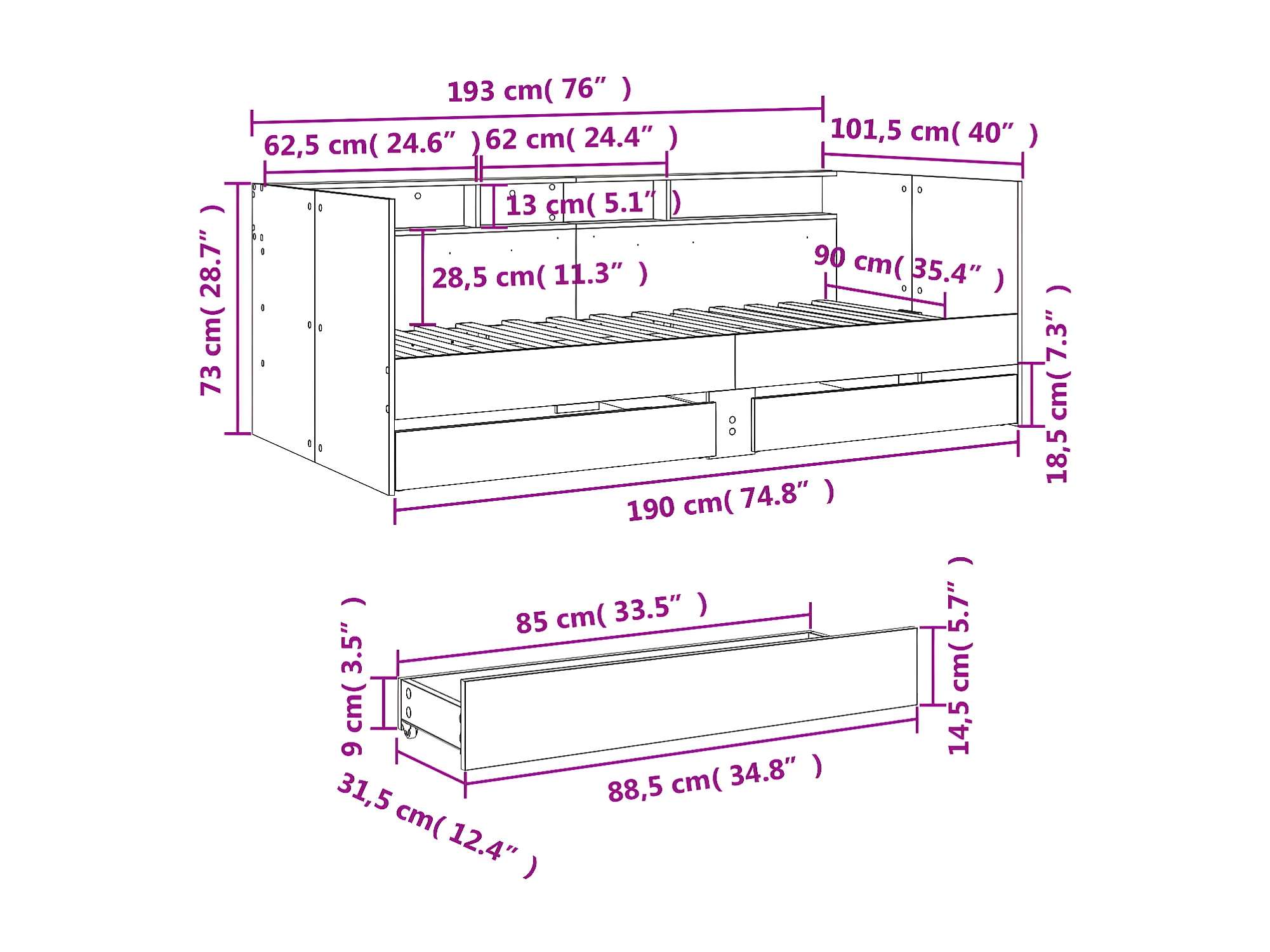 Lit de jour avec tiroirs chêne fumé 90x190 cm bois d'ingénierie