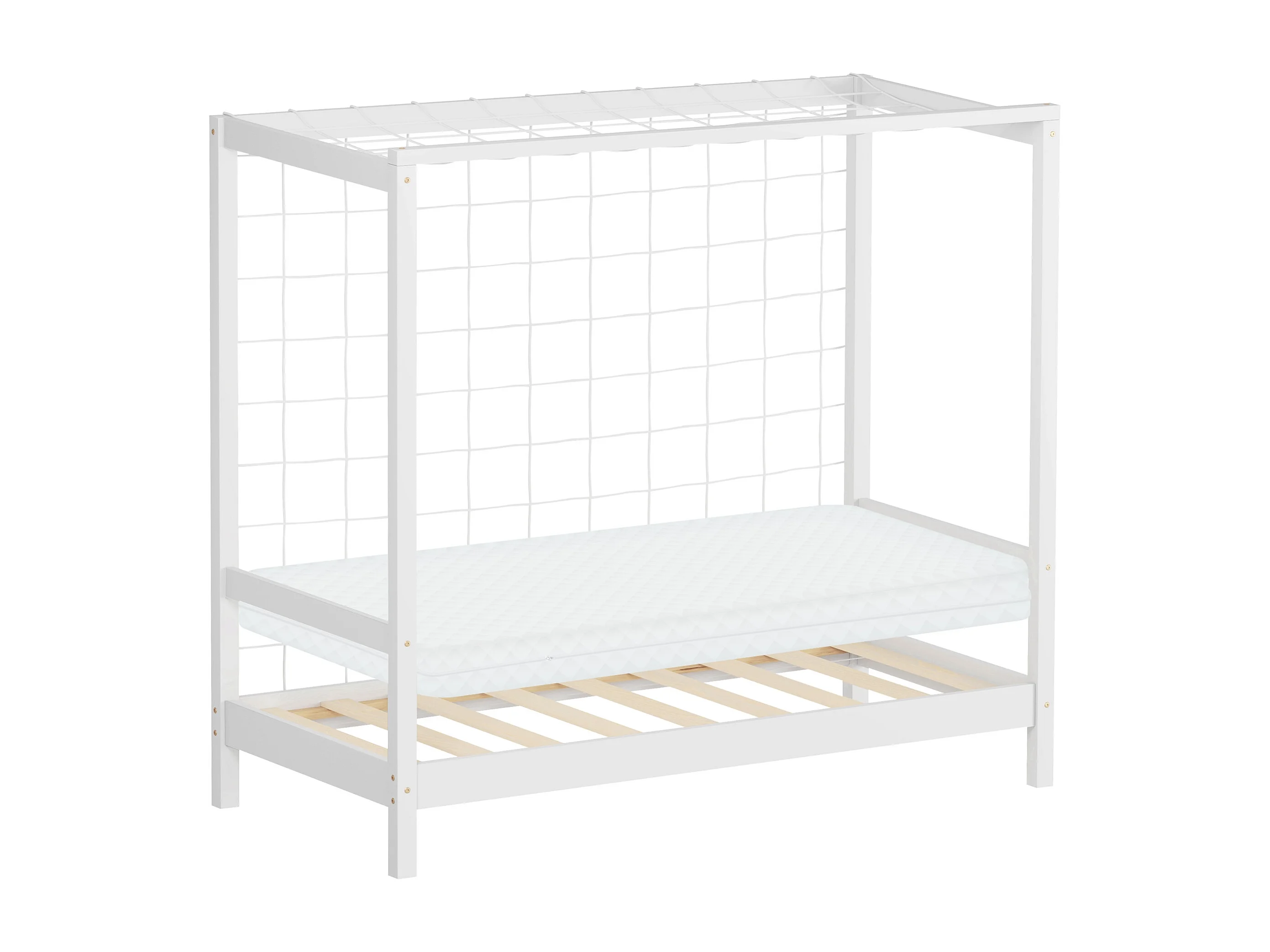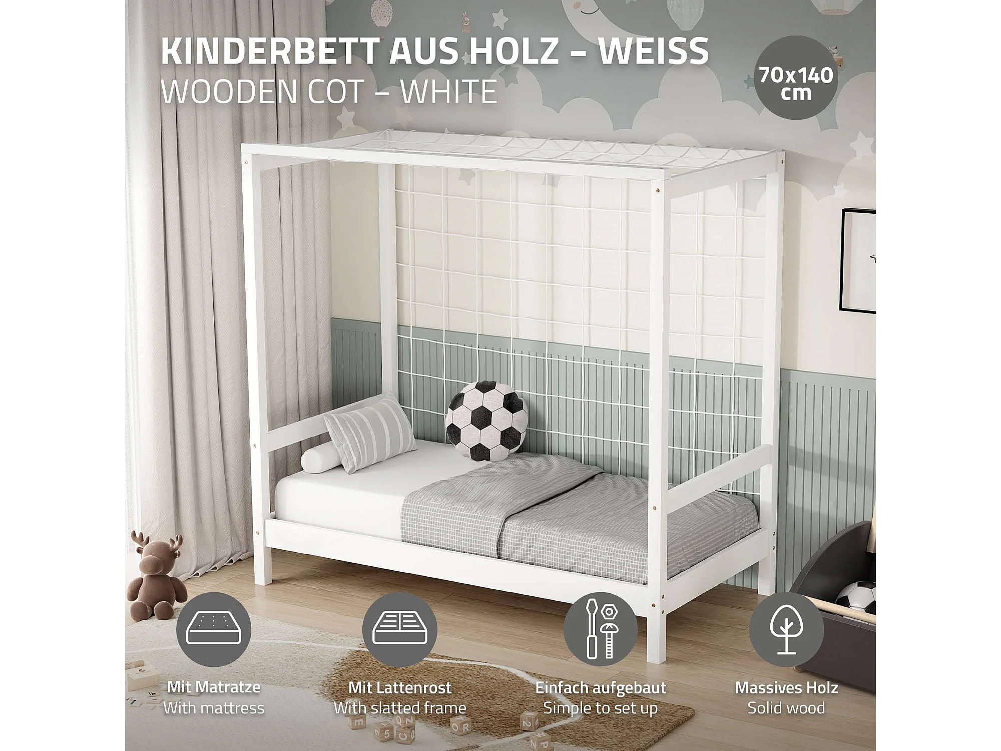 Lit d'enfant 70x140 cm avec matelas H10 cm en mousse cadre blanc en bois design football pin massif robuste avec sommier à lattes et filet de but