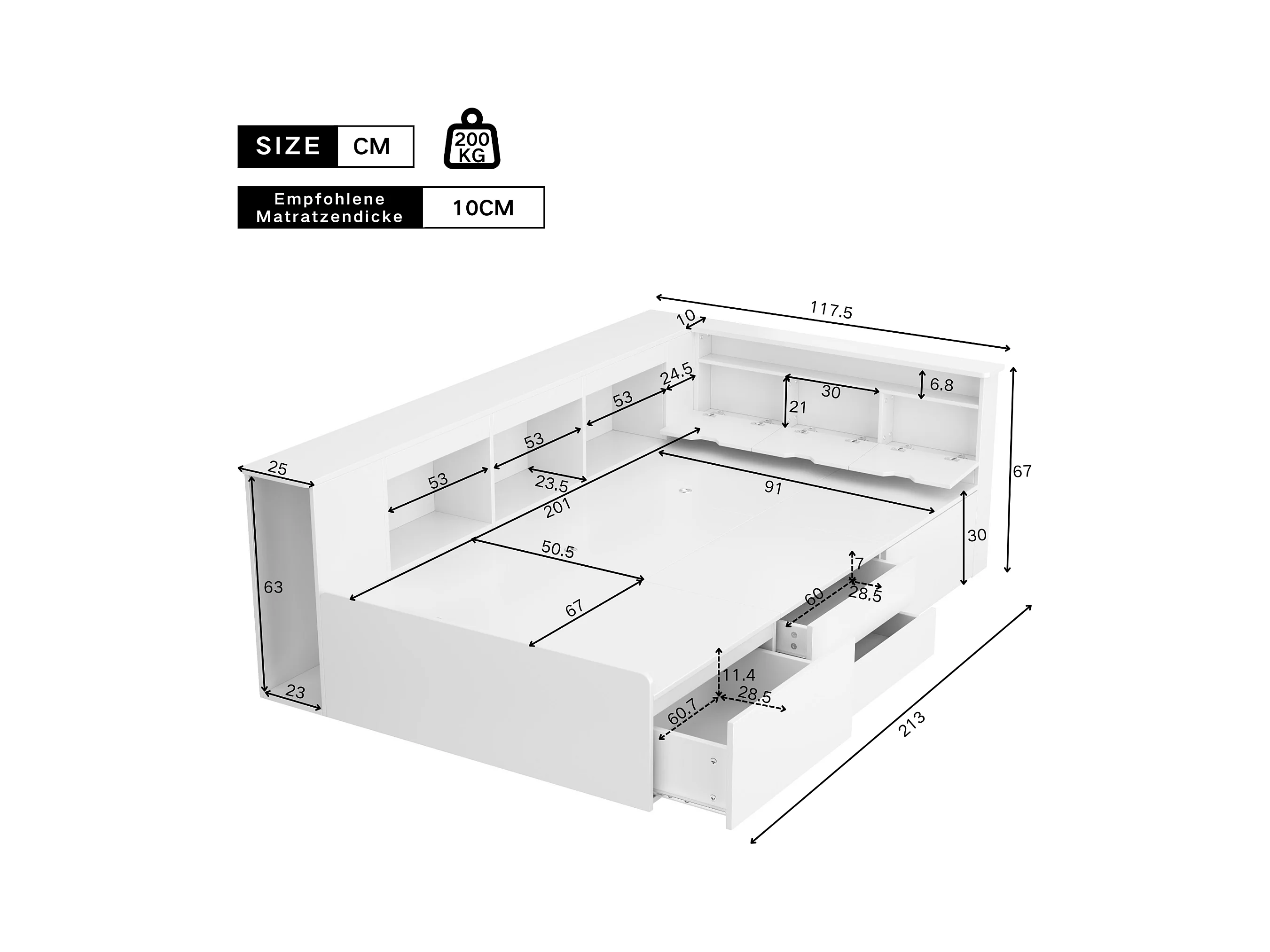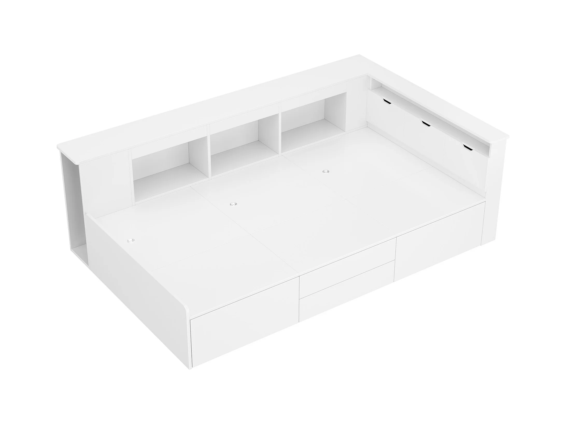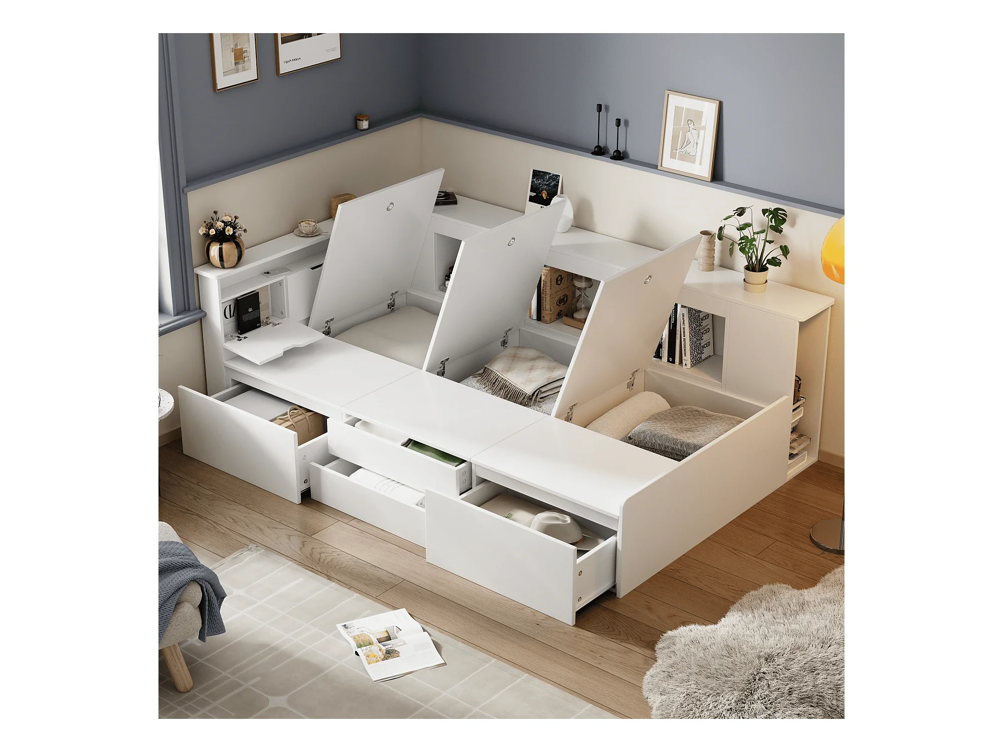Lit d'enfant 90*200 cm, lit simple avec tiroirs, bibliothèque et meuble de rangement avec espace de rangement, blanc