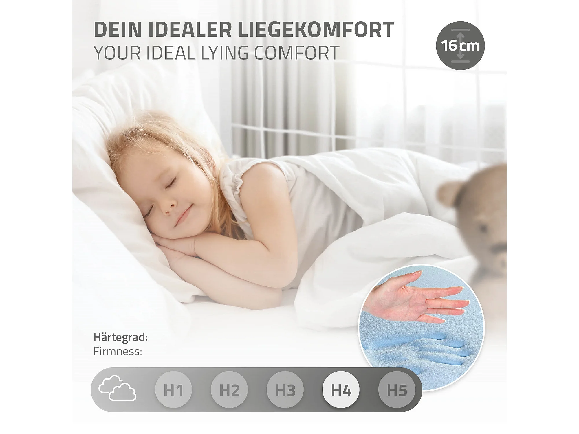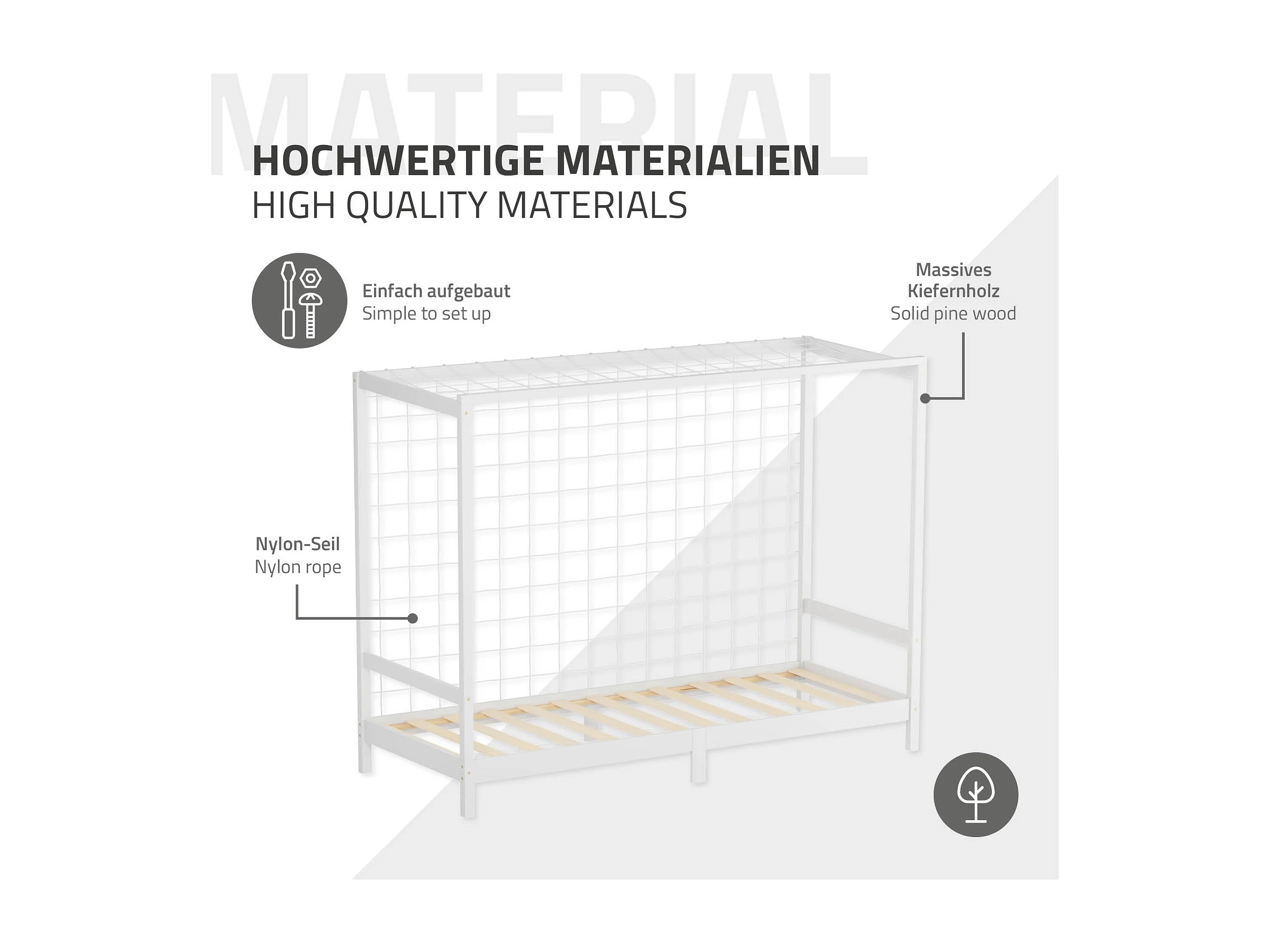 Lit d'enfant 90x200 cm avec matelas H16 cm en mousse cadre blanc en bois design football pin massif robuste avec sommier à lattes et filet de but