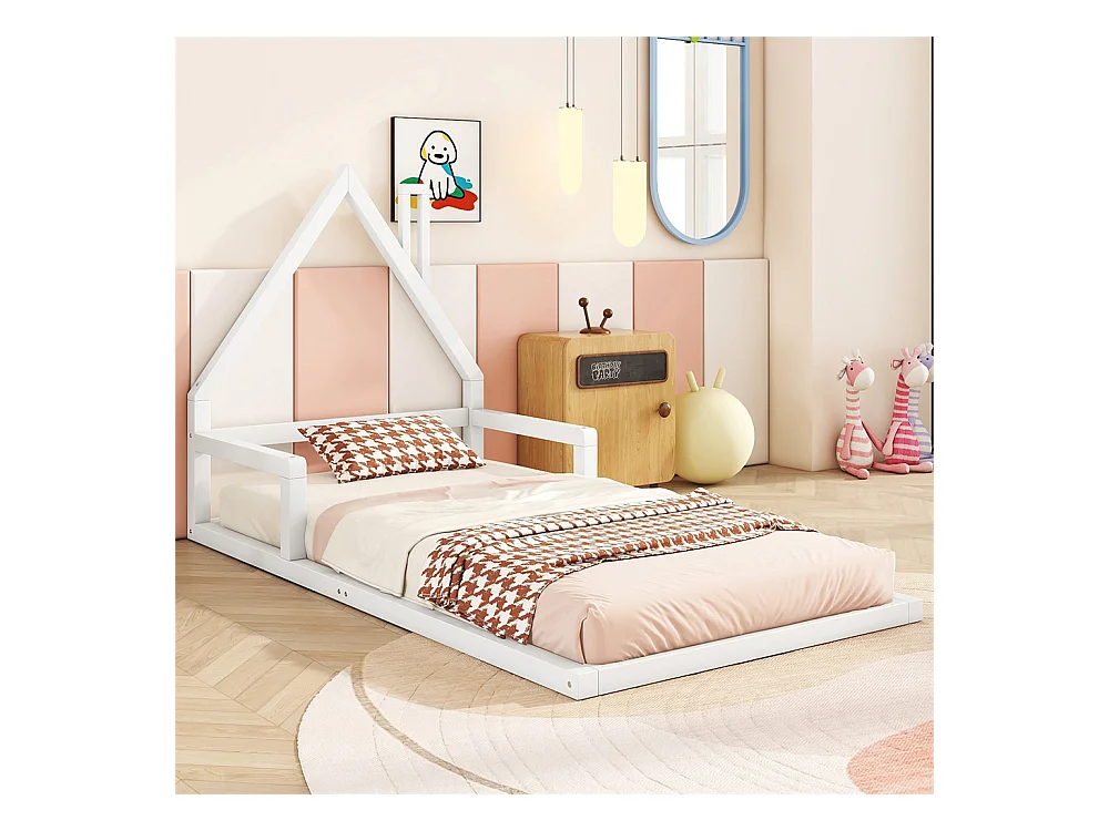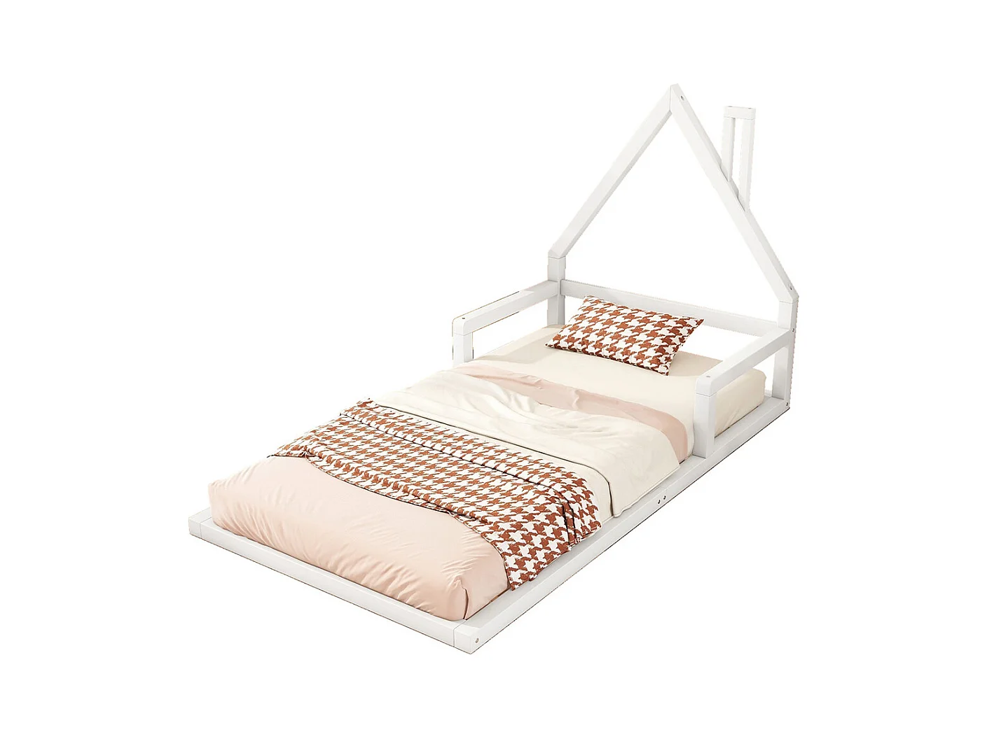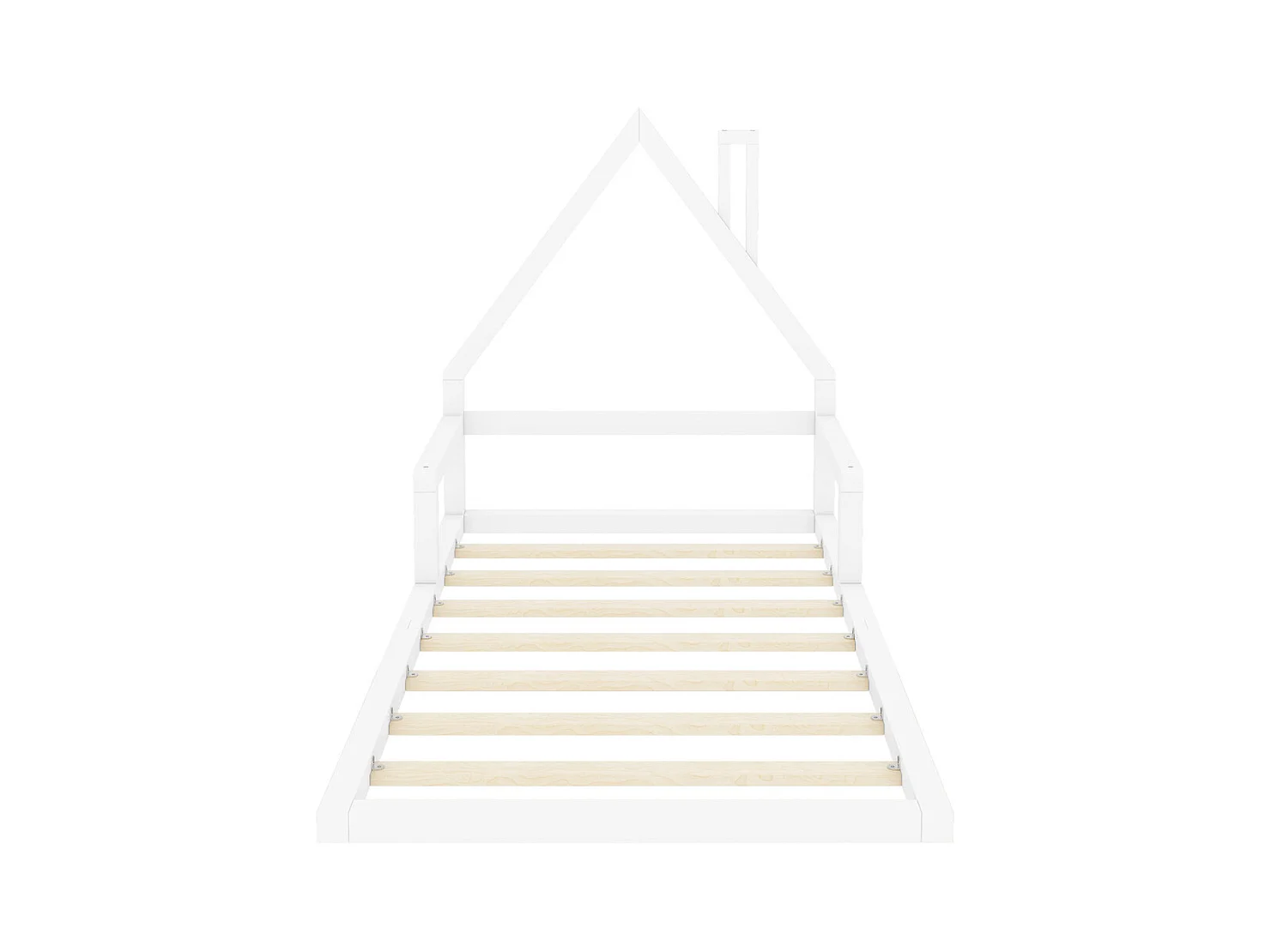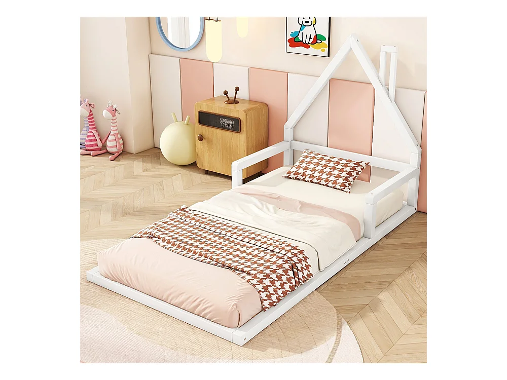 Lit d'enfant 90x200cm, lit plat, forme maison, pin massif, blanc