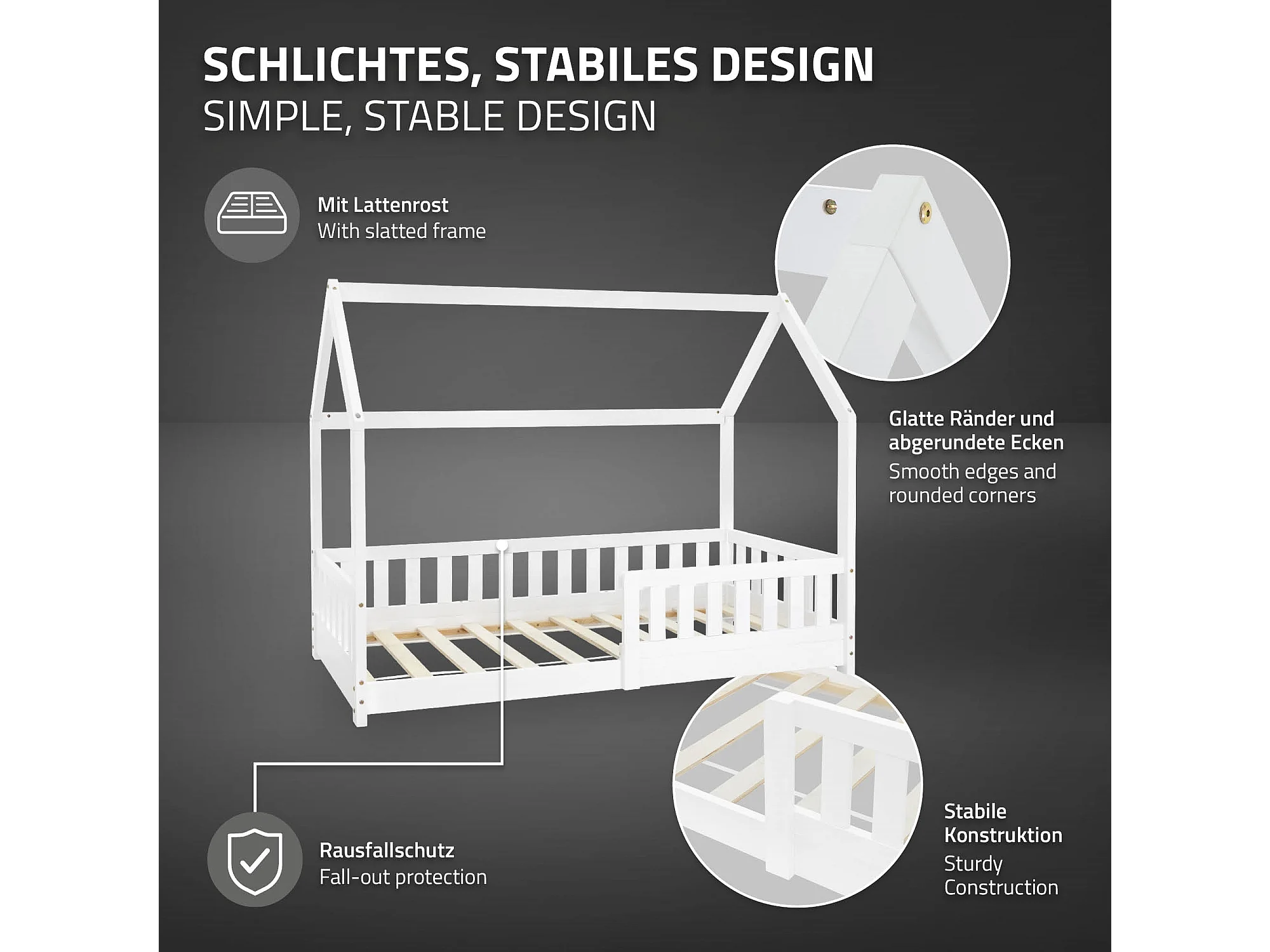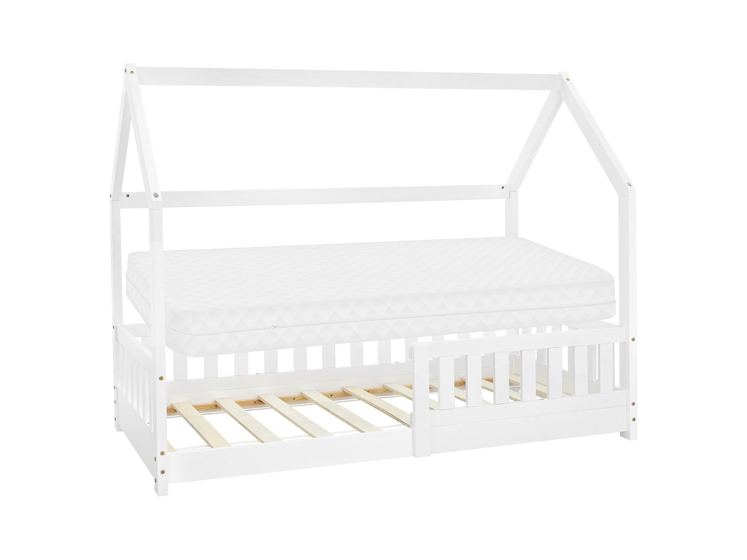 Lit d'enfants 80x160 cm blanc forme de maison en bois de pin massif avec matelas housse amovible sommier à lattes anti-chute pour filles garçons