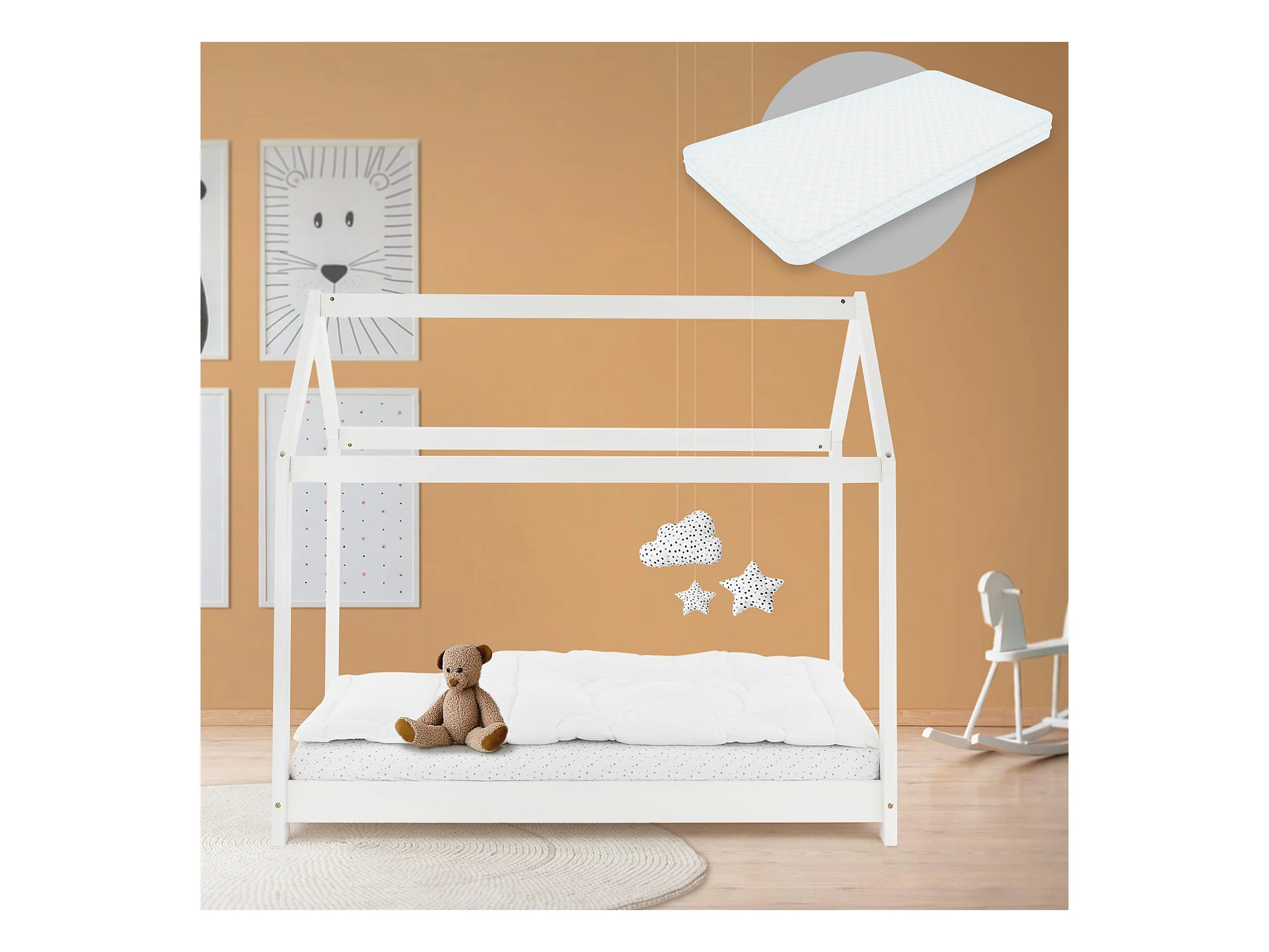 Lit d'enfants Tipi 70x140 cm blanc style maison en bois de pin massif avec matelas housse amovible respirant et sommier à lattes protection anti-chute