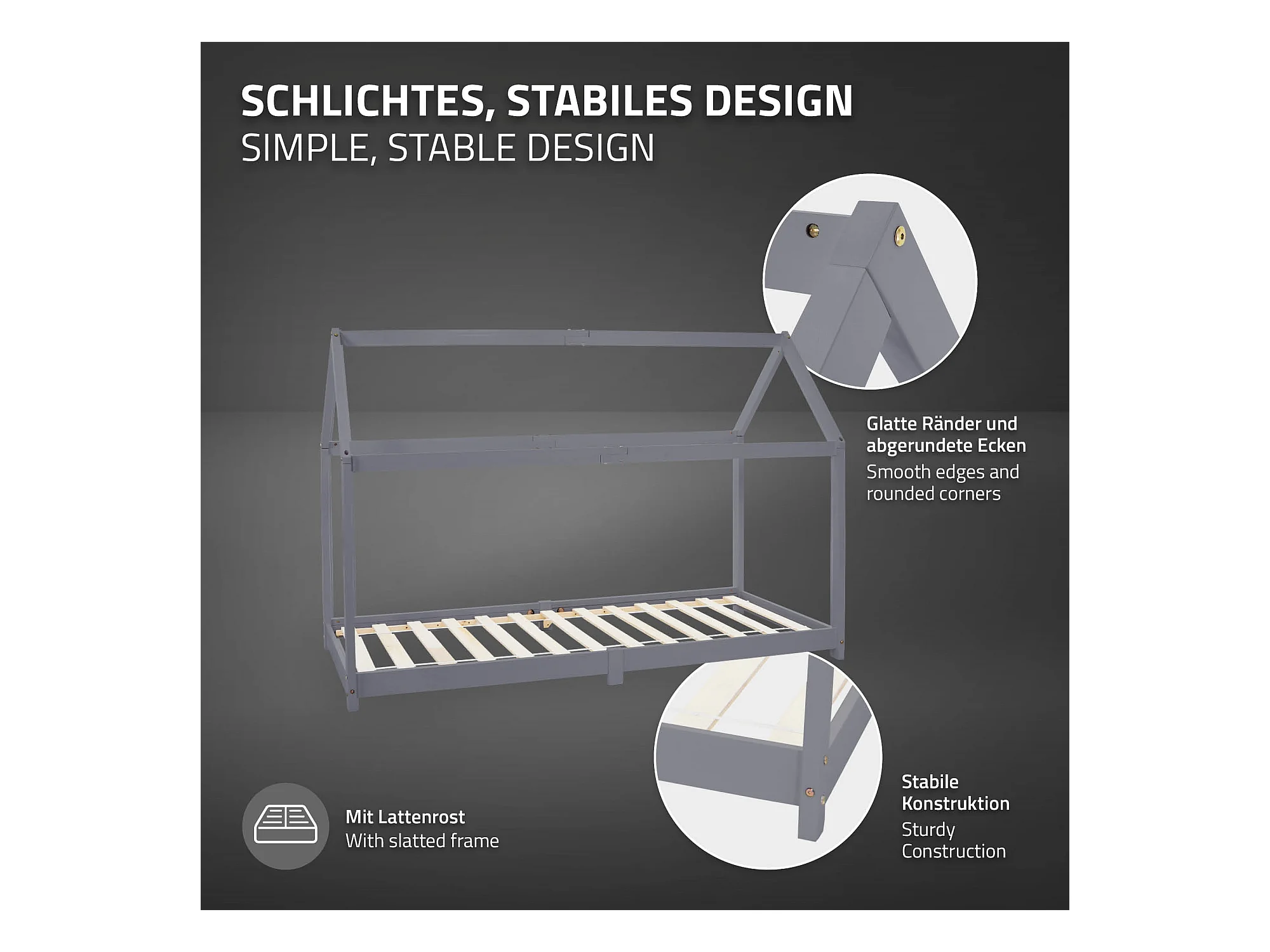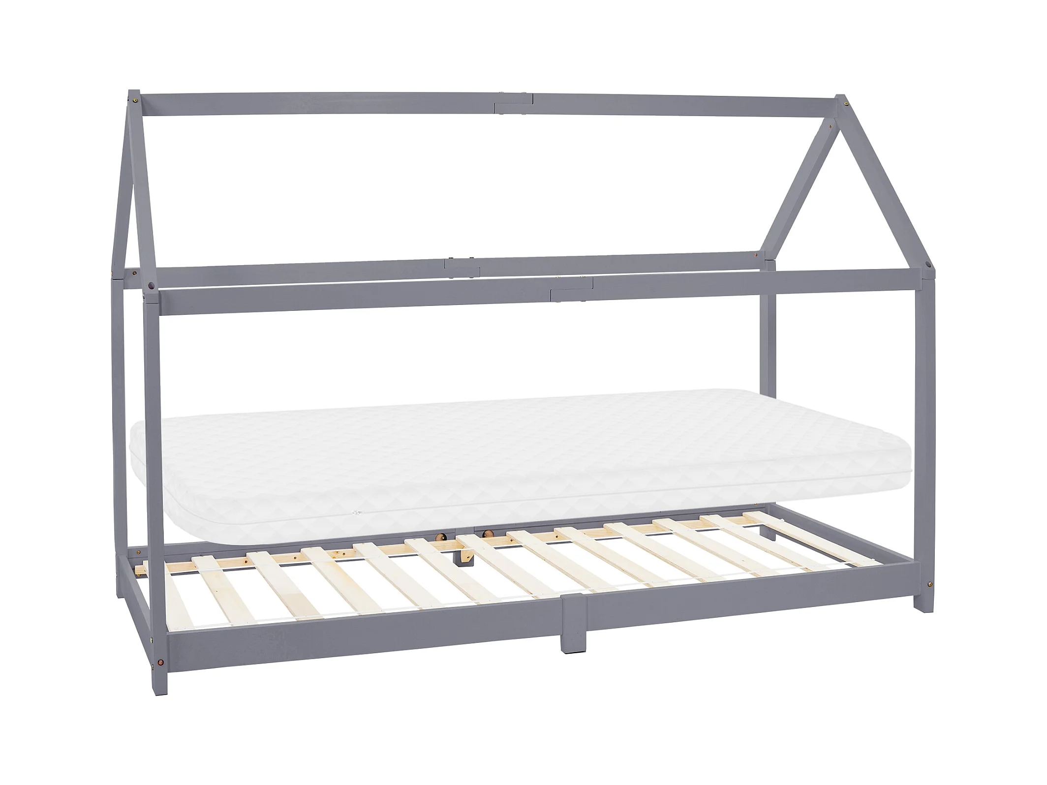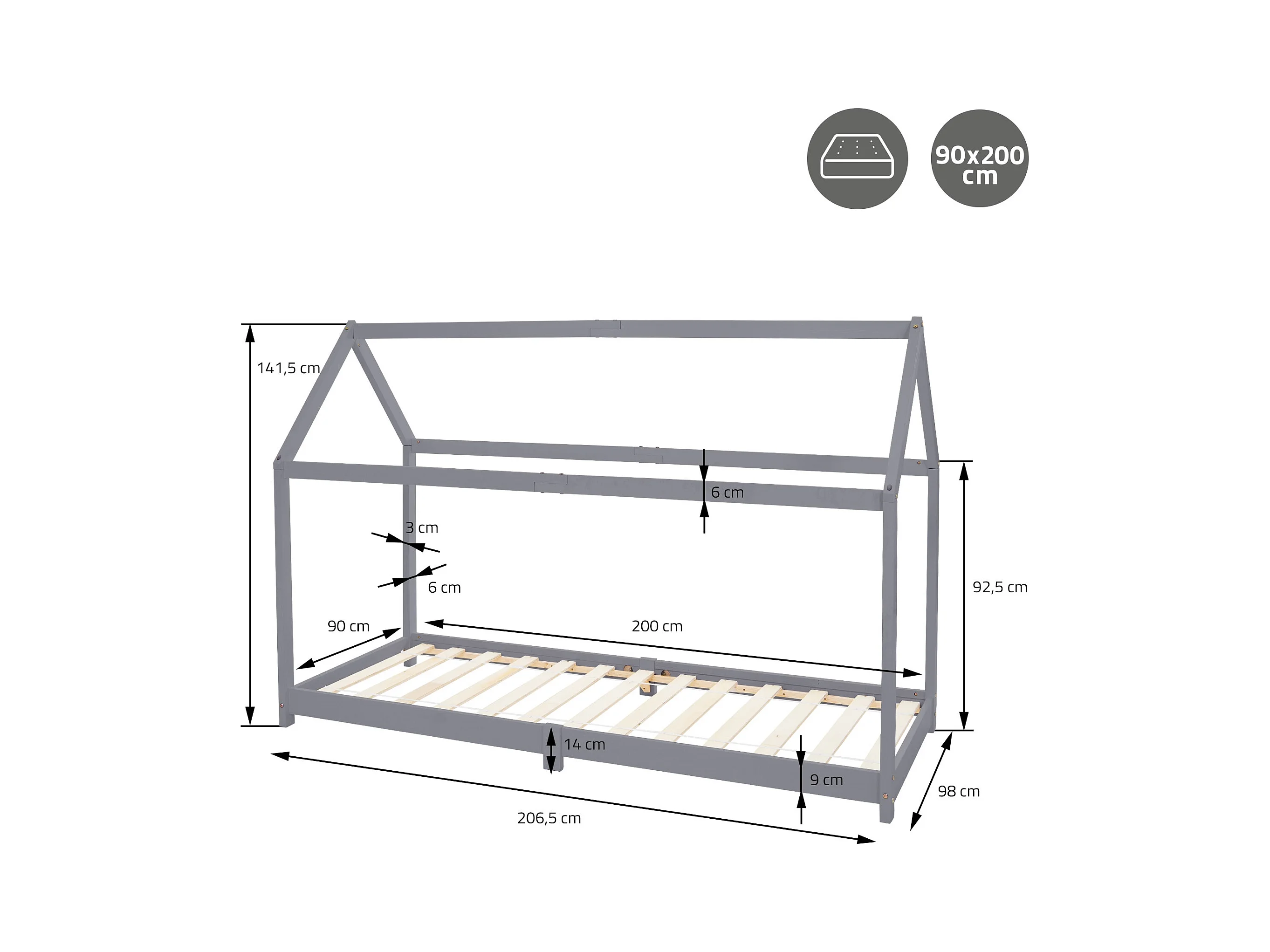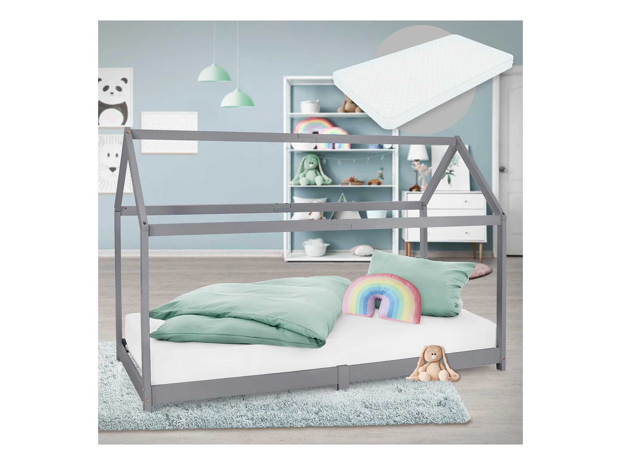 Lit d'enfants 90x200 cm gris clair style maison bois de pin massif matelas H10 cm housse amovible sommier protection anti-chute pour filles garçons