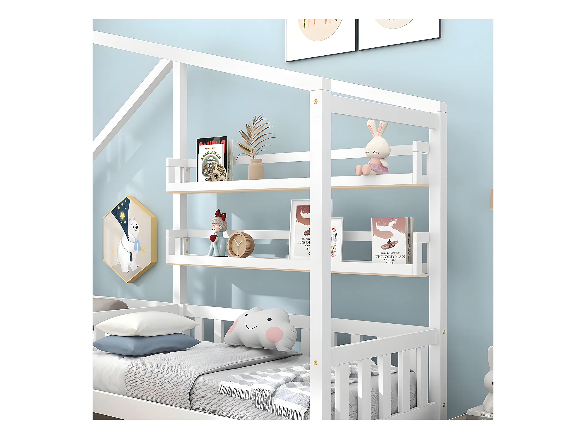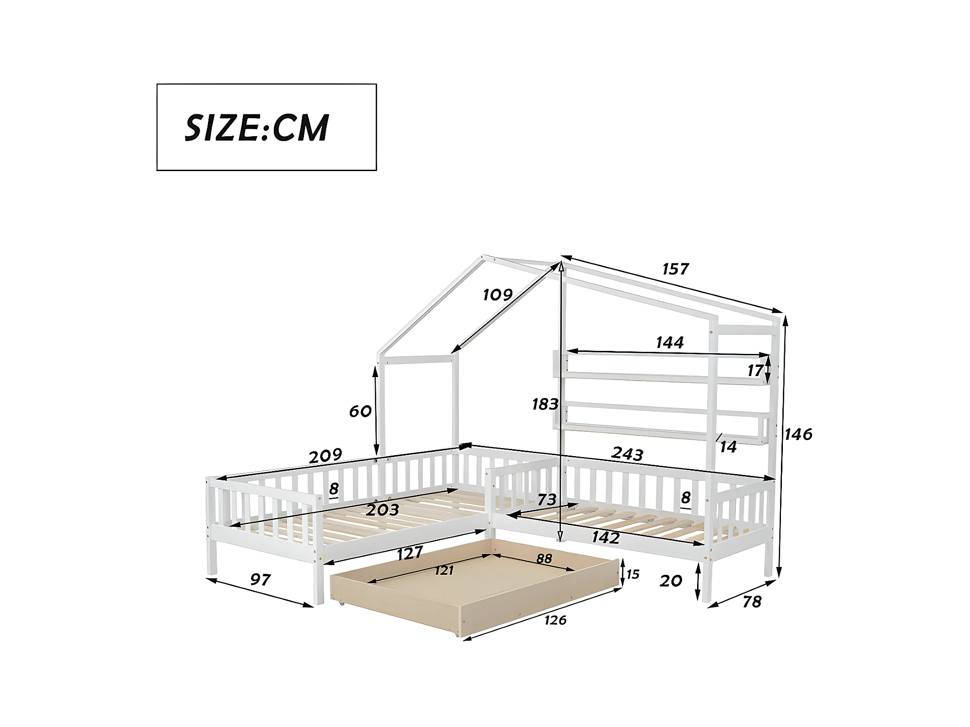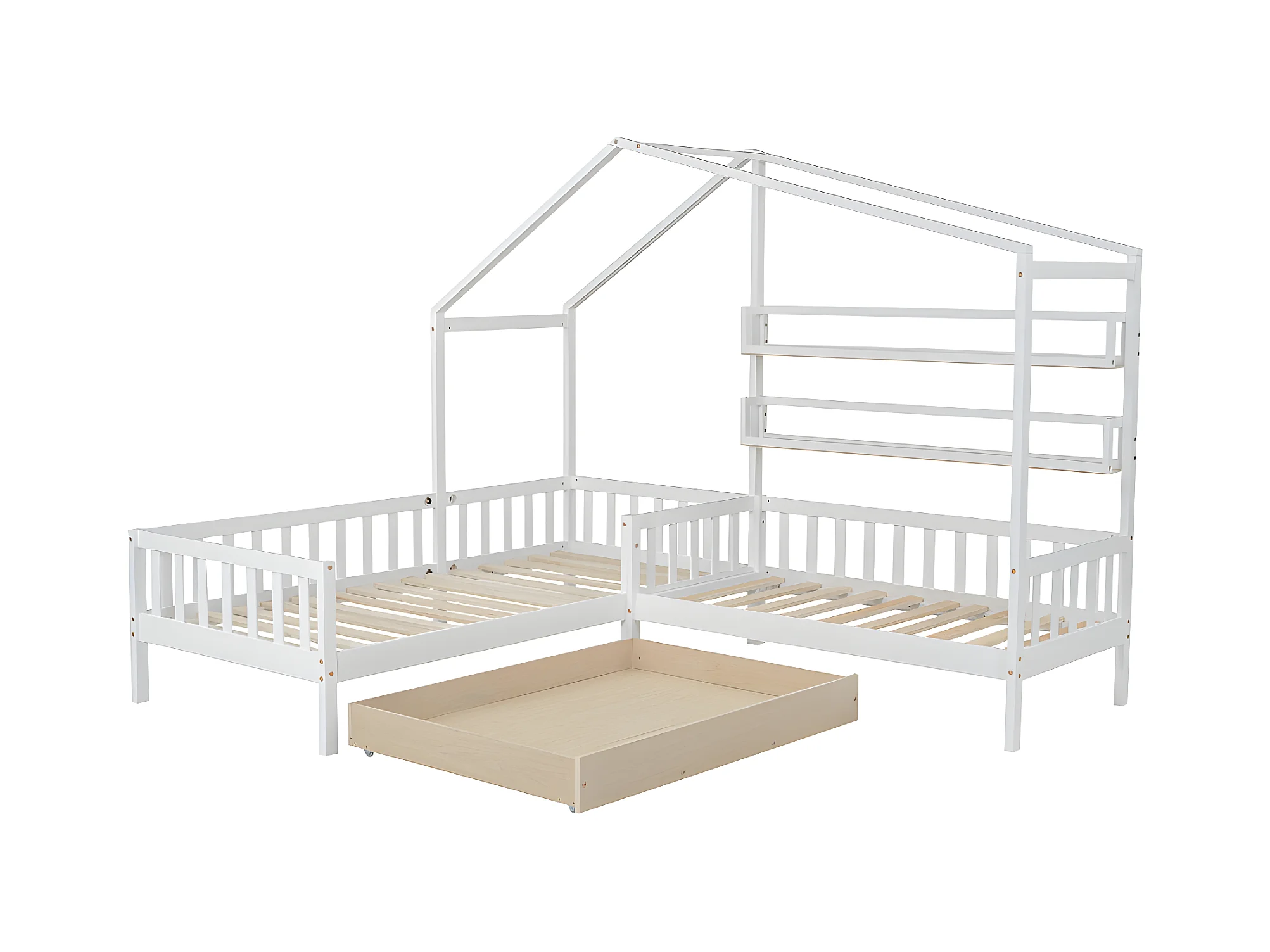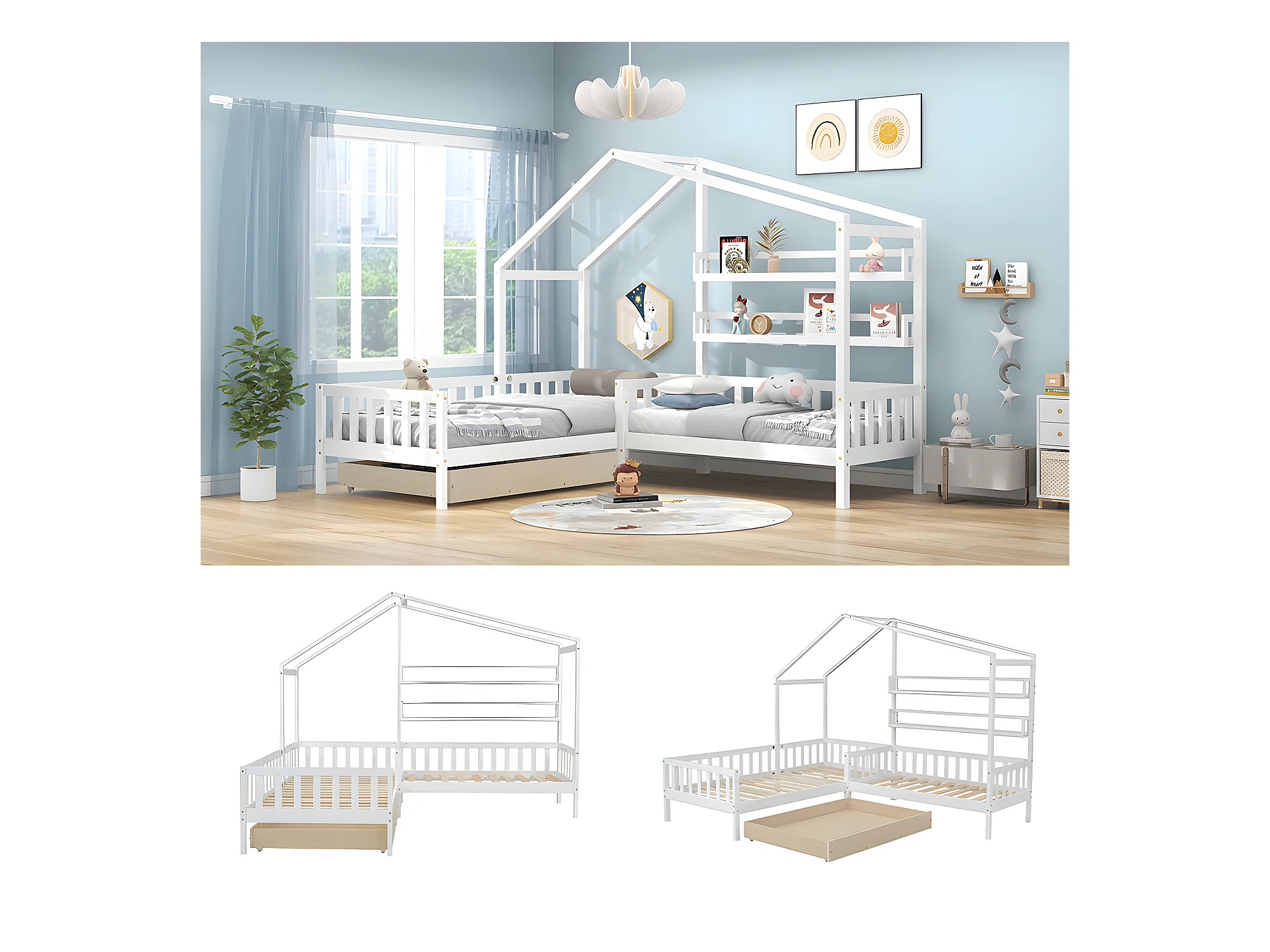 Lit d'enfant Lit de maison avec tiroirs et étagères, en bois massif avec clôture et sommier à lattes, structure en L, blanc (90x200 cm+140x70cm)