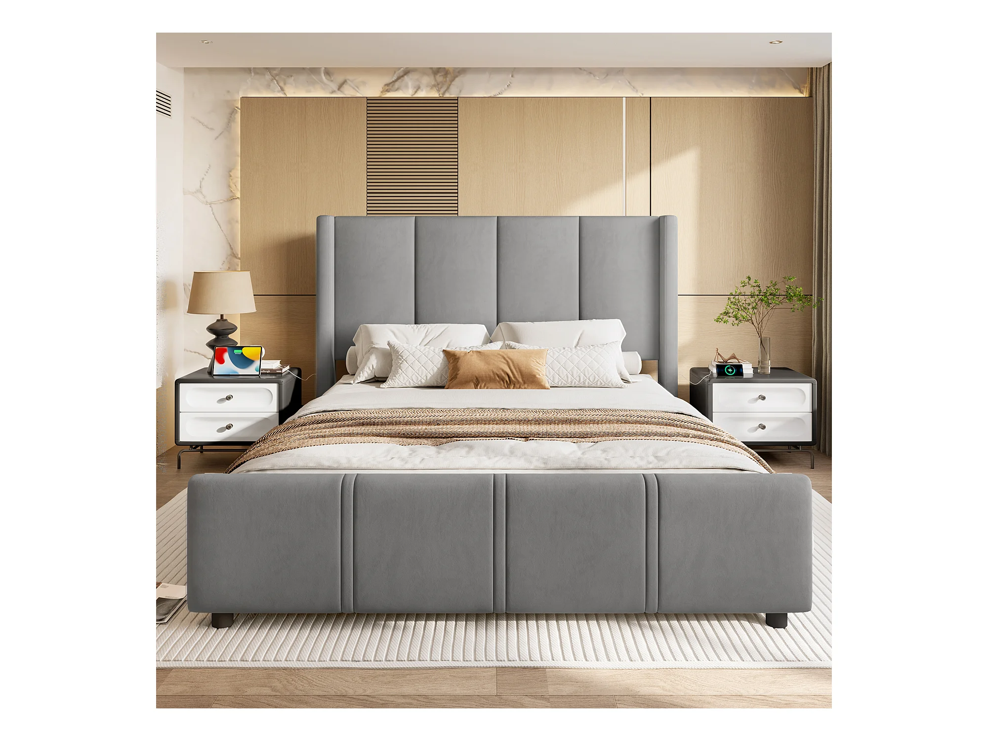 Lit Coffre Rembourré 140×200 Cm Velours Gris– Grand Tête De Lit - avec LED – Ports USB/USB‑C – Style Contemporain