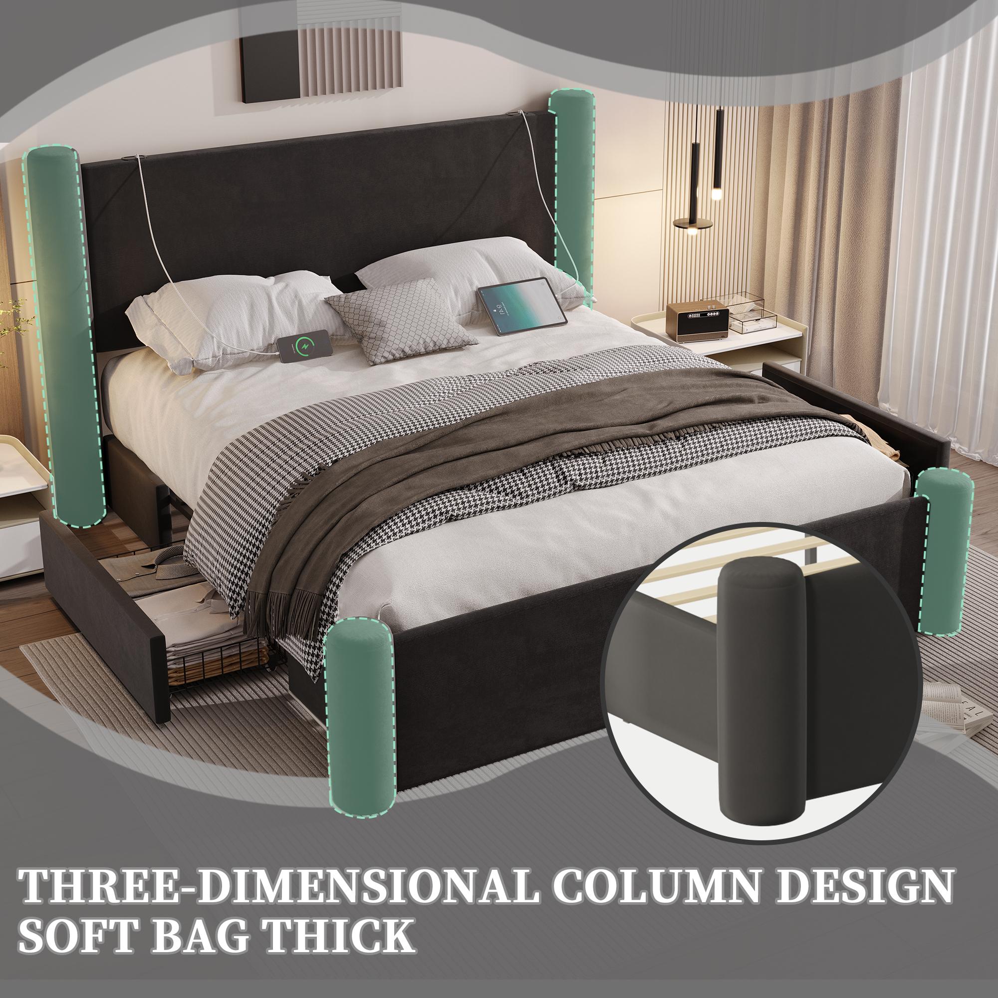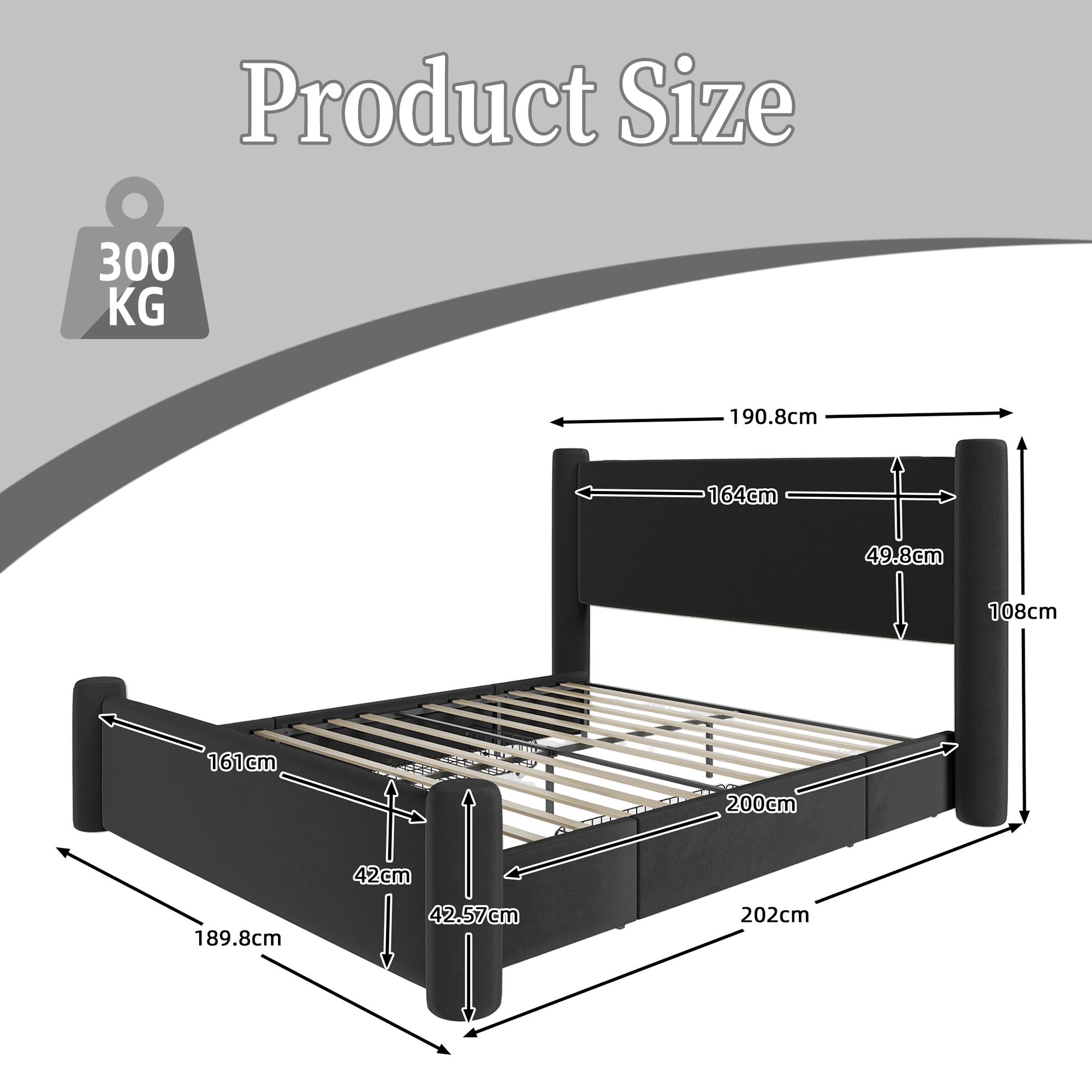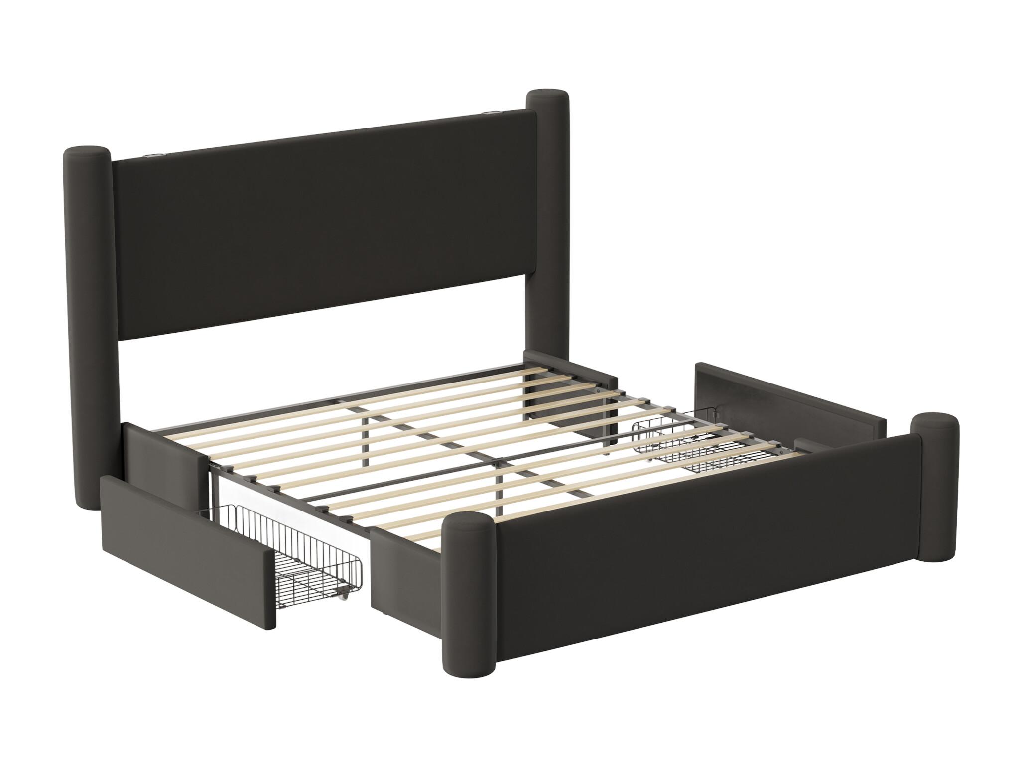 Lit coffre 160x200 cm - Lit rembourré en velours noir - avec tête de lit à colonnes - 2 tiroirs et port USB – Design élégant et pratique