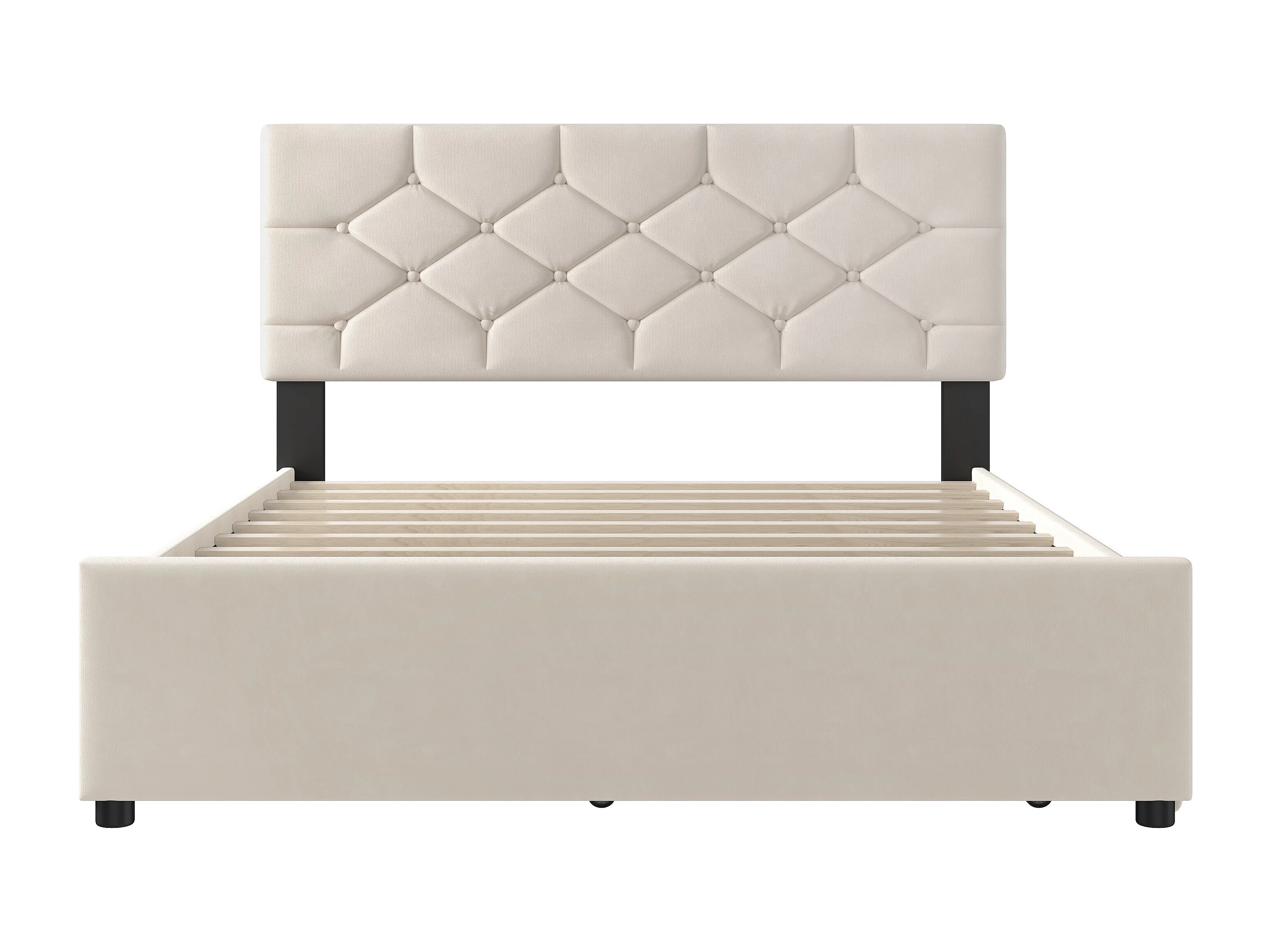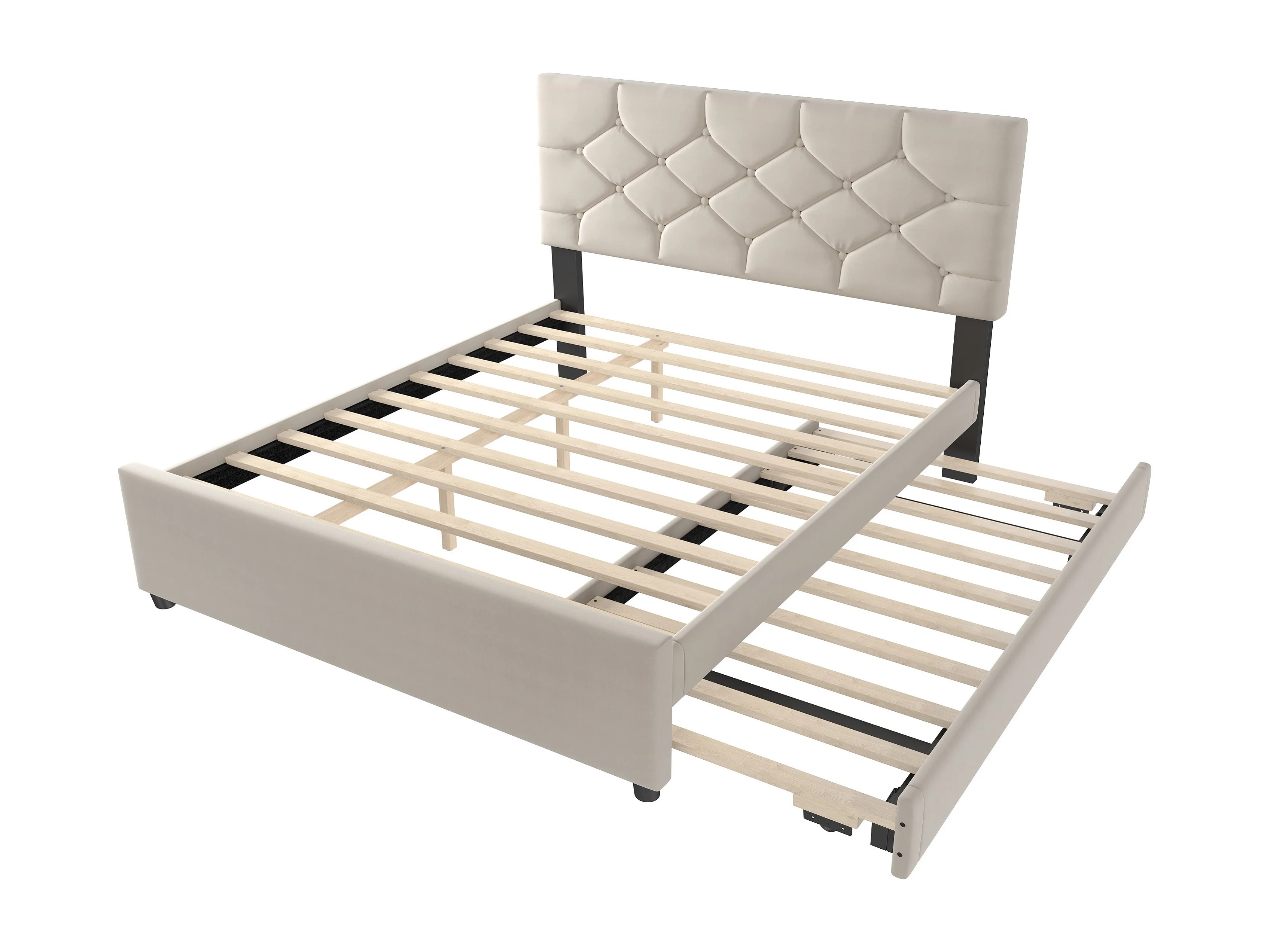 Lit double 140 x 200 cm, velours beige, avec lit gigogne et sommier à lattes - sans matelas
