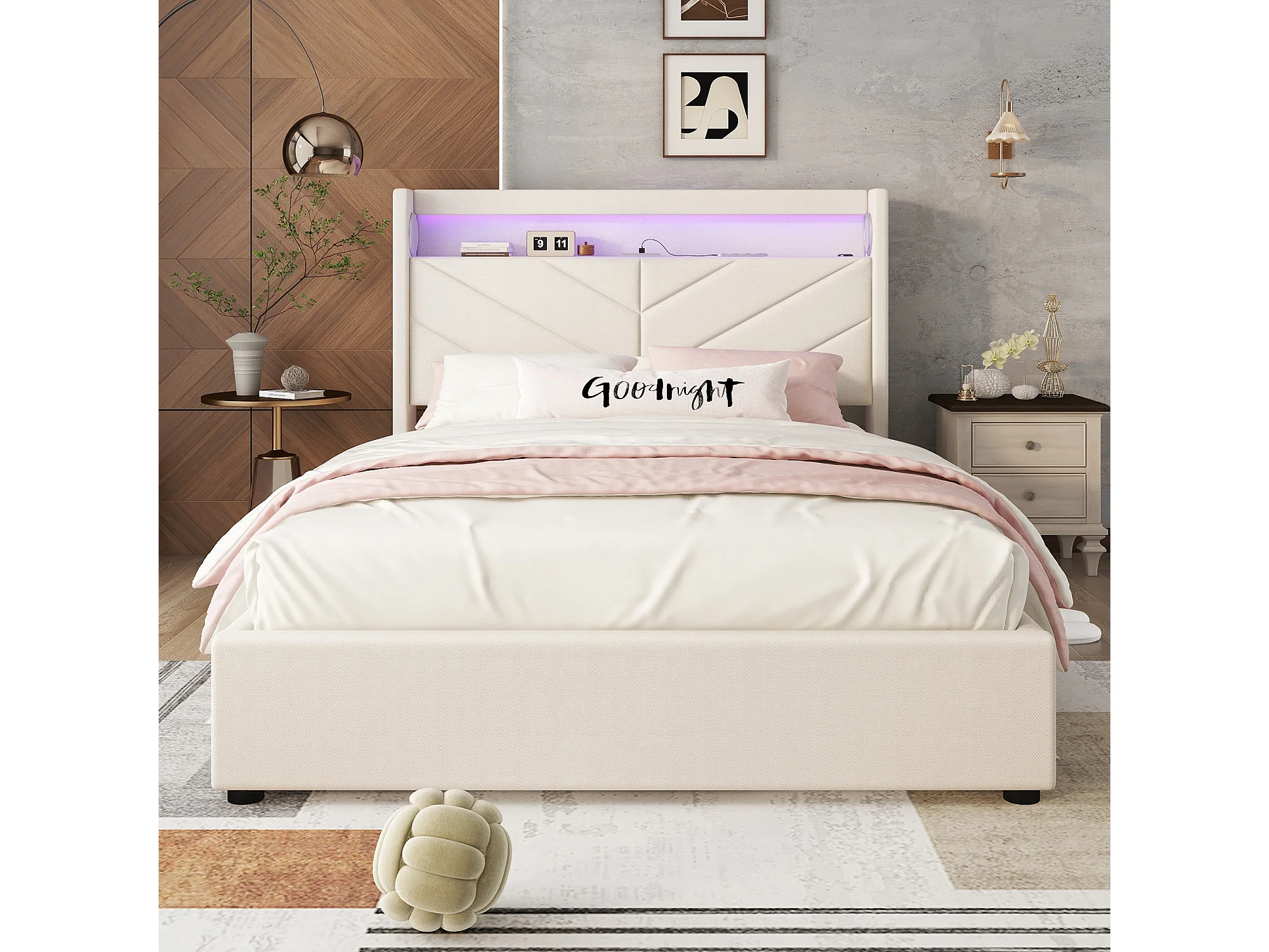 Lit double 140x190 cm, sans matelas, lit rembourré avec hydrau, LED télécommandée, USB et enceinte, Lin Beige