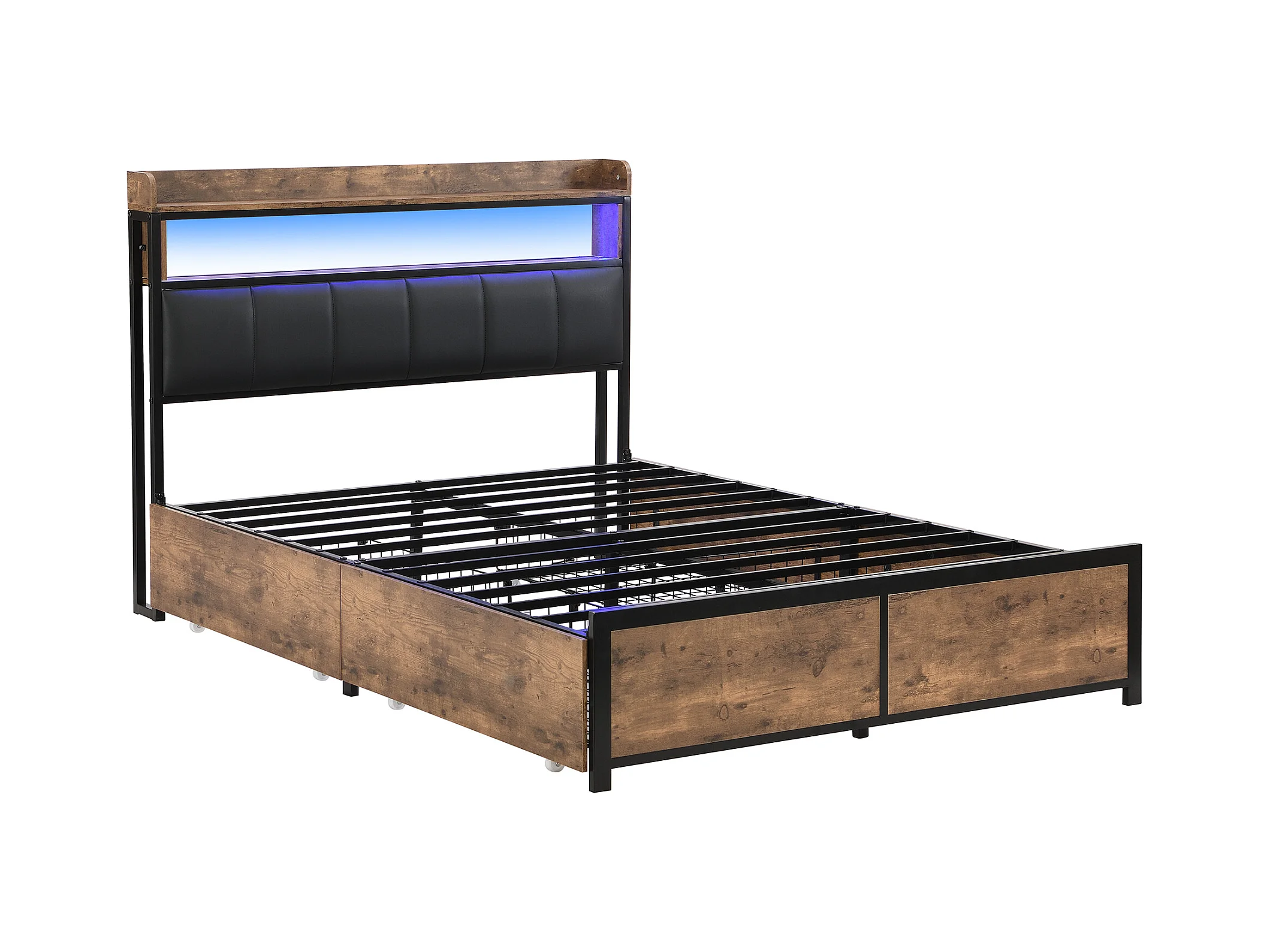 Lit adulte 140x200 cm avec 4 tiroirs - avec sommier à lattes et tête de lit, LED - PU, Noir(sans matelas)