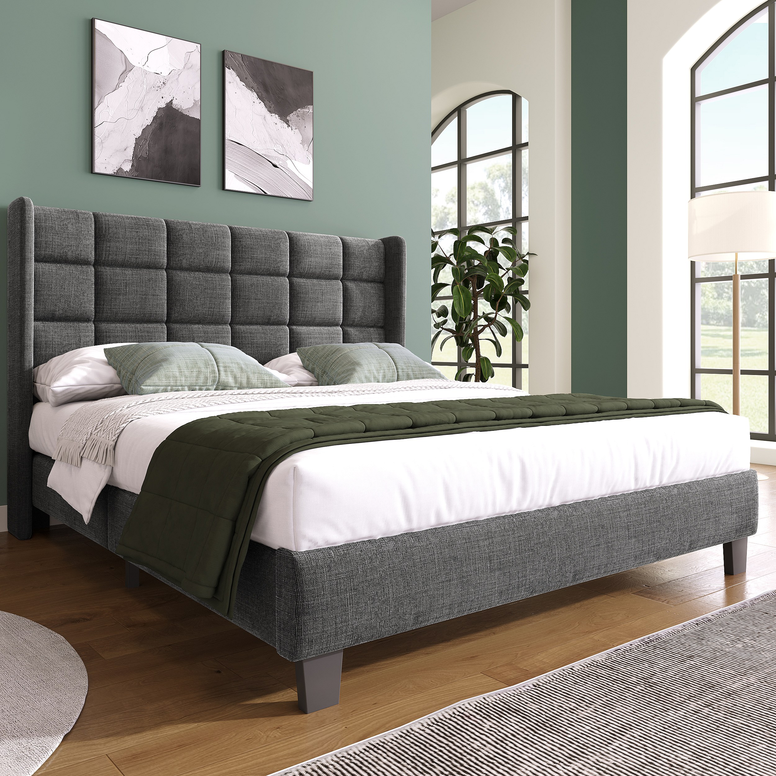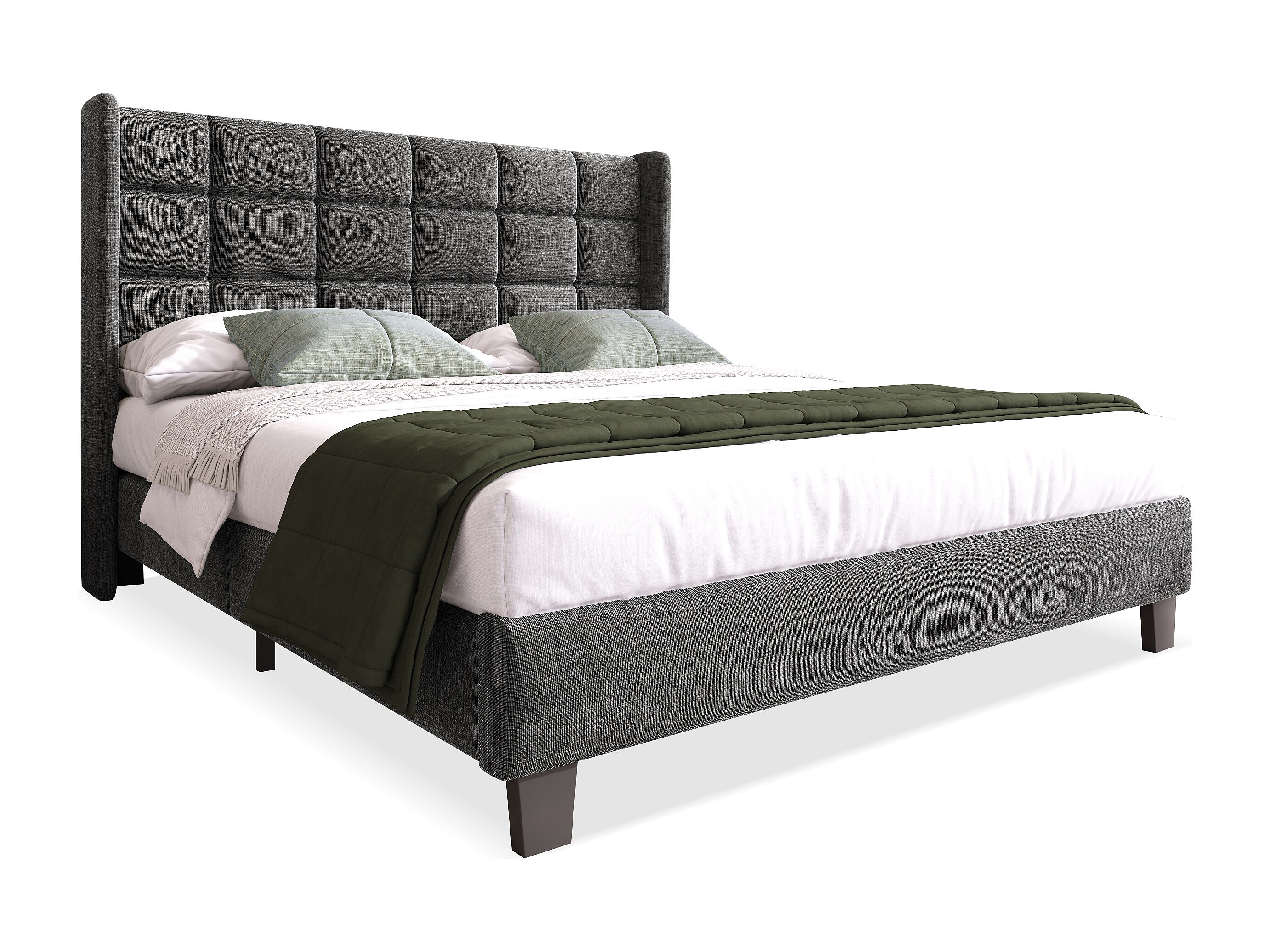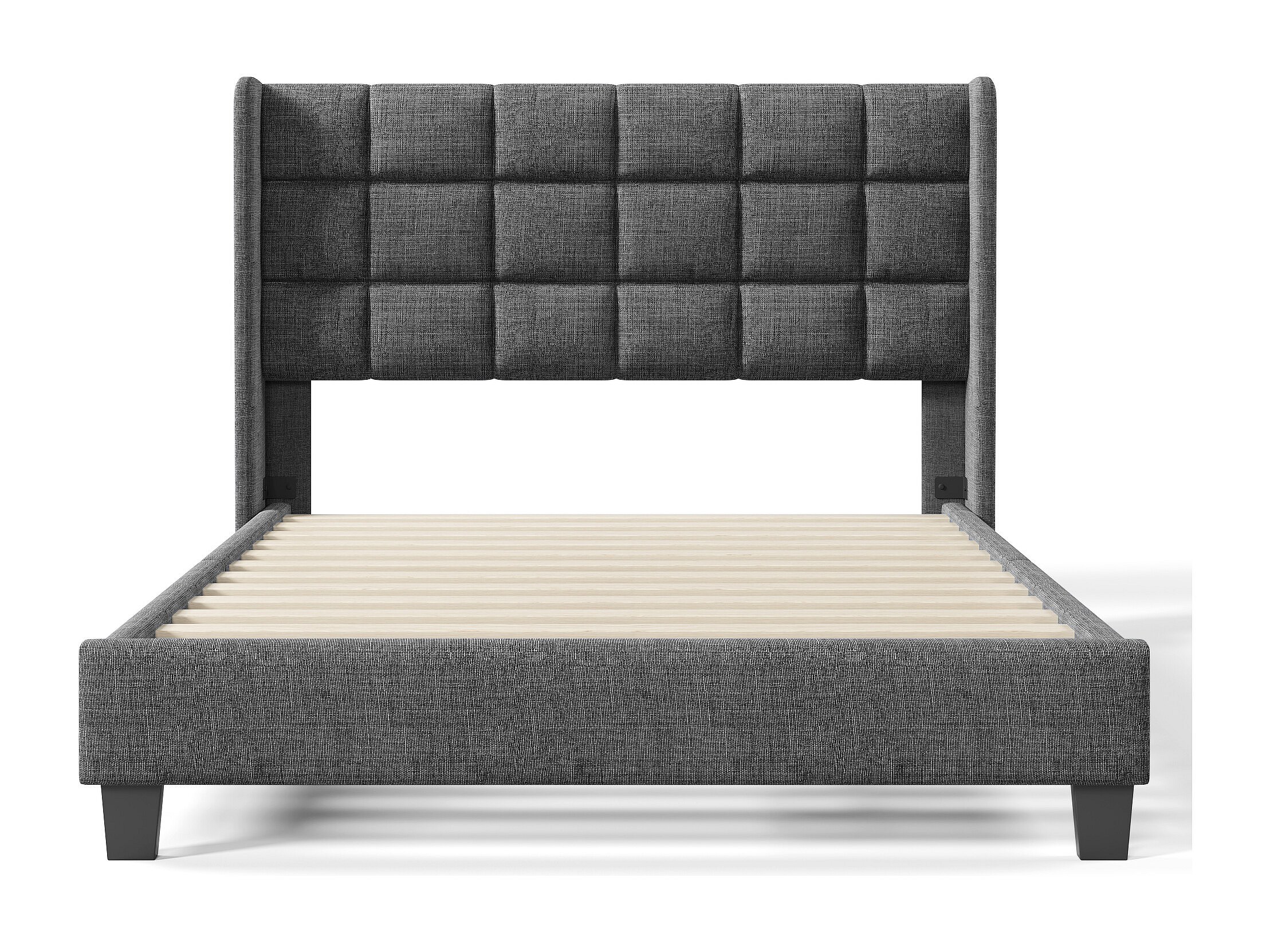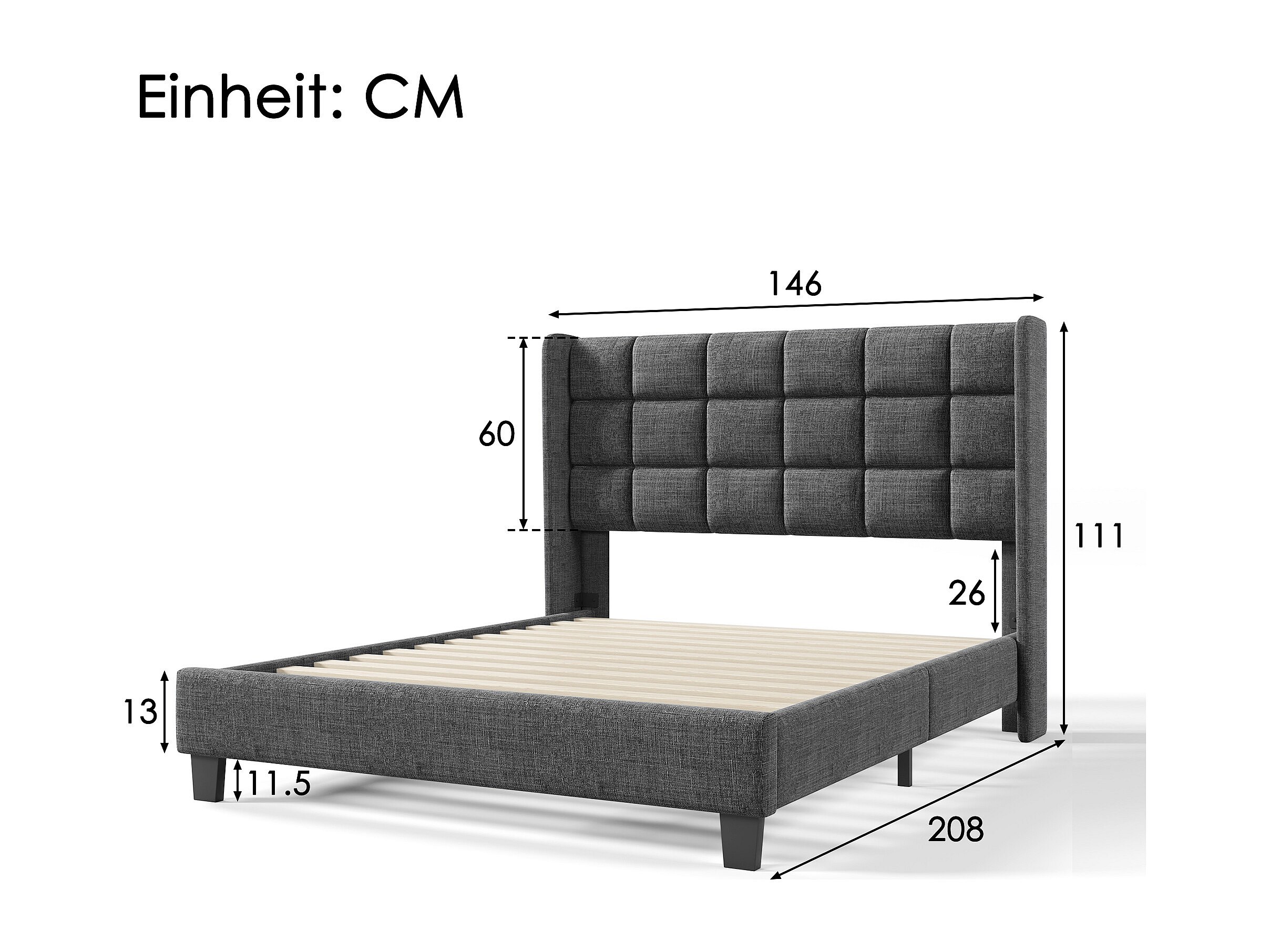 Lit double 140x200 cm avec tête de lit rembourrée en lin gris et sommier à lattes, sans matelas