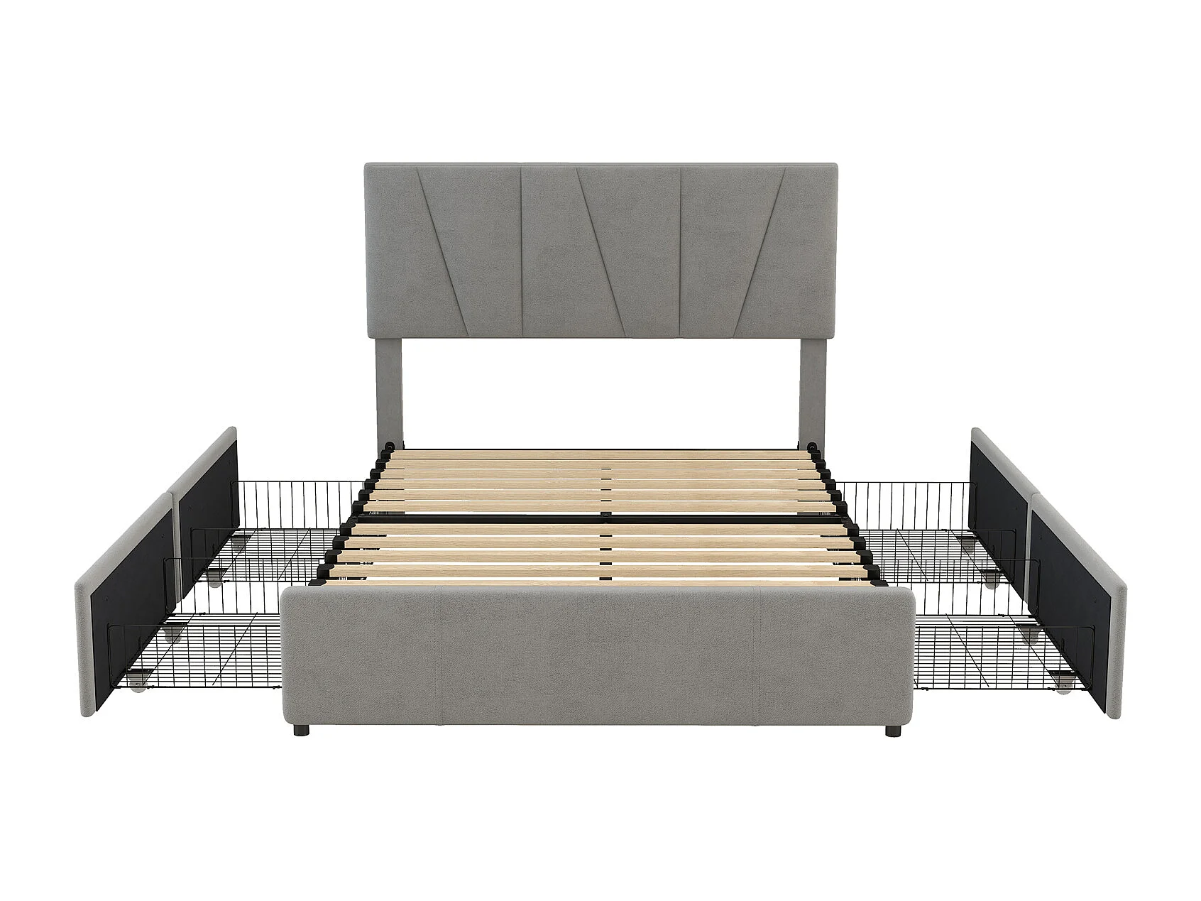 Lit double 140x200 cm en tissu gris – 4 tiroirs latéraux et tête de lit réglable, lit coffre capitonné