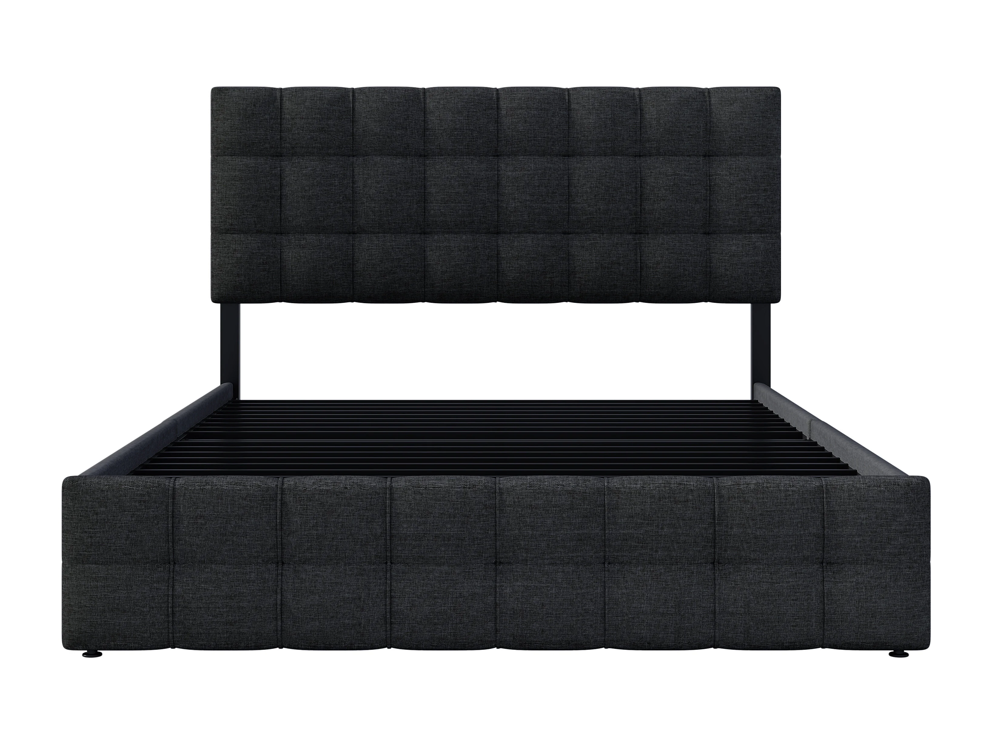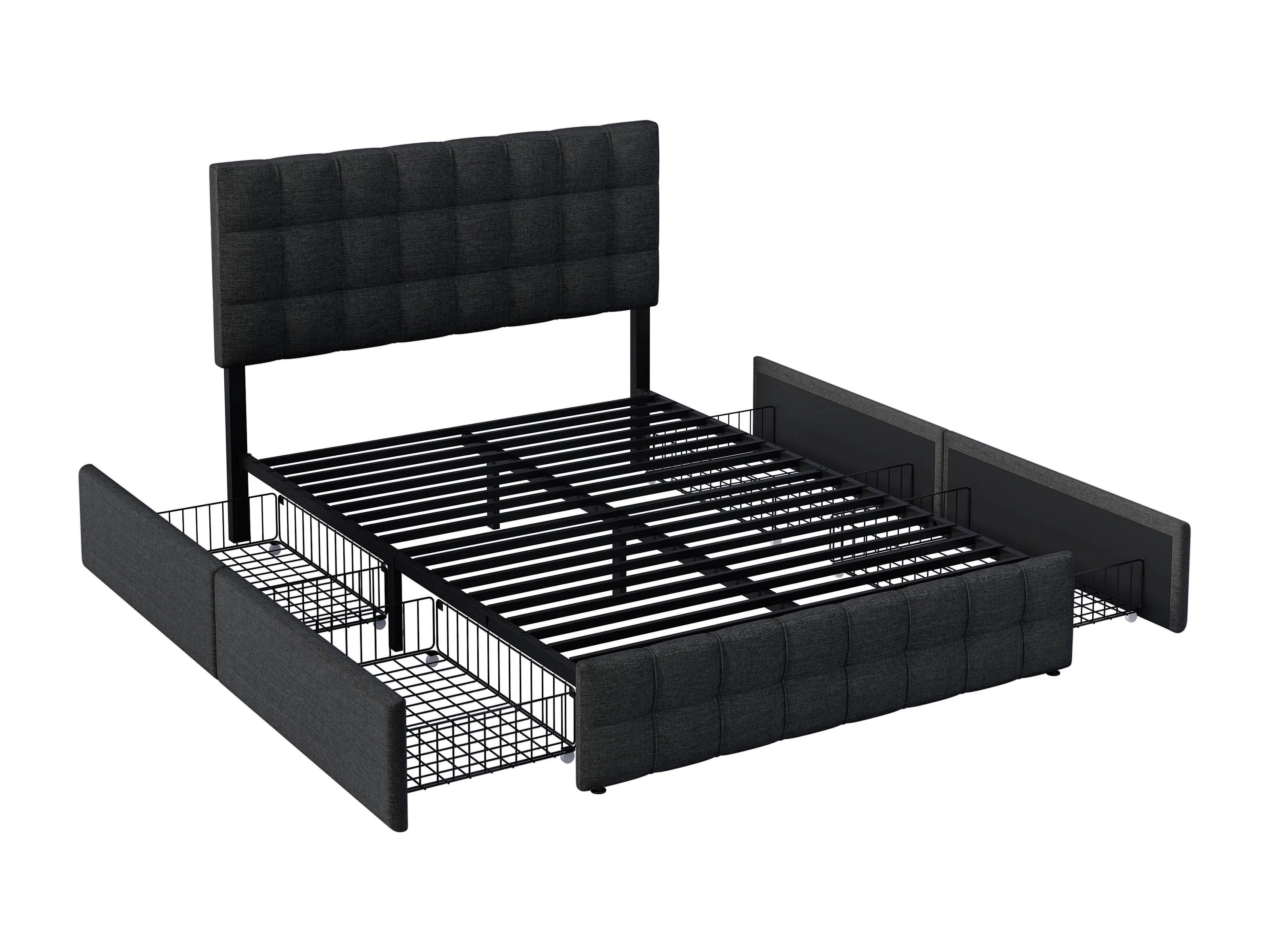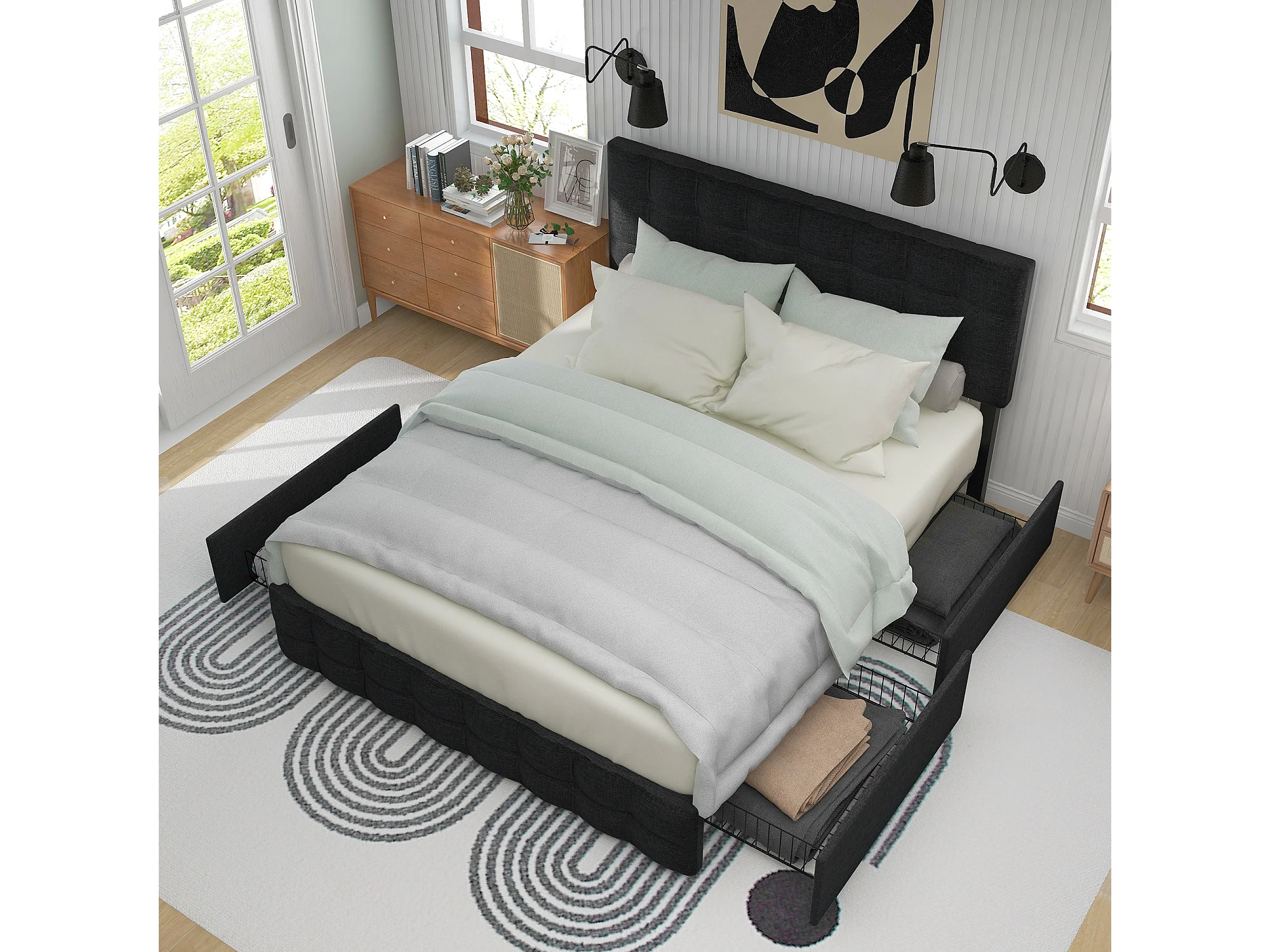 Lit double 140x200 cm - Lit adulte avec 4 tiroirs de rangement - Tête de lit réglable - Lin noir