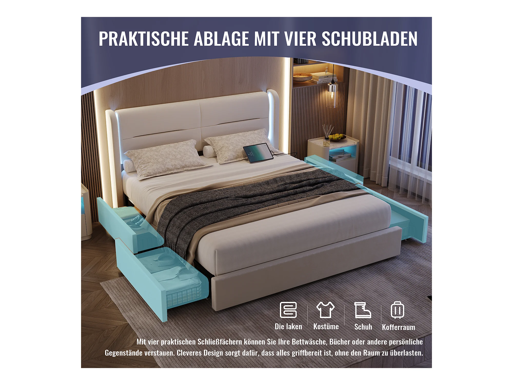 Lit adulte 140x200 cm - Tête de lit avec LED - Beige (sans matelas)