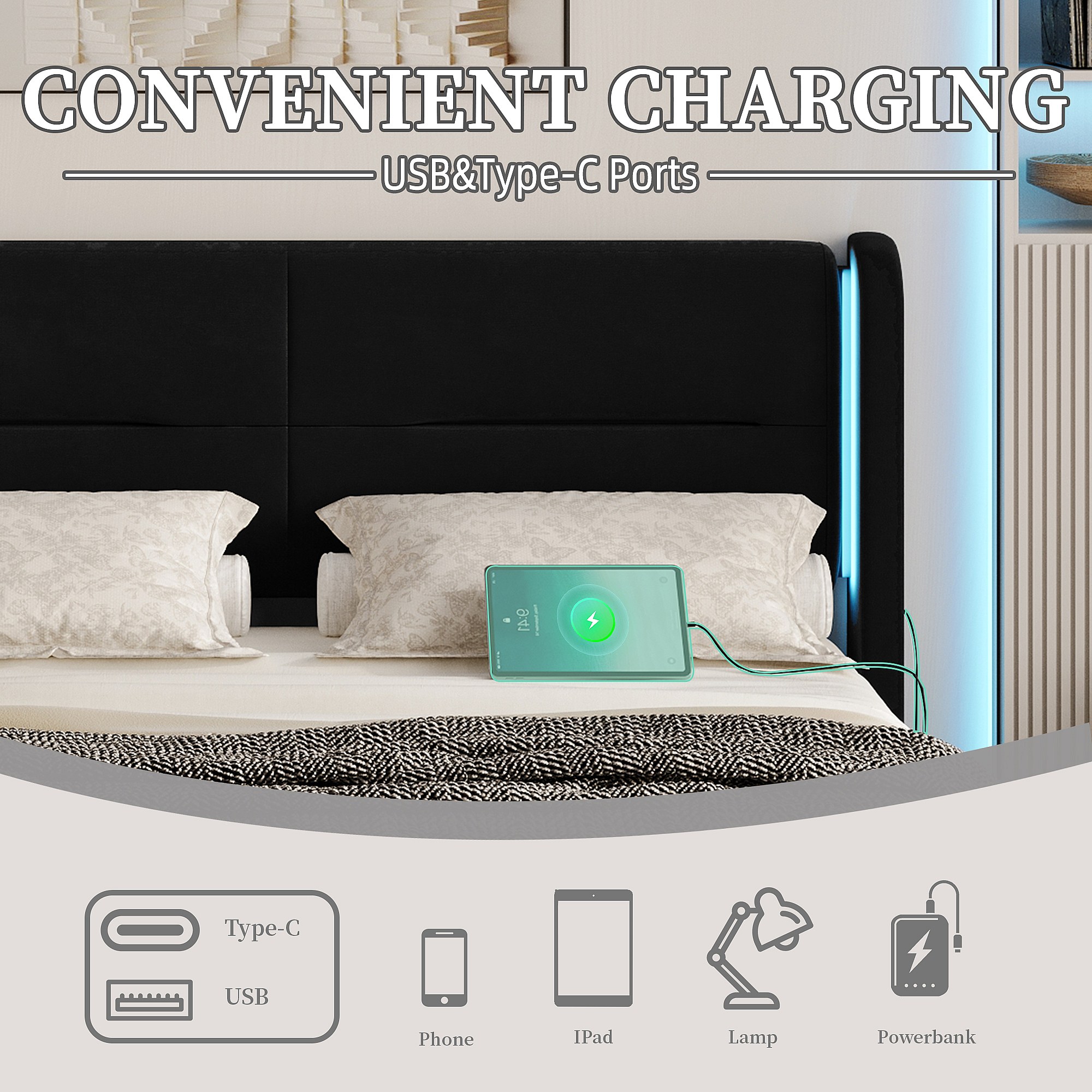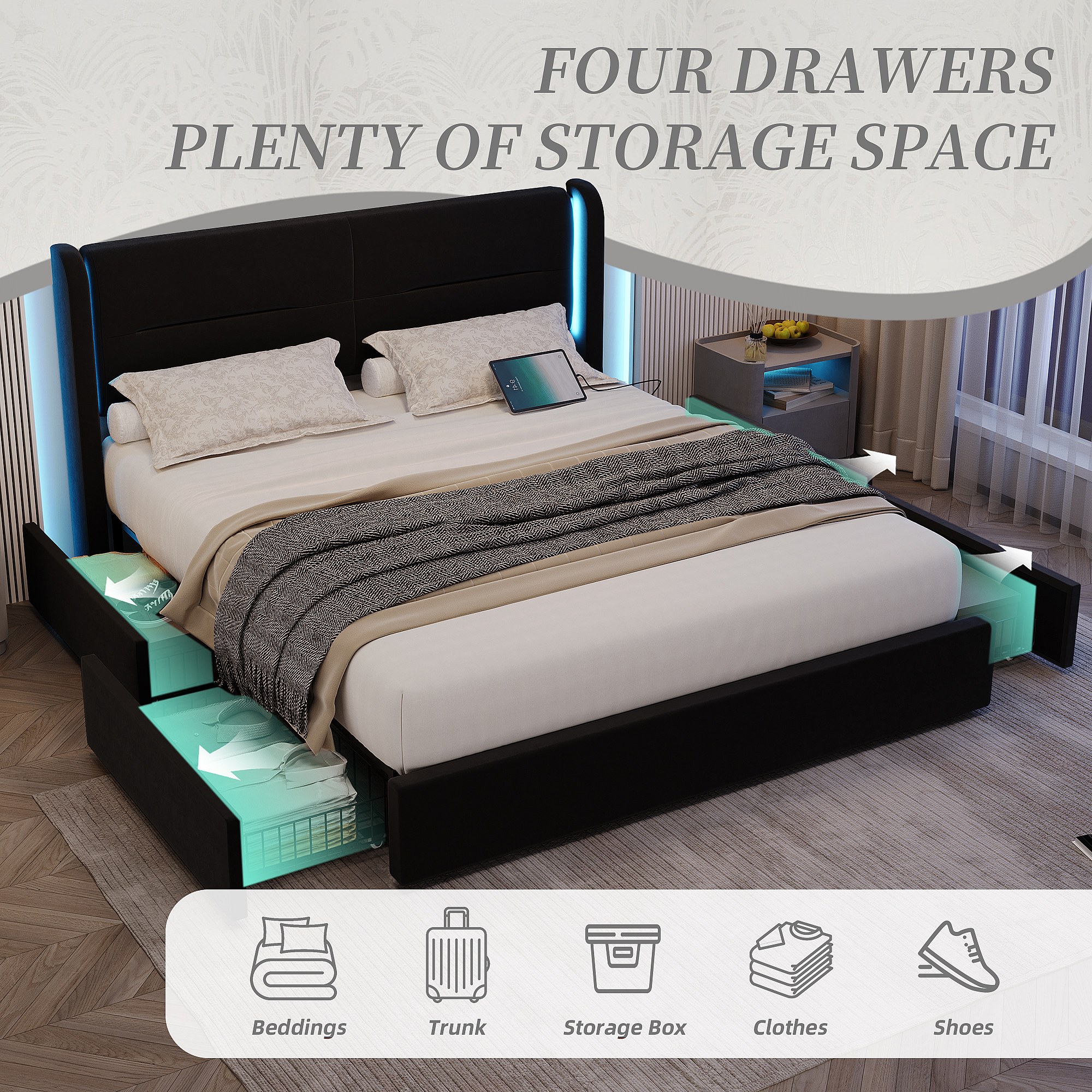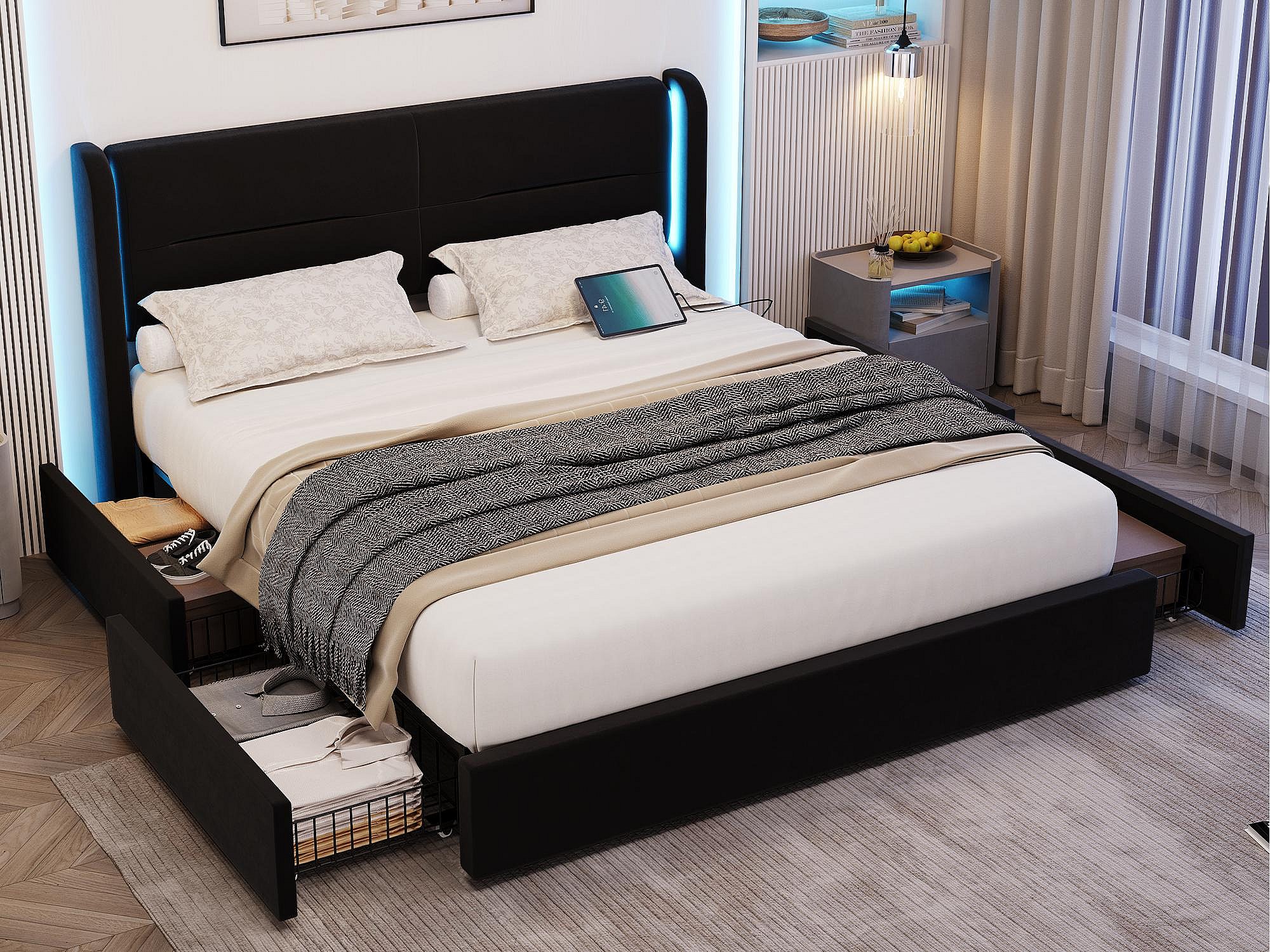 Lit Coffre 140×200 cm - Lit Rembourré en Velours Noir – Tête de Lit LED – 4 Tiroirs – Ports USB/USB‑C – Style Contemporain