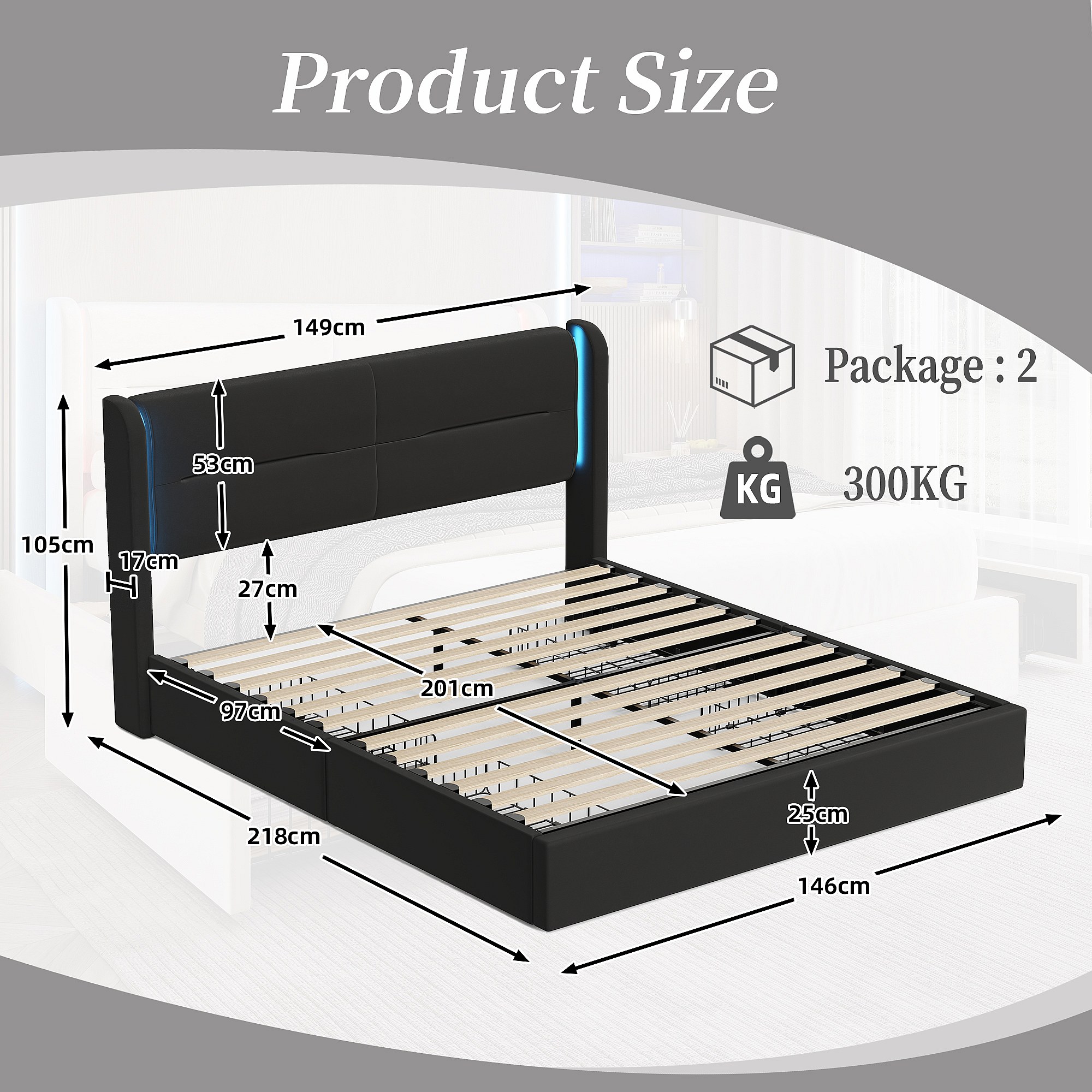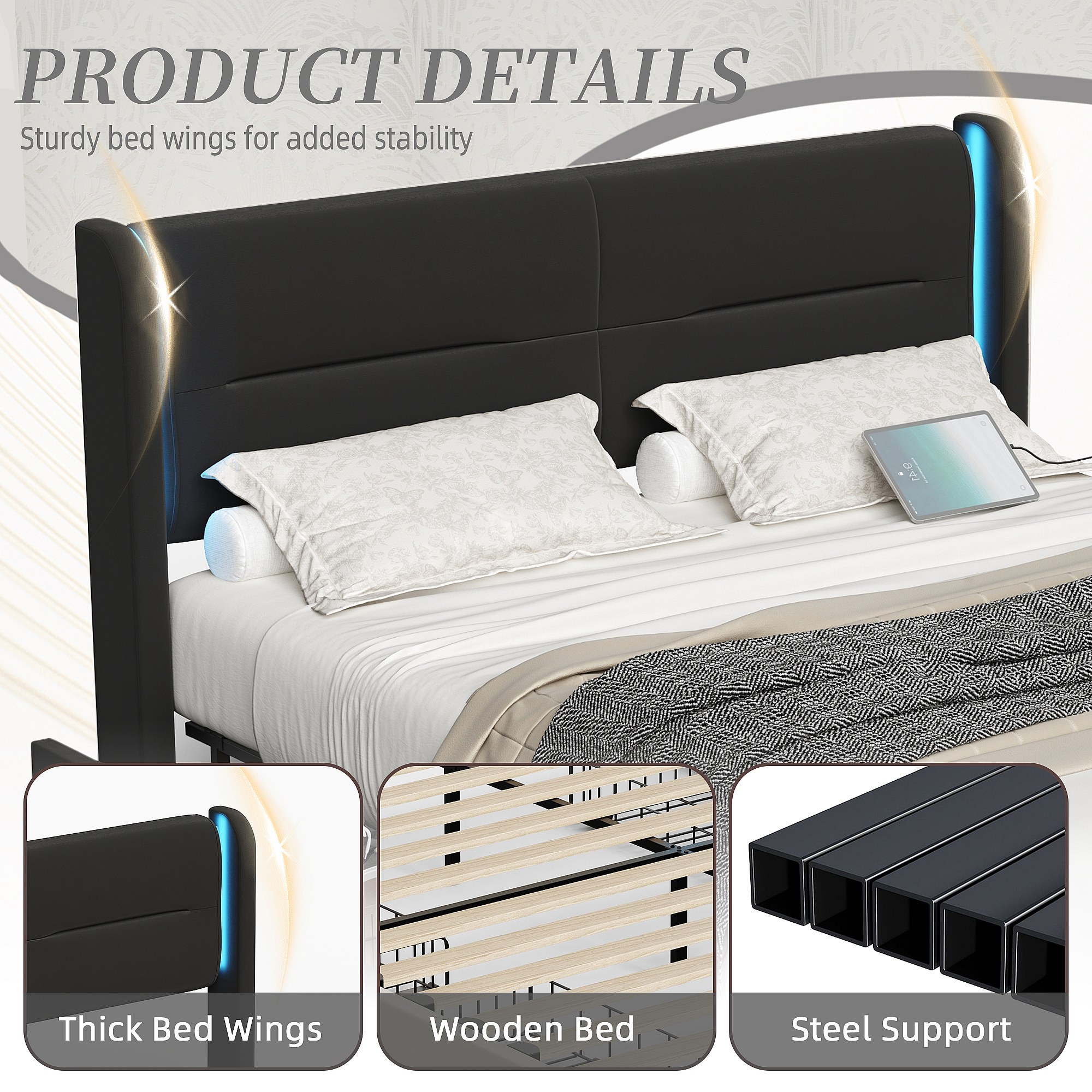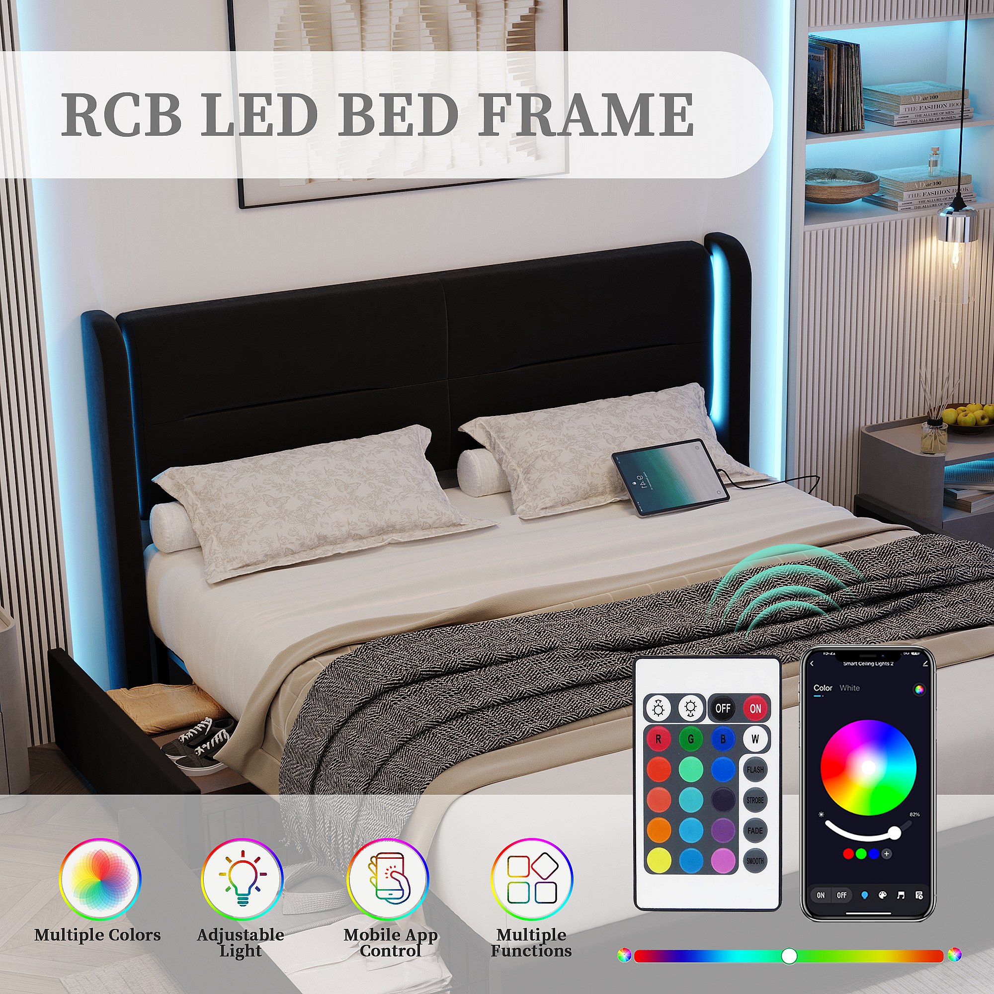 Lit Coffre 140×200 cm - Lit Rembourré en Velours Noir – Tête de Lit LED – 4 Tiroirs – Ports USB/USB‑C – Style Contemporain