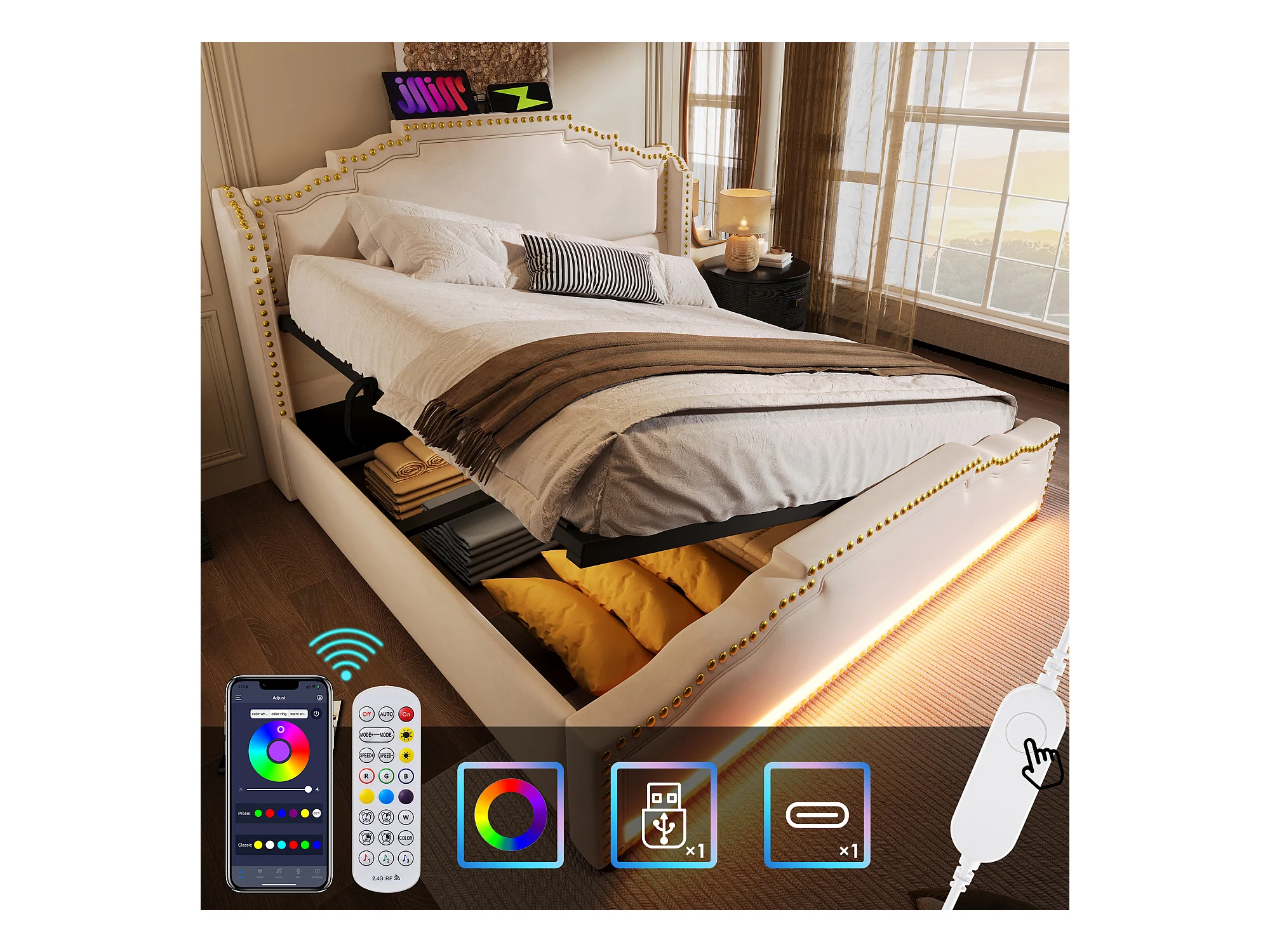 Lit double 160x200 avec espace de rangement hydraulique, éclairage LED et prise USB-C, en velours beige (213x170x120 cm)