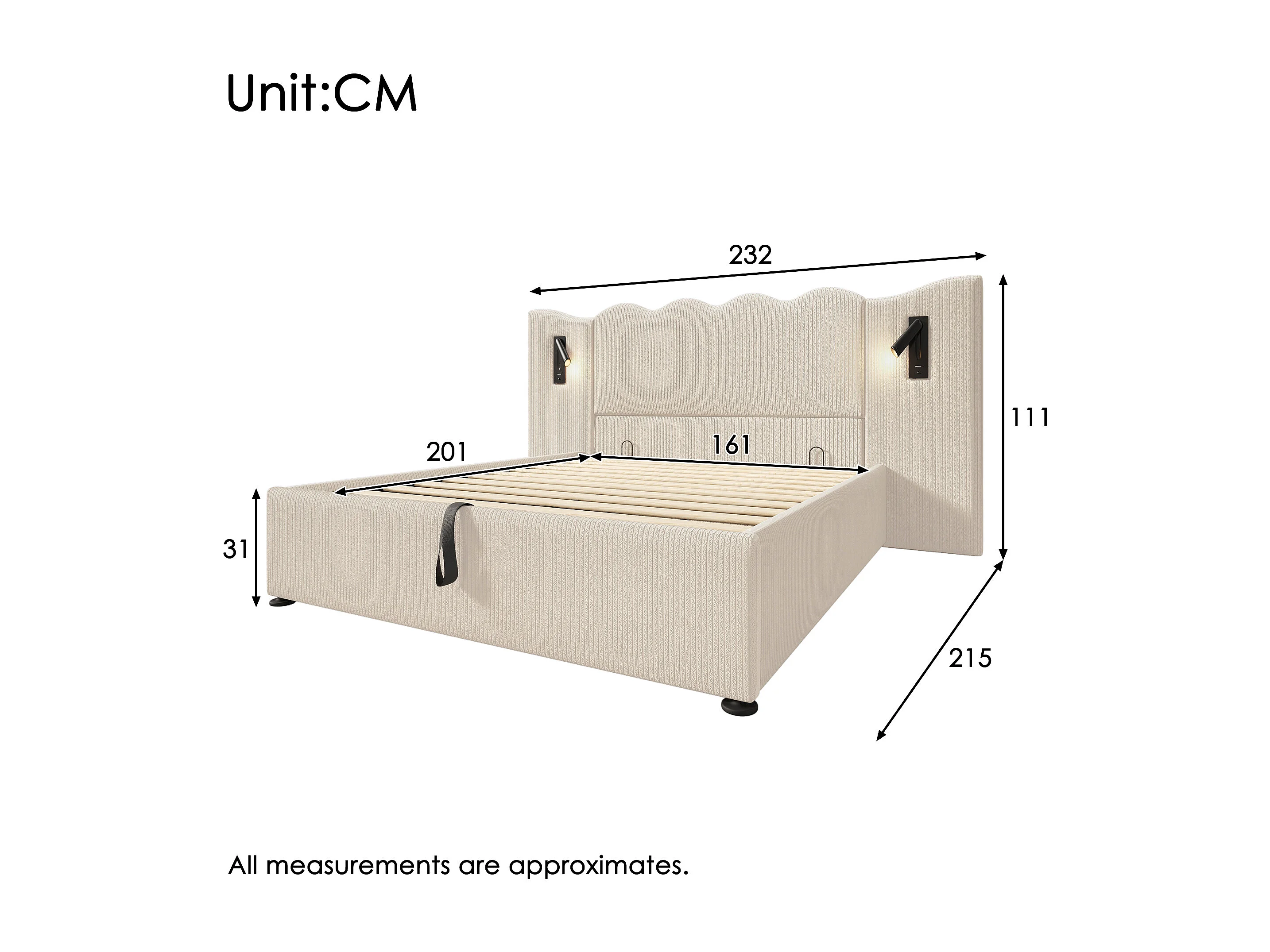 Lit double 160x200 avec lampe de lecture et chargeur USB Type-C, cadre en corduroy beige-blanc, bois massif et métal (215x232x111 cm)
