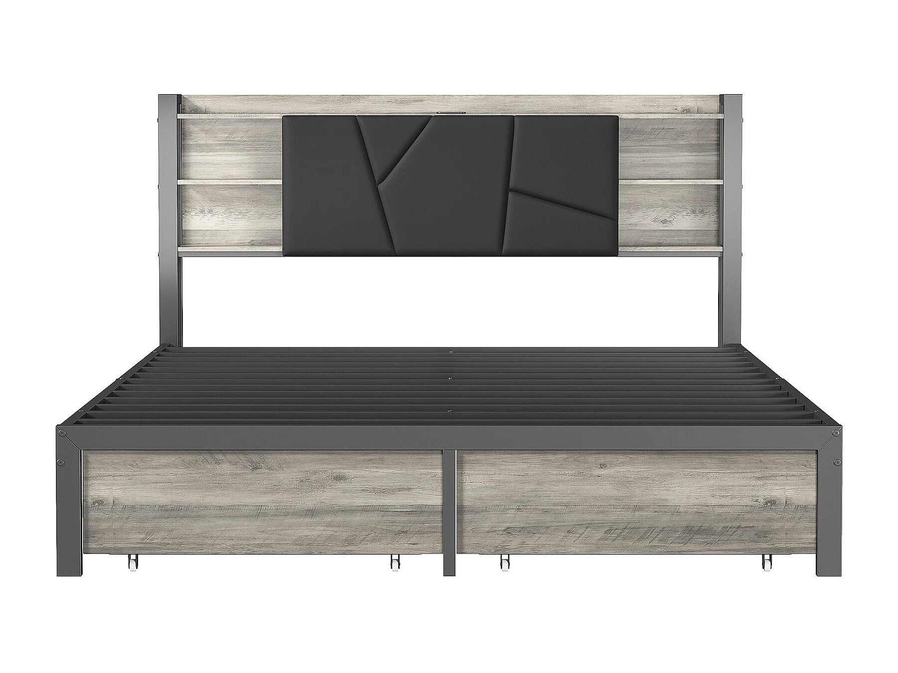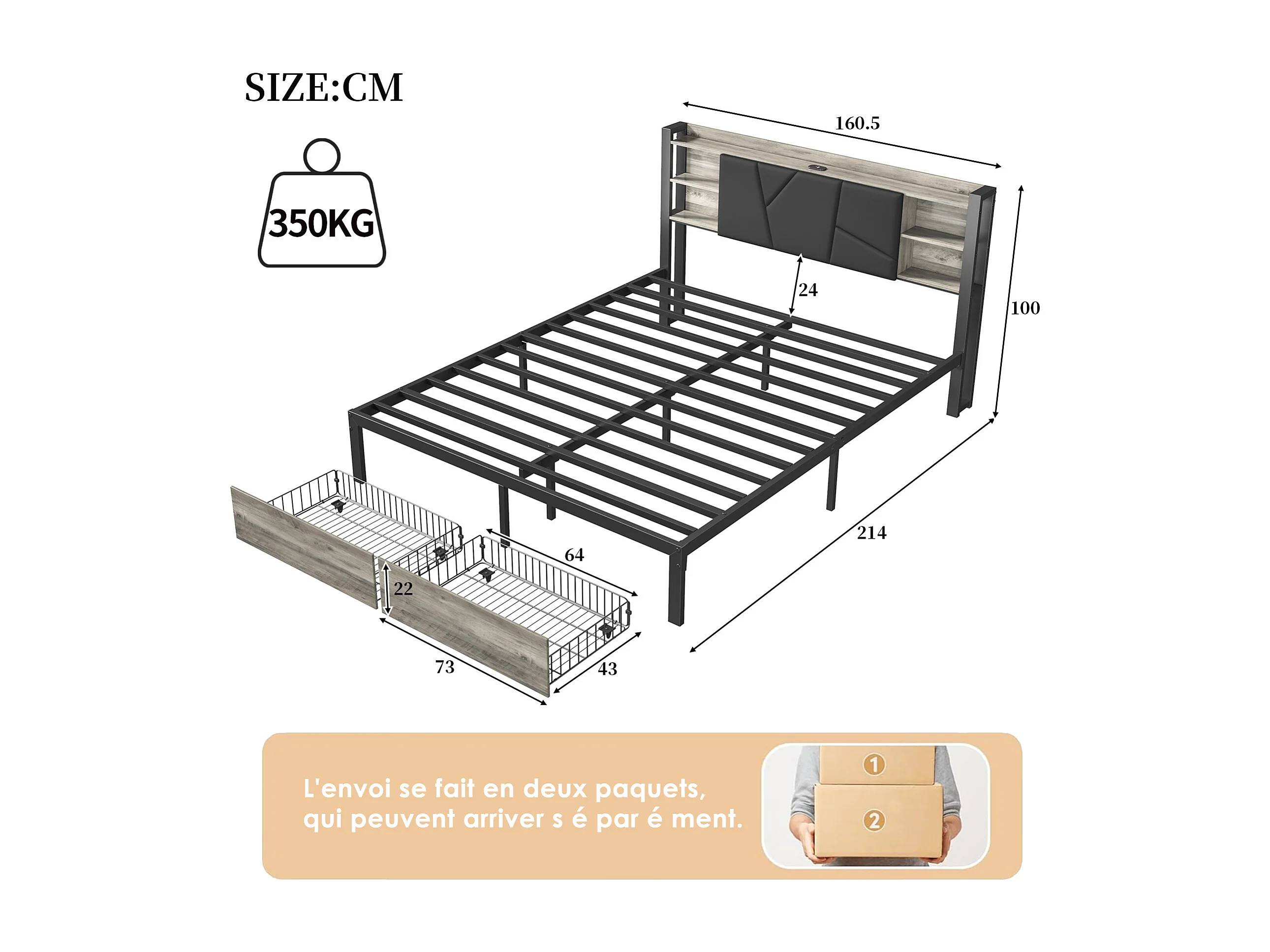 Lit double 160x200 avec tiroirs rembourré - lit 160x200 cm avec LED et USB - lit adulte 160x200 cm avec sommier à lattes- capitonné en tissu PU - noir