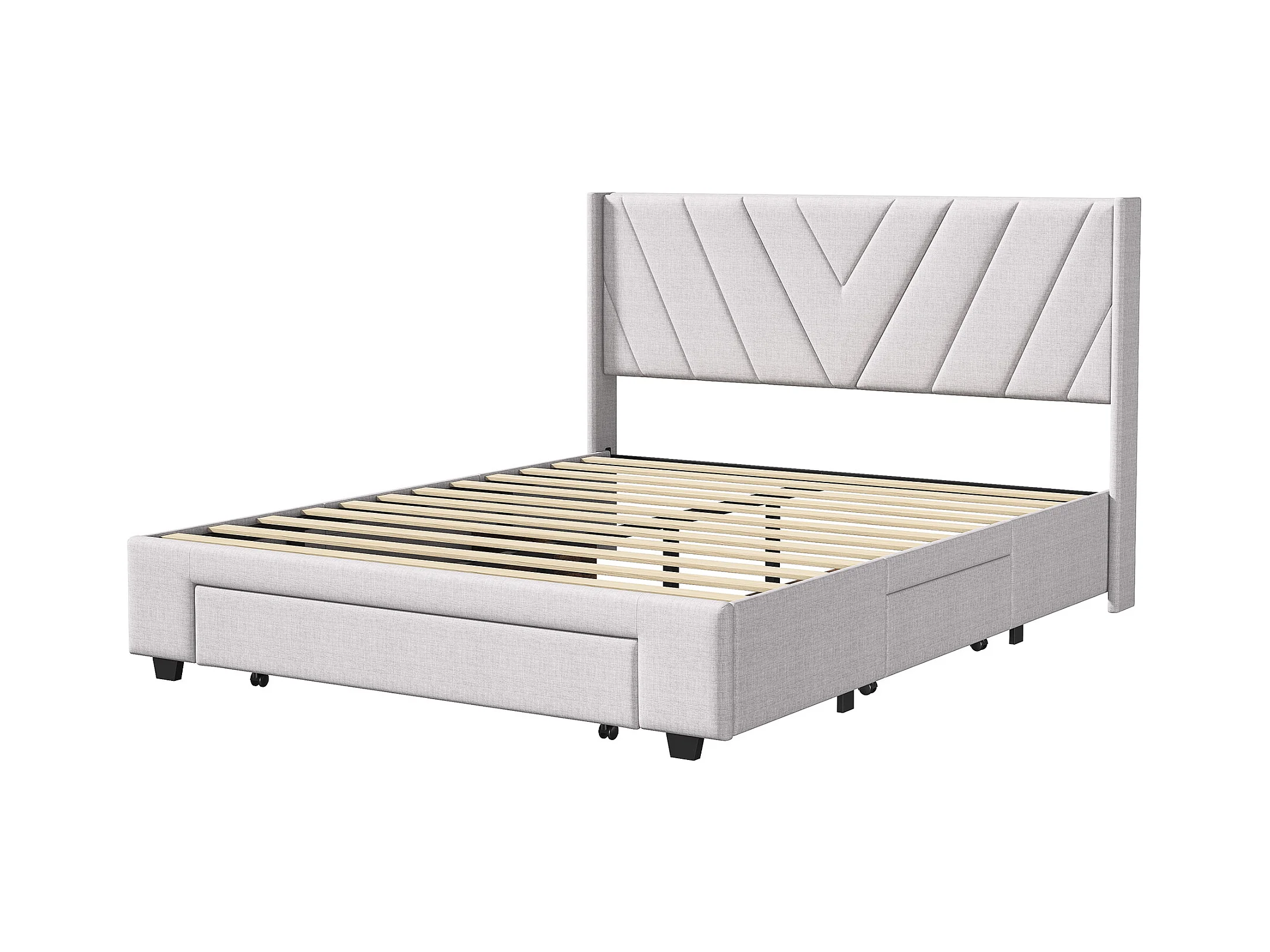 Lit Double 160x200 cm avec Tiroir , Lit Rembourré avec Sommier à Lattes en Bois , Lin , Beige