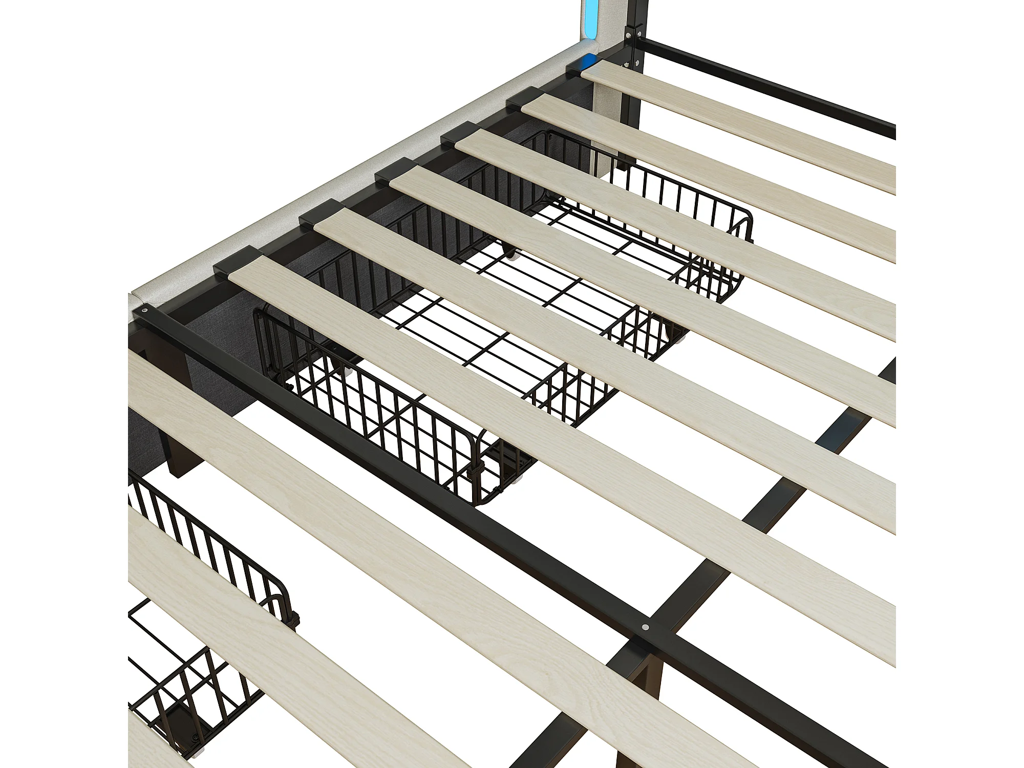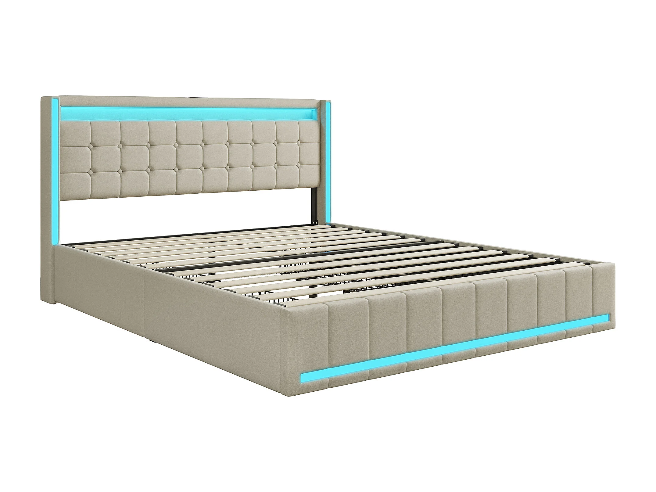 Lit double 160x200 cm en lin beige – Tête et pied de lit avec LED, 4 tiroirs métalliques, ports USB & Type-C