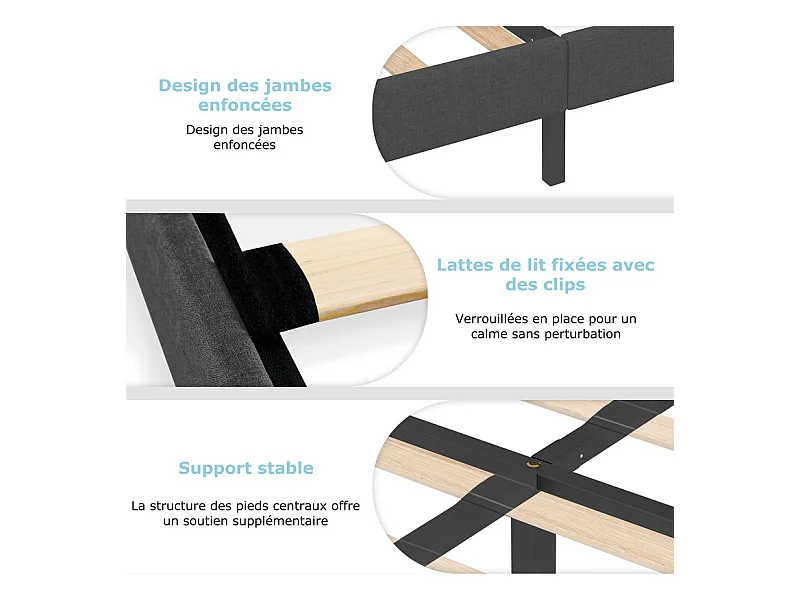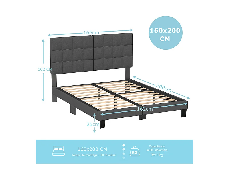 Lit Double 160x200 cm INRE- Structure de Lit avec Sommier à Lattes - Lit Capitonné avec Tête de Lit - Lit Adulte pour 2 Personne - gris foncé