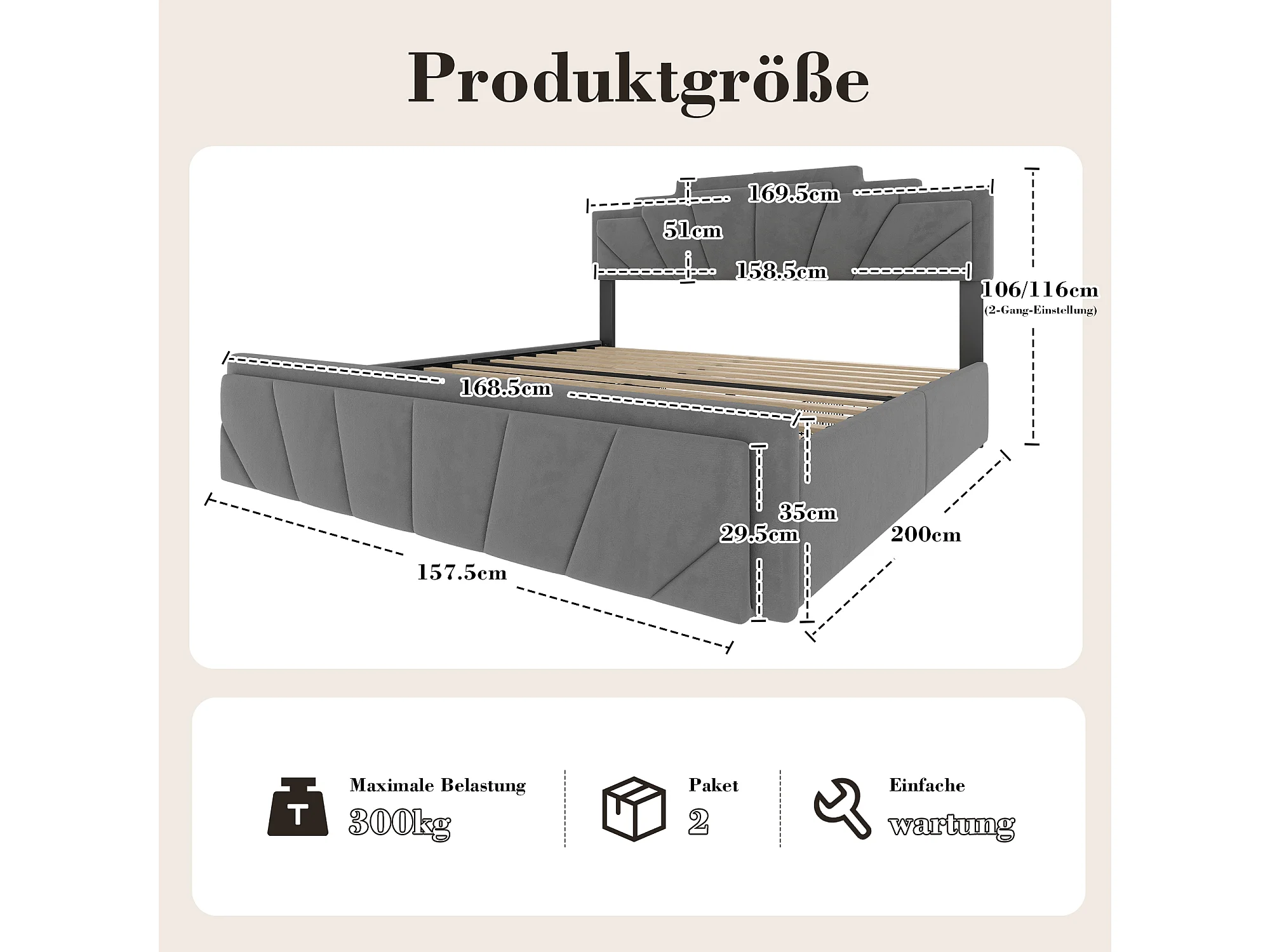 Lit coffre rembourré 160x200 cm en velours gris - avec 4 tiroirs - ports USB et Type-C - éclairage LED RGB - design futuriste