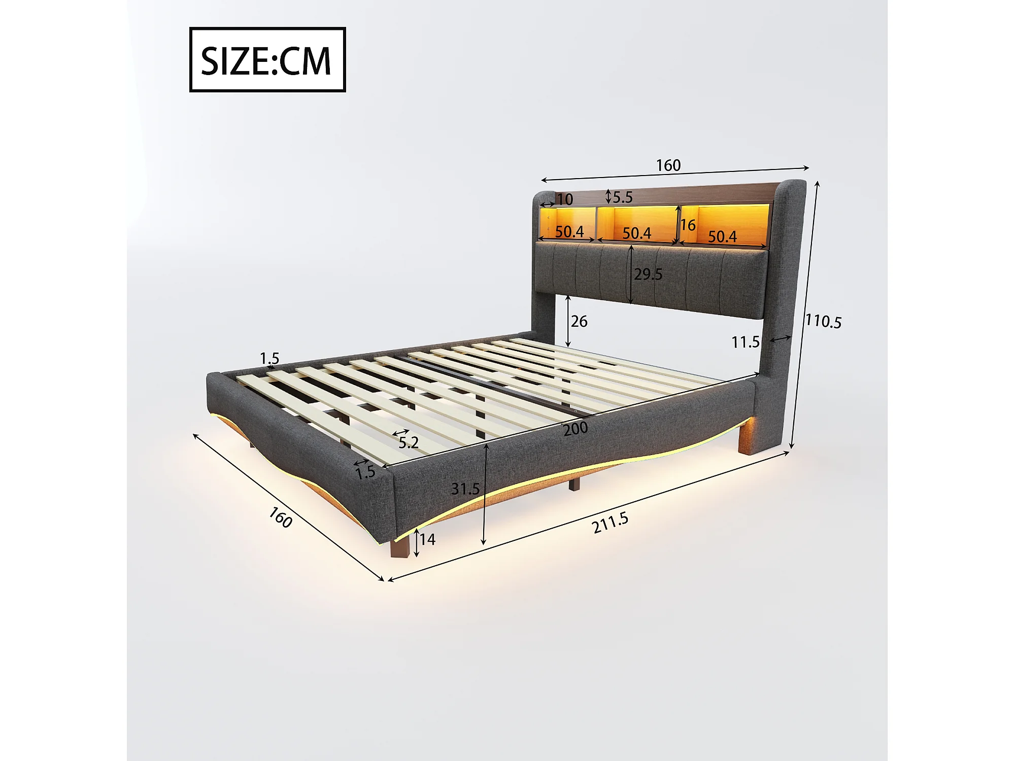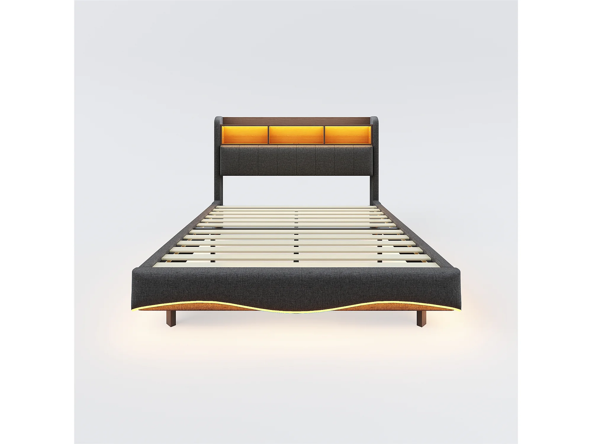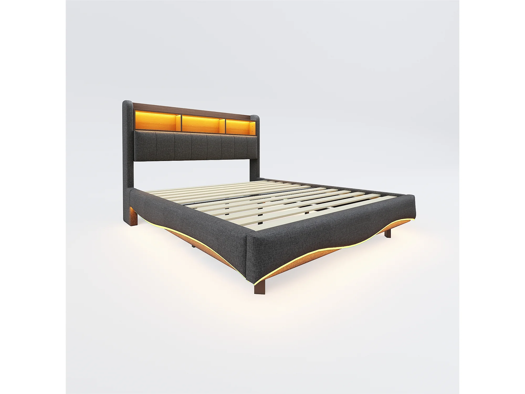 Lit double 160x200 cm, lin gris, lit adulte avec LED et ports USB/Type-C, tête de lit avec rangement