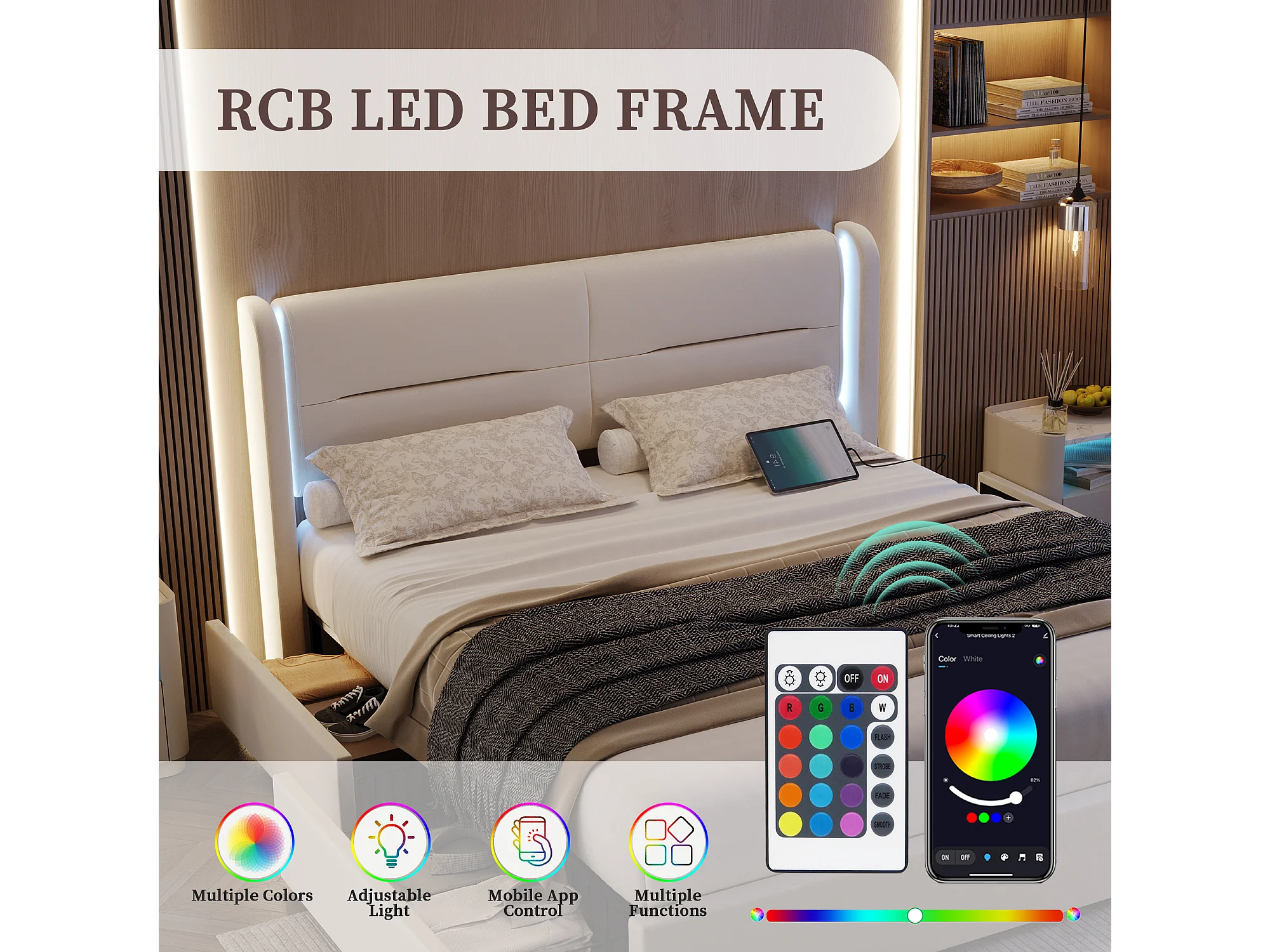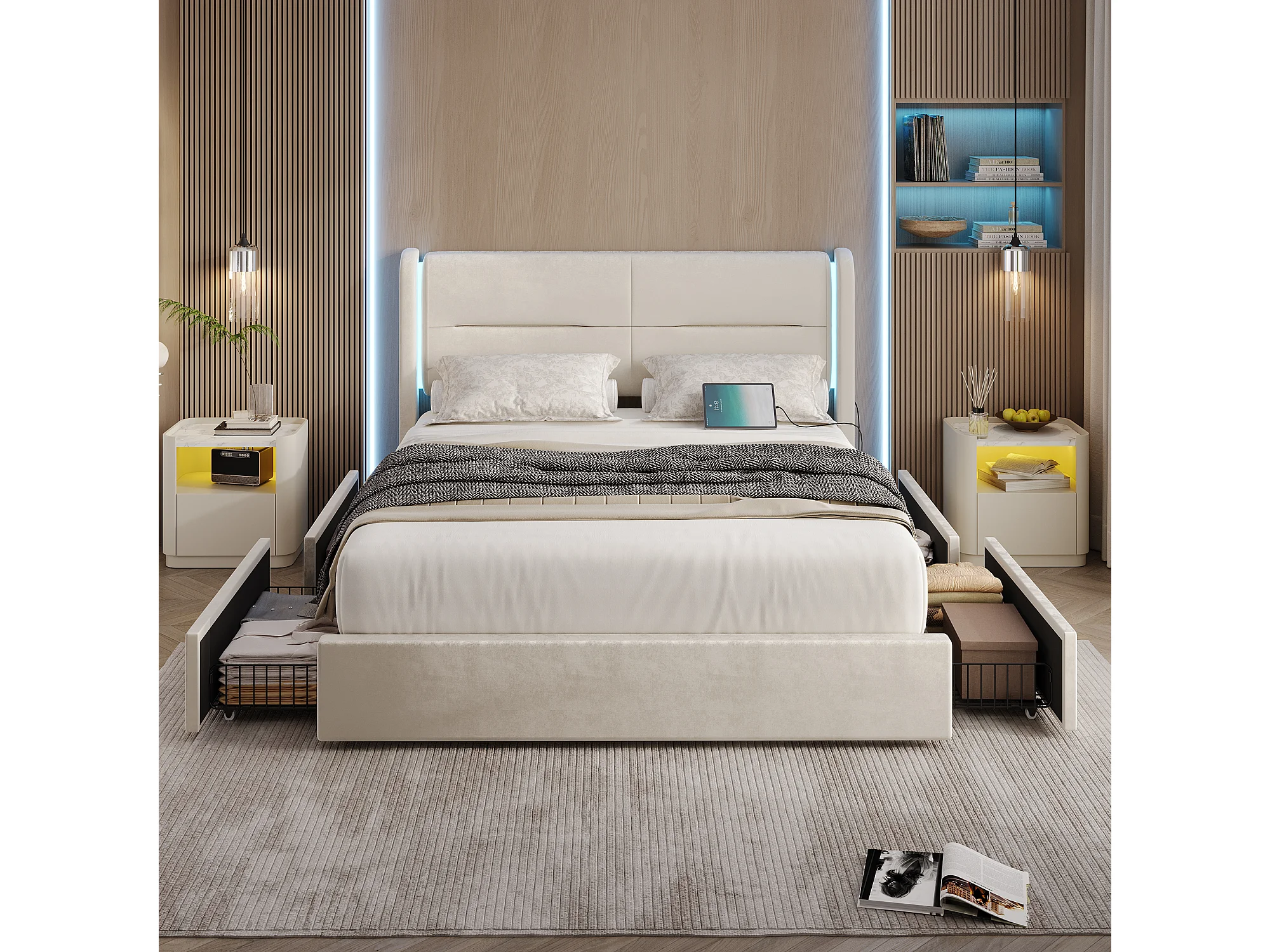Lit Coffre 160×200 cm - Lit Rembourré en Velours Beige – Tête de Lit LED – 4 Tiroirs – Ports USB/USB‑C – Style Contemporain