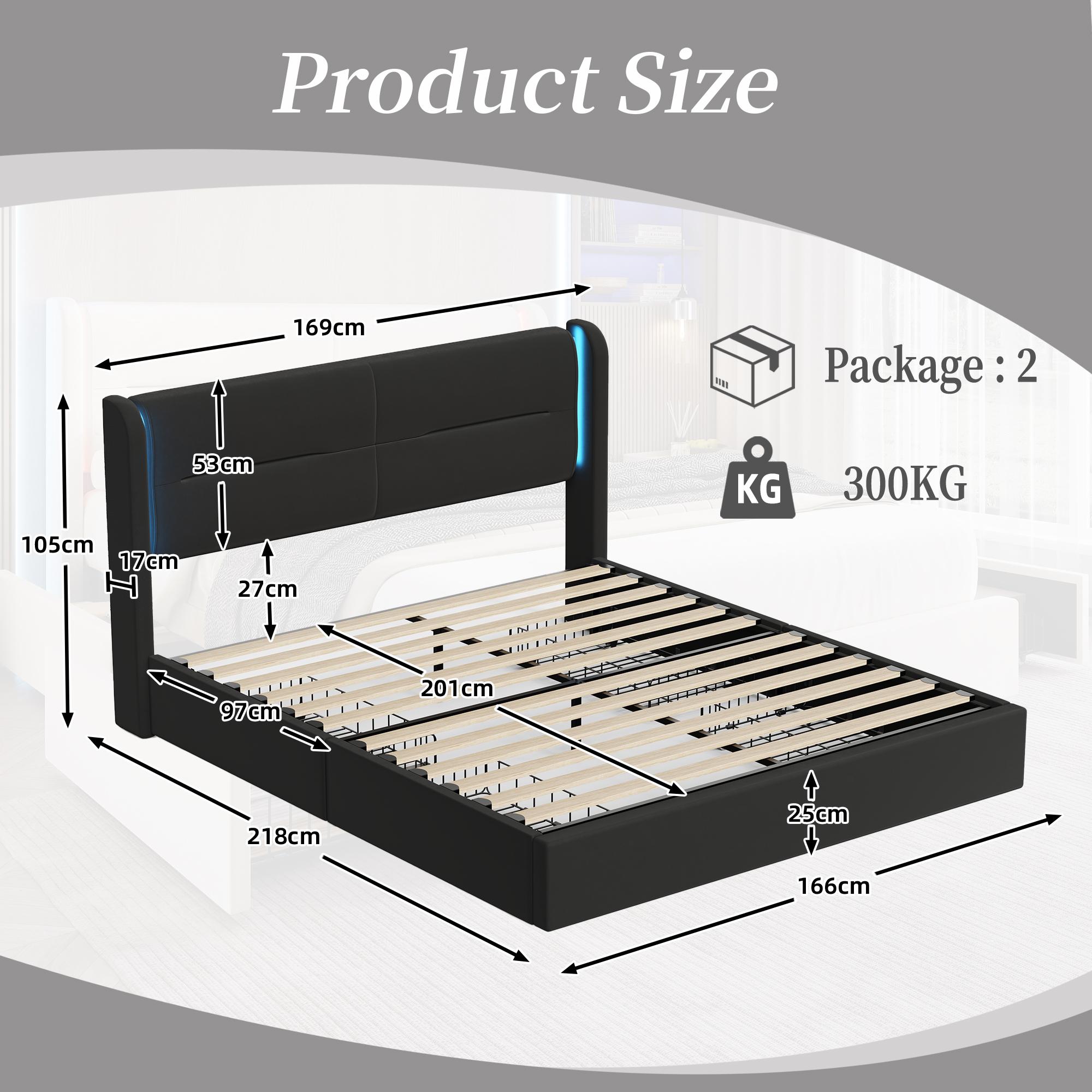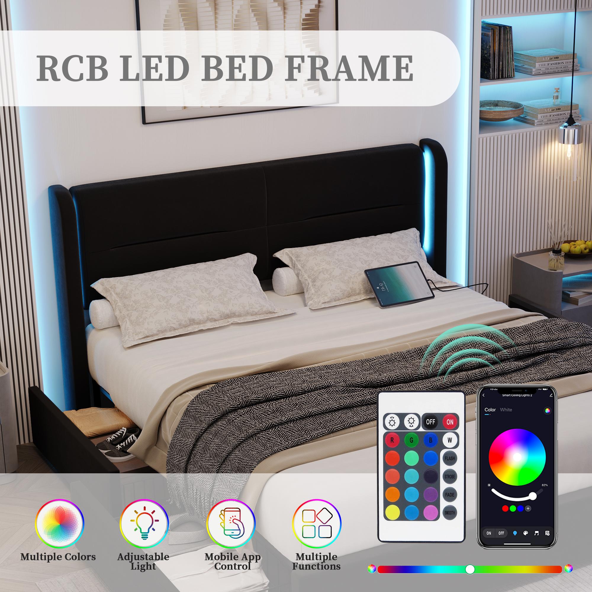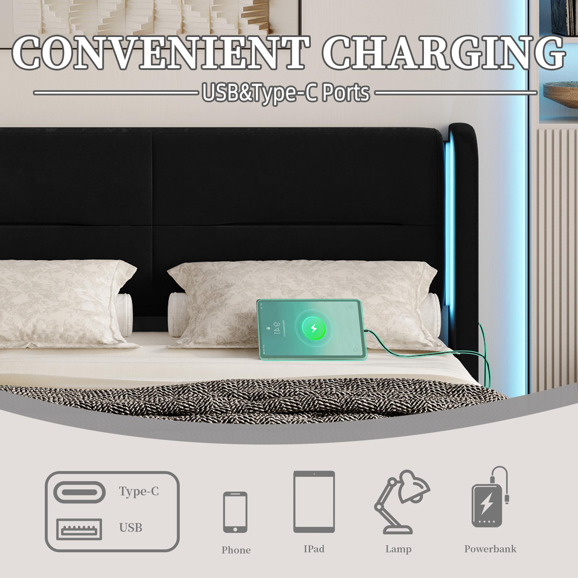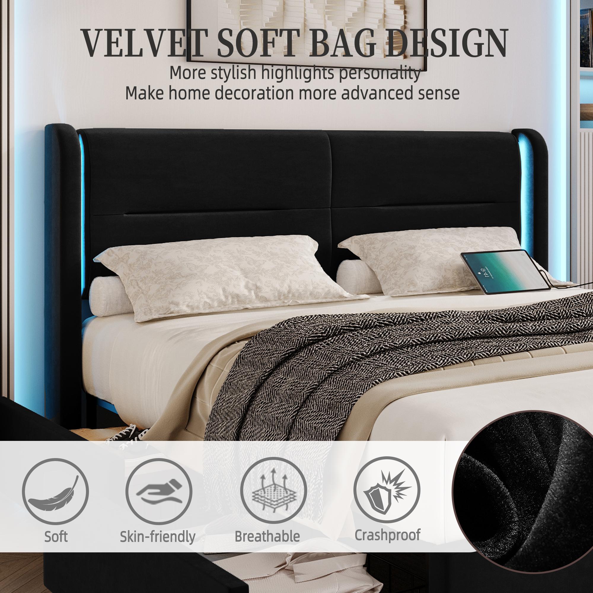 Lit Coffre 160×200 cm - Lit Rembourré en Velours Noir – Tête de Lit LED – 4 Tiroirs – Ports USB/USB‑C – Style Contemporain