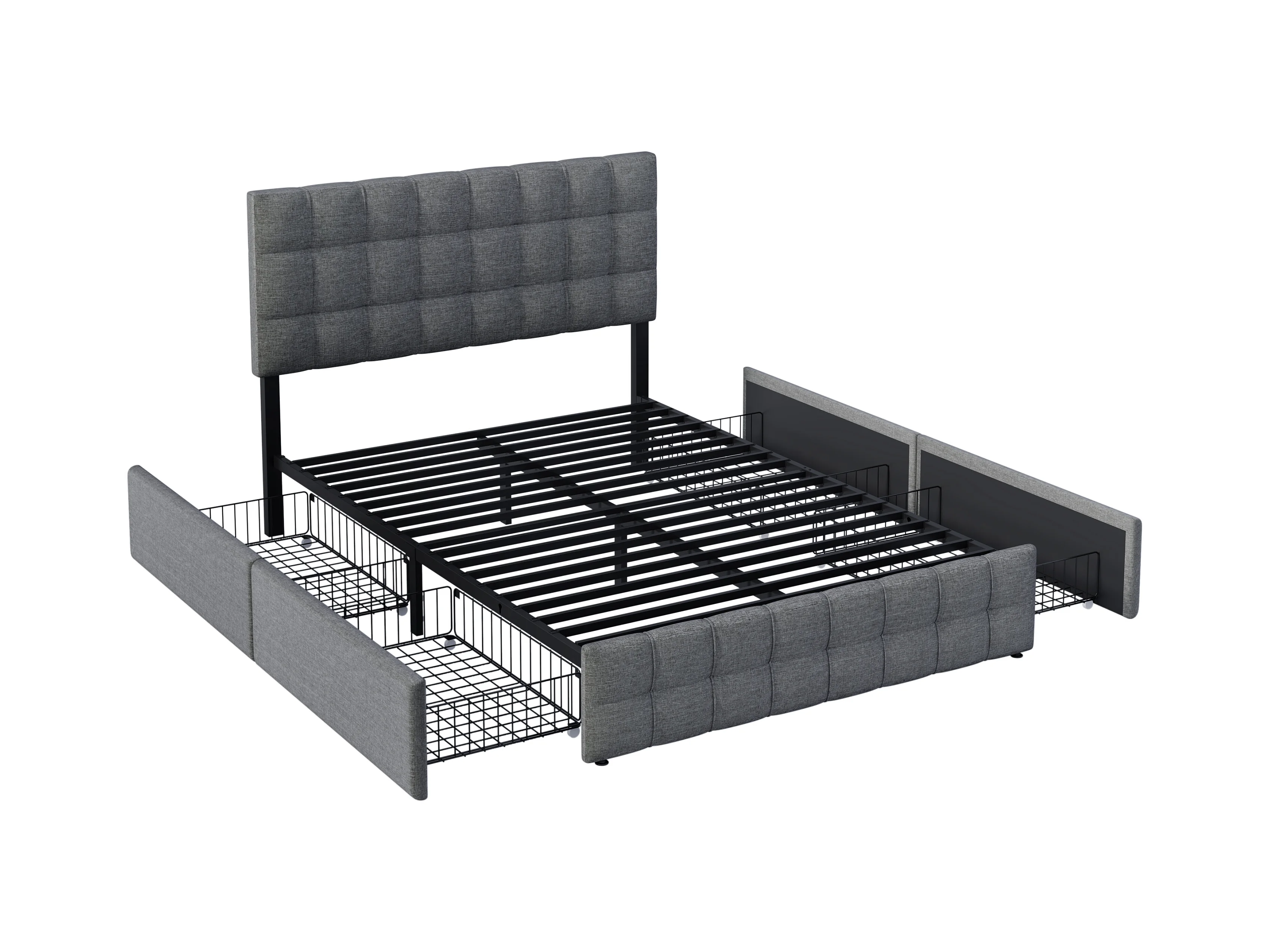 Lit double 140x200 cm avec sommier - tête de lit réglable en hauteur et 4 tiroirs - cadre métallique - lin gris (sans matelas)