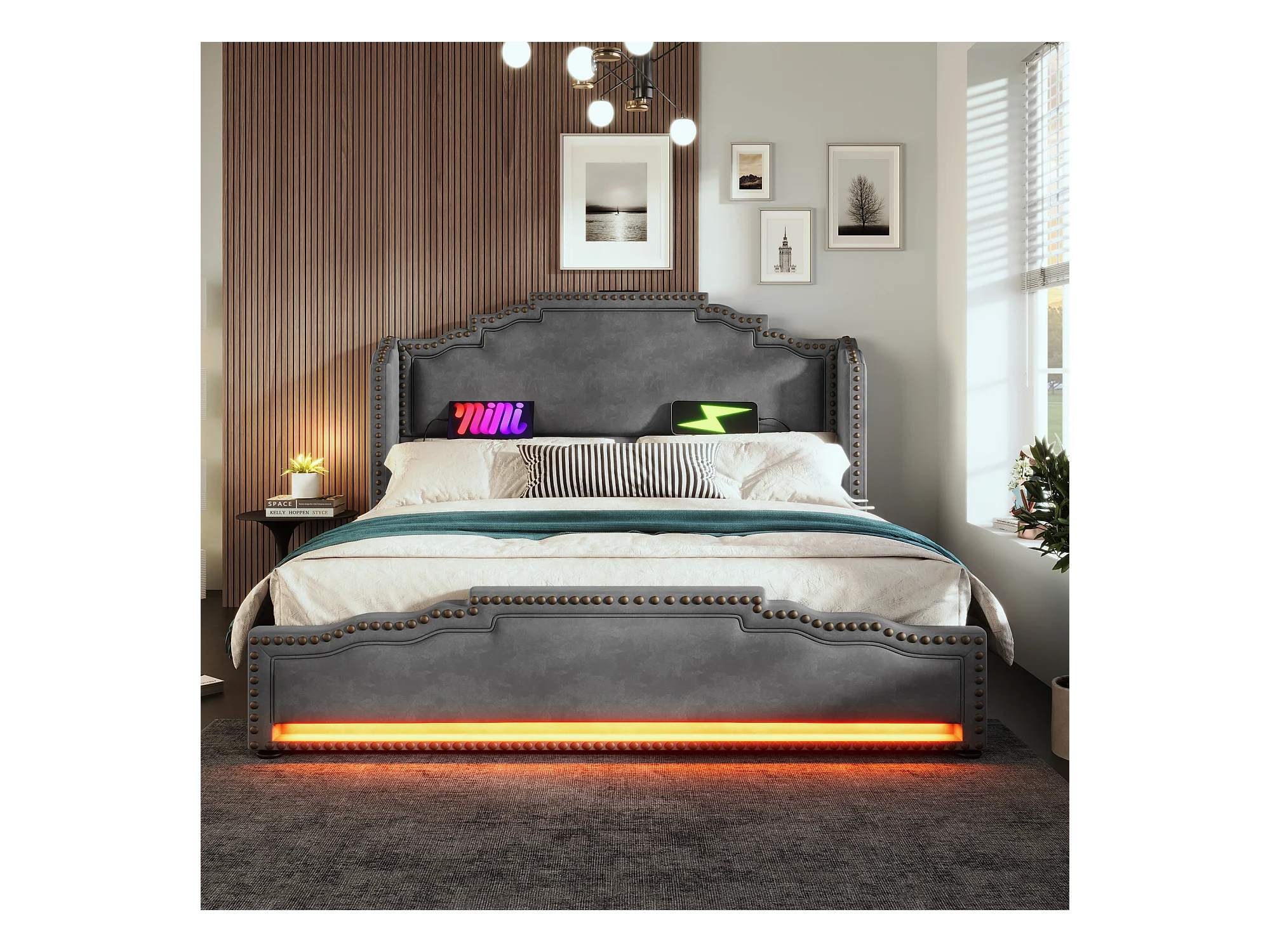 Lit double adulte 140x200, en velours gris avec LED multicolore et 4 tiroirs(sans matelas)