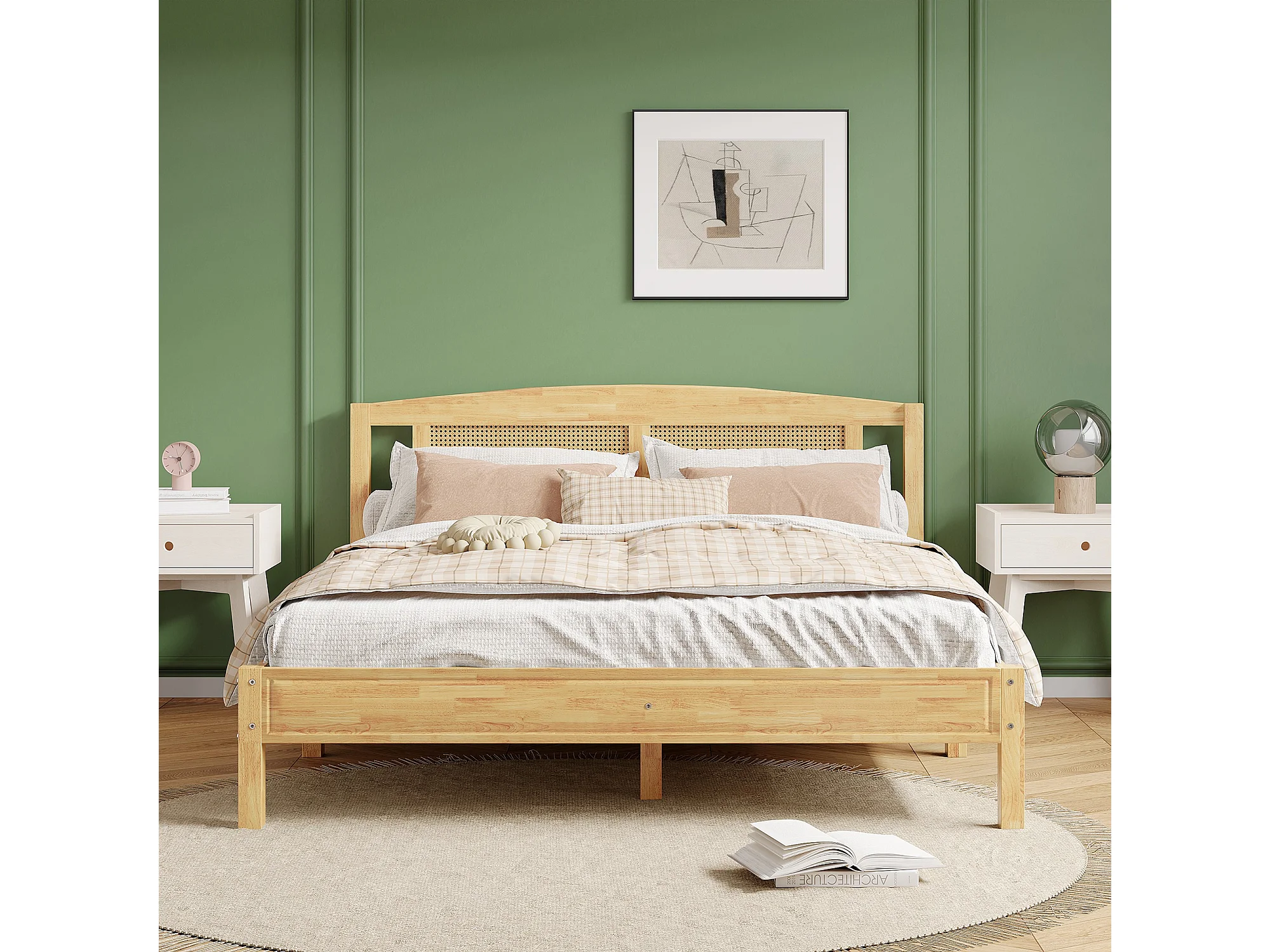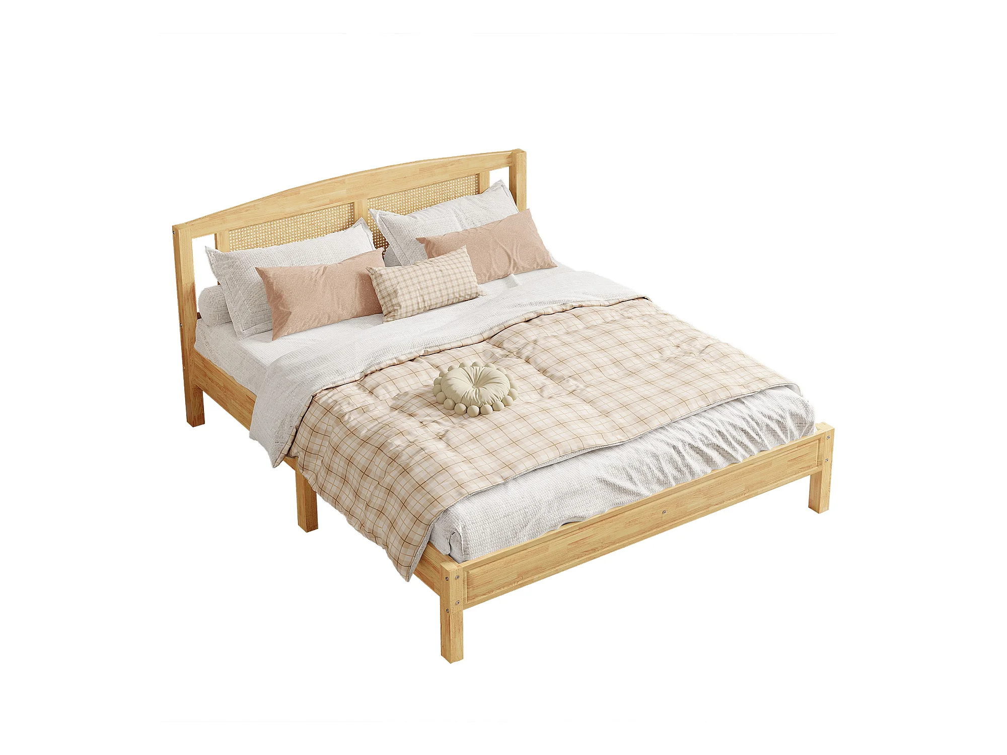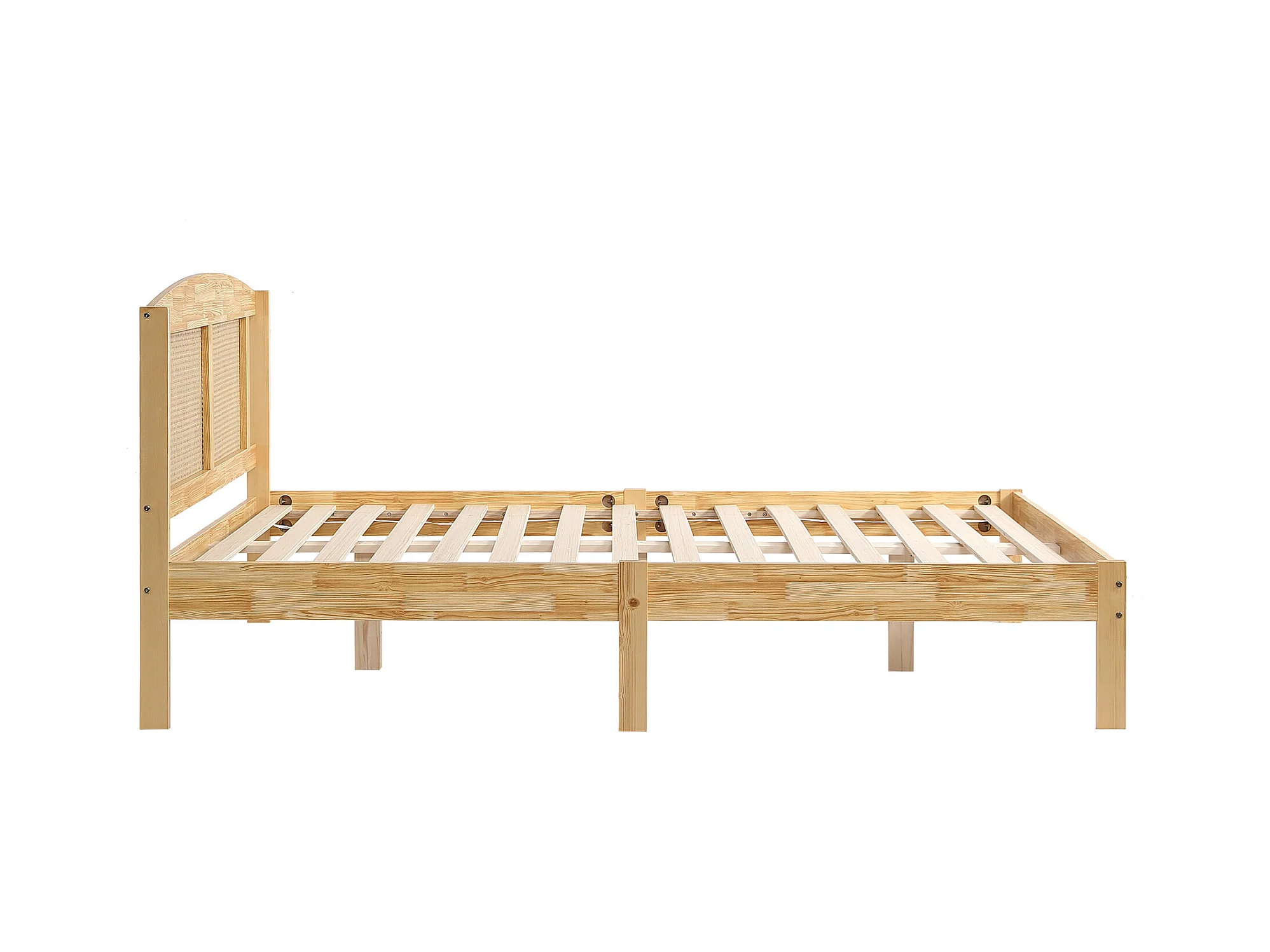 Lit double adulte 160x200 cm, lit en rotin, matelas en rotin avec 15 lattes et pied central, couleur naturelle