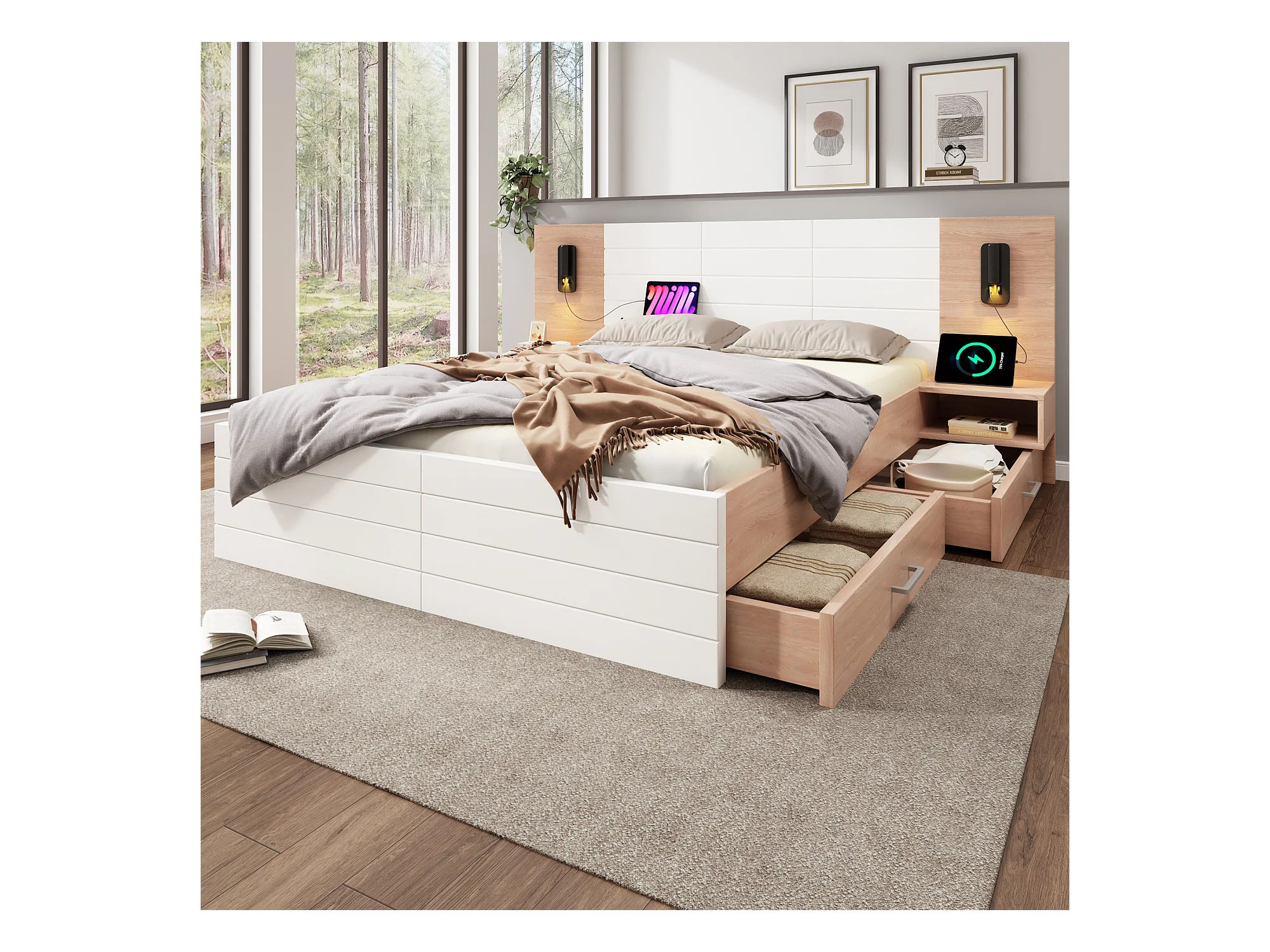 Lit double avec 2 tiroirs et éclairage LED 16 couleurs, en bois massif et MDF, avec 2 tables de chevet, gris et chêne clair (160x200 cm)