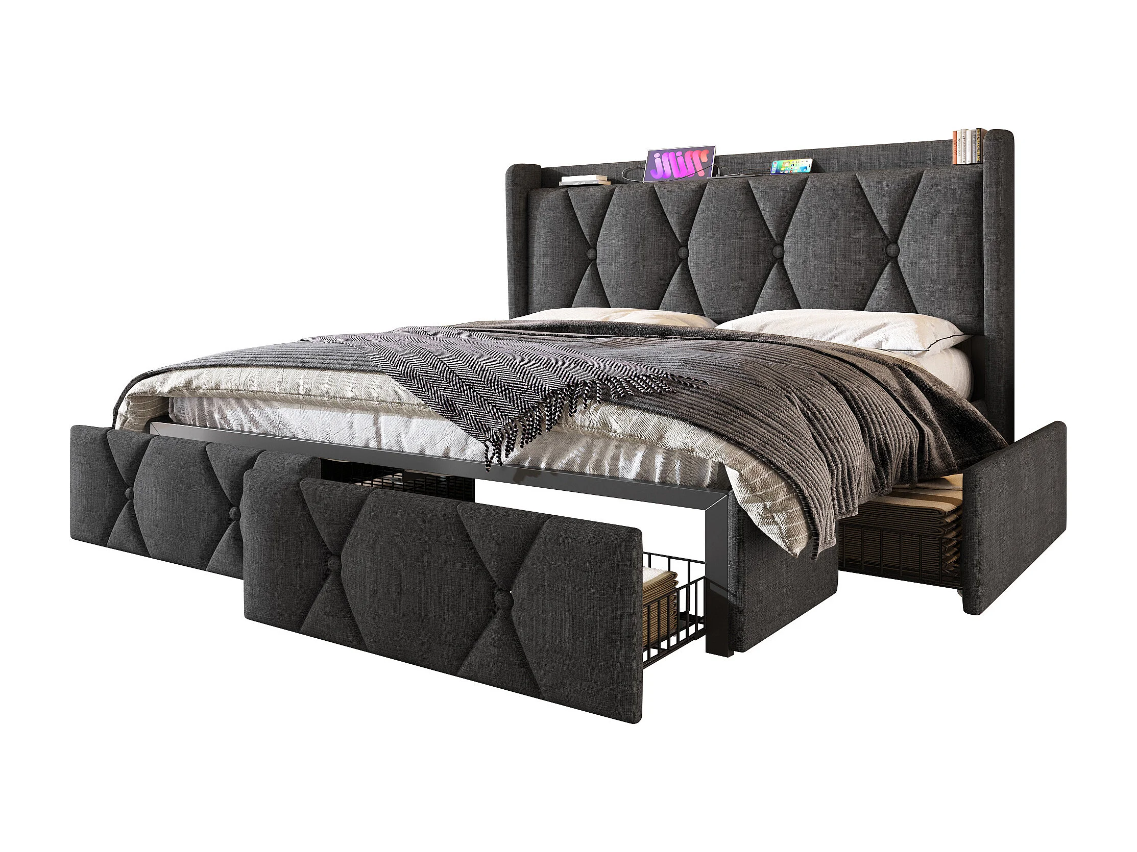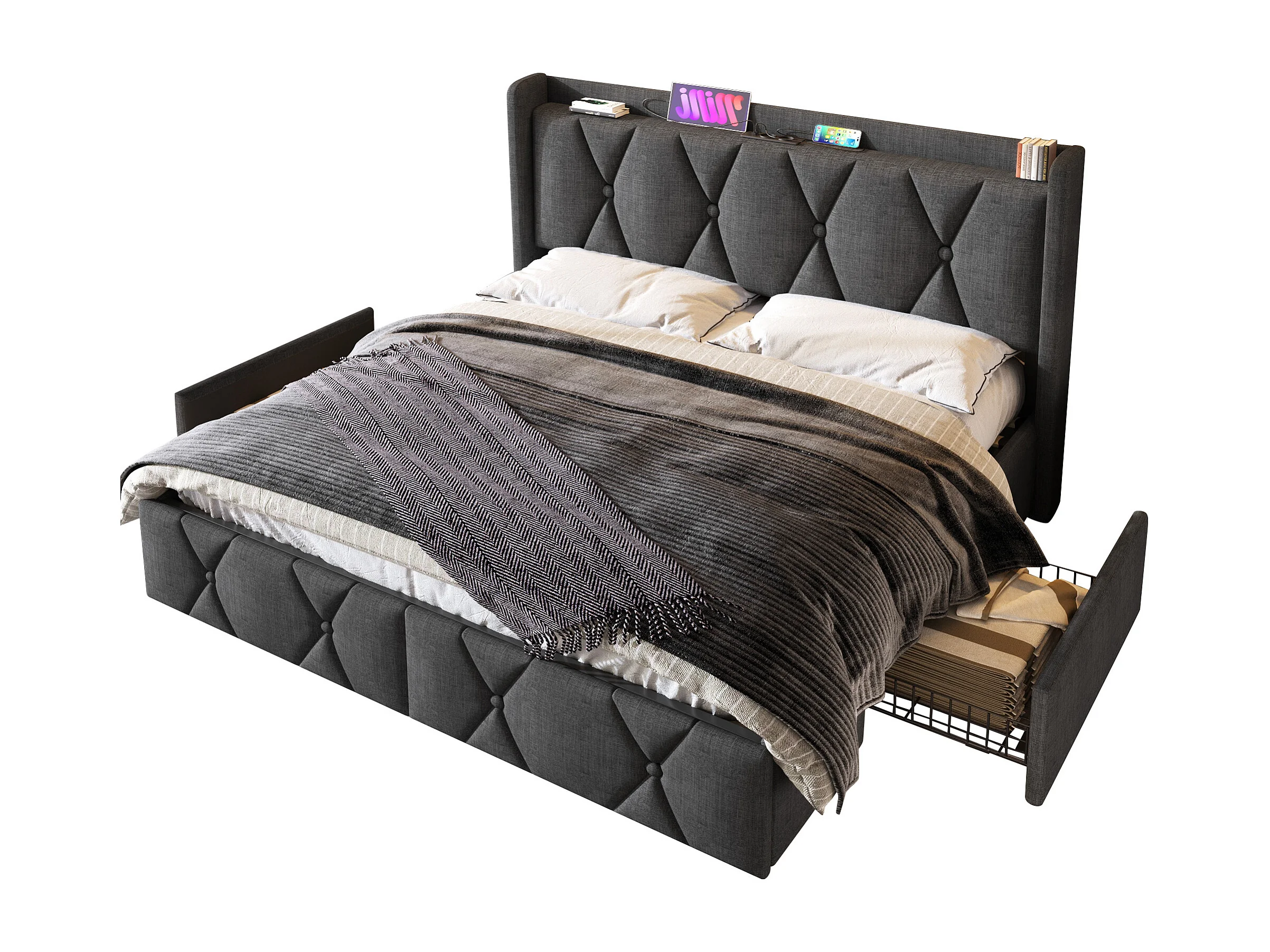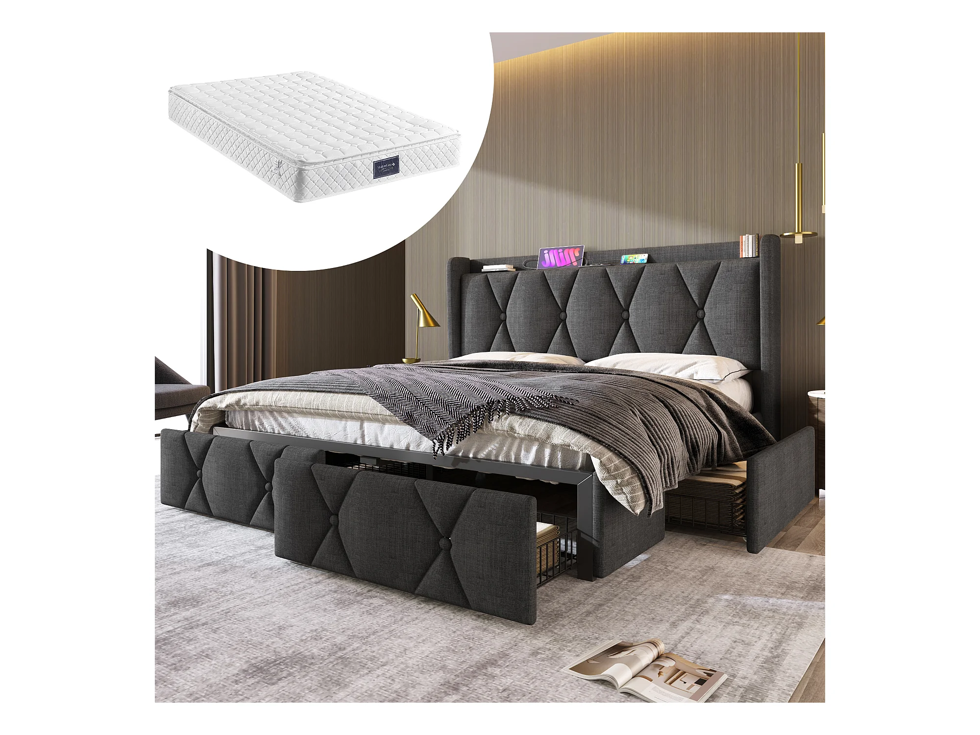 Lit double avec 4 tiroirs, chargeur USB intégré, lin gris, cadre avec sommier bois (149x217x116cm)