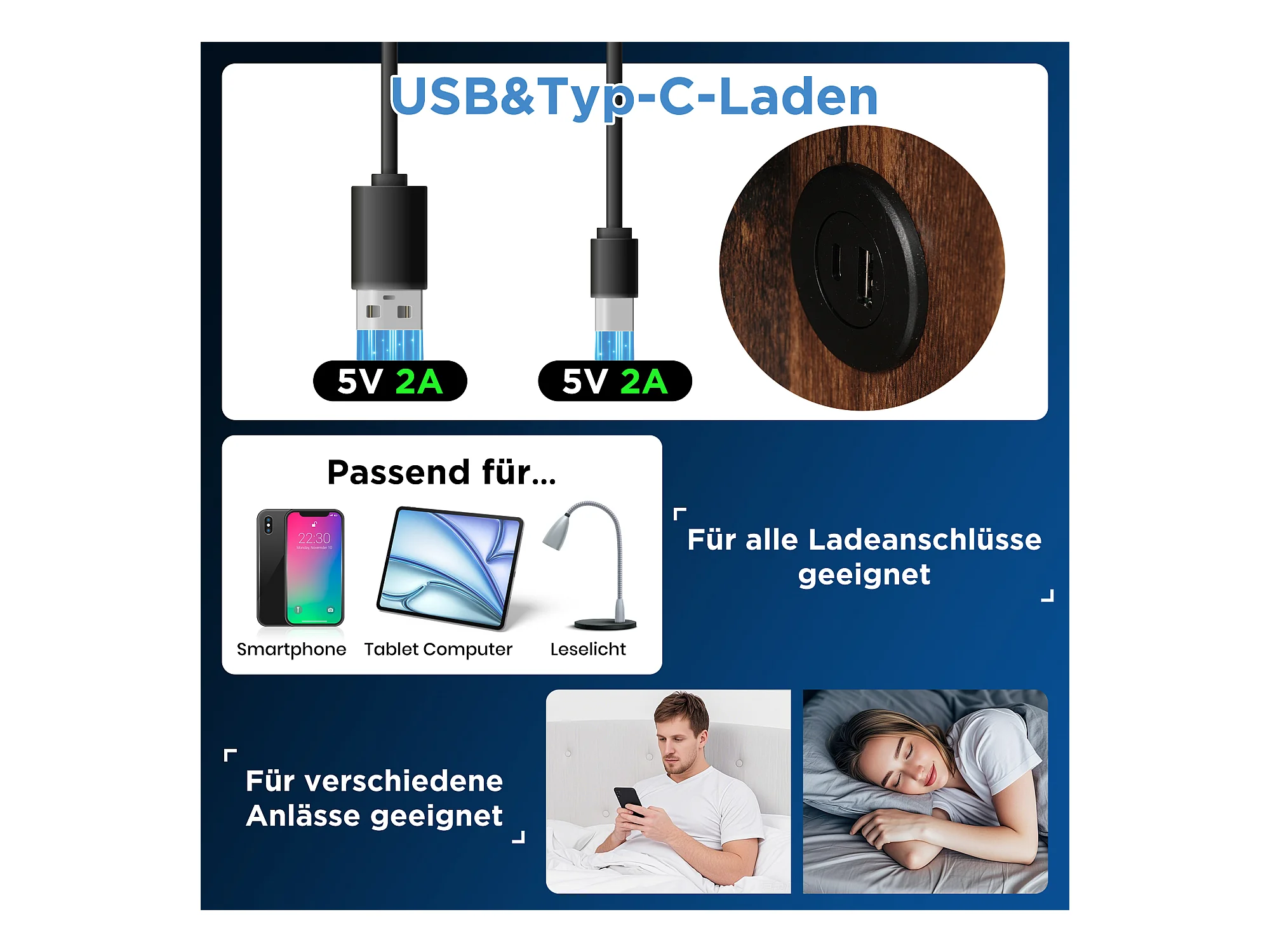Lit double avec chargeur sans fil USB-C, cadre tapissé coton gris, rangement intégré, 180x200cm (206x185x100.5cm)