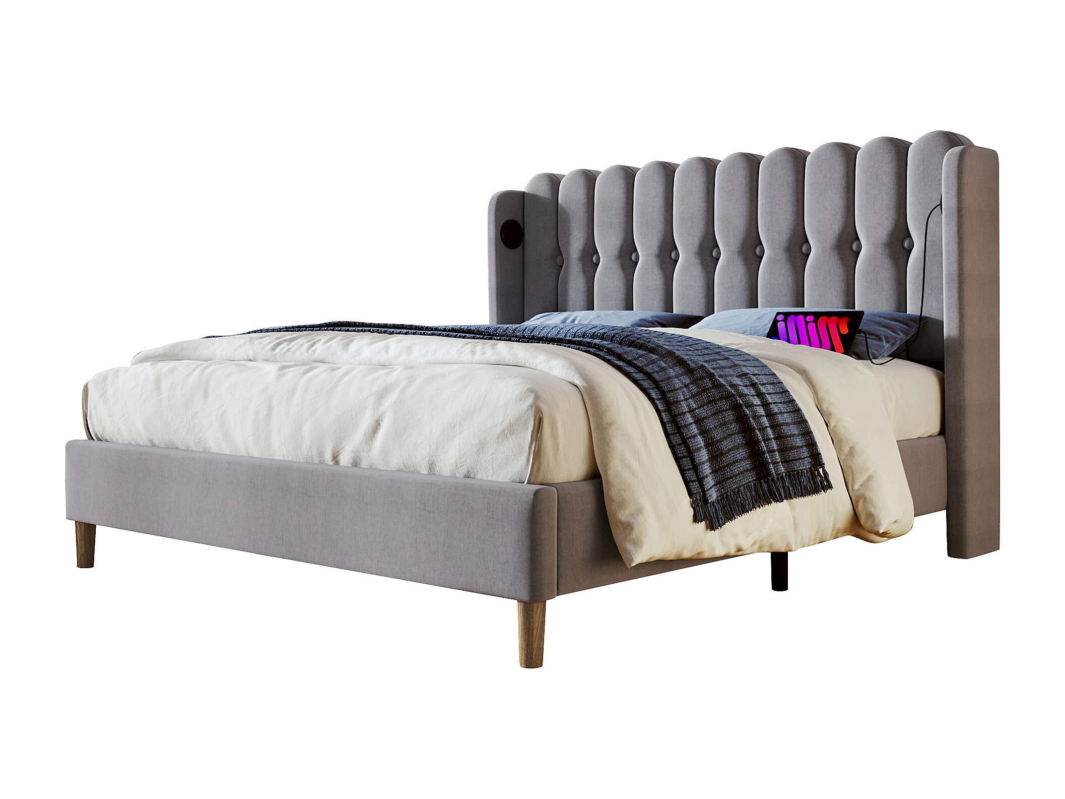 Lit double avec fonction charge USB Type C, cadre en lin gris, sommier bois, 160x200cm